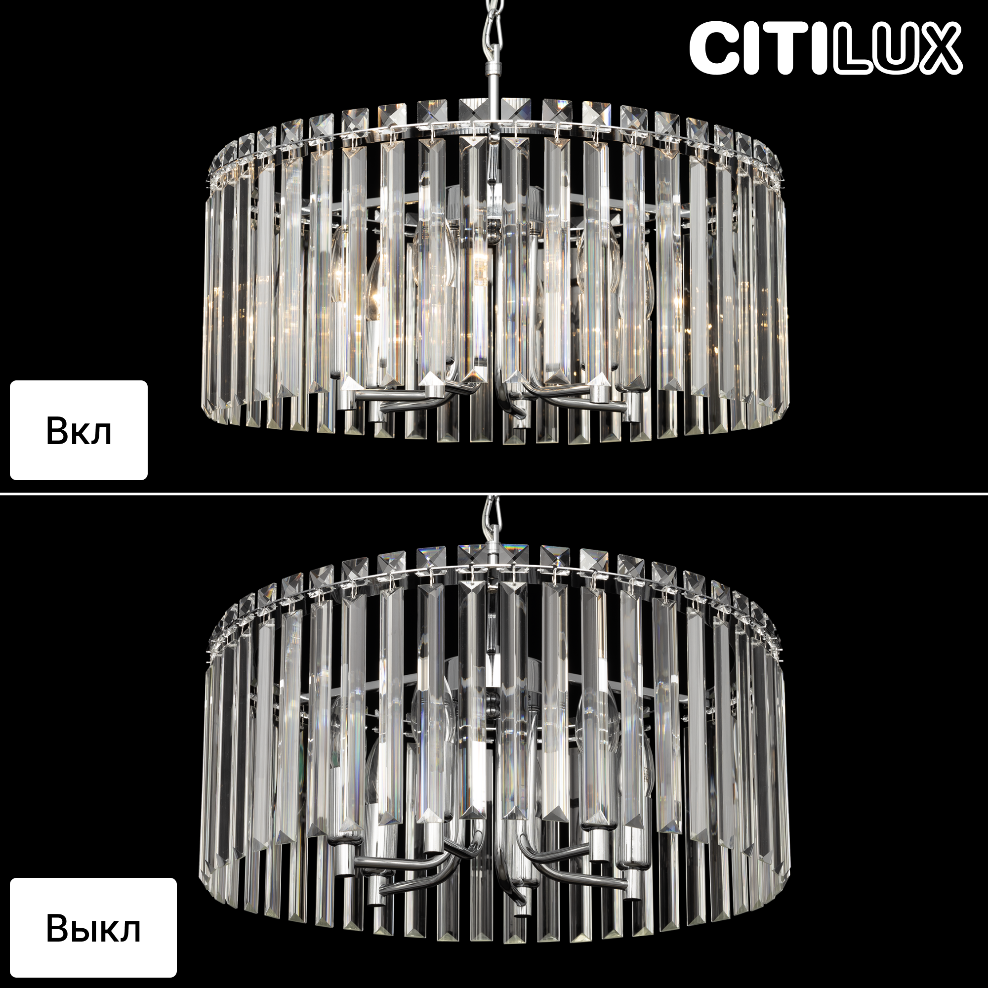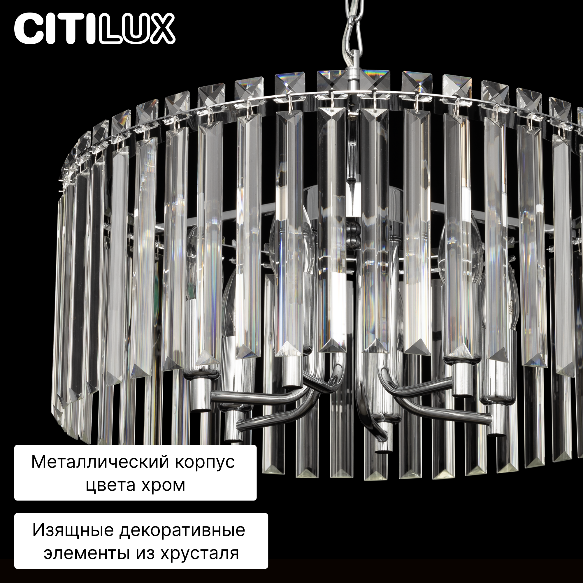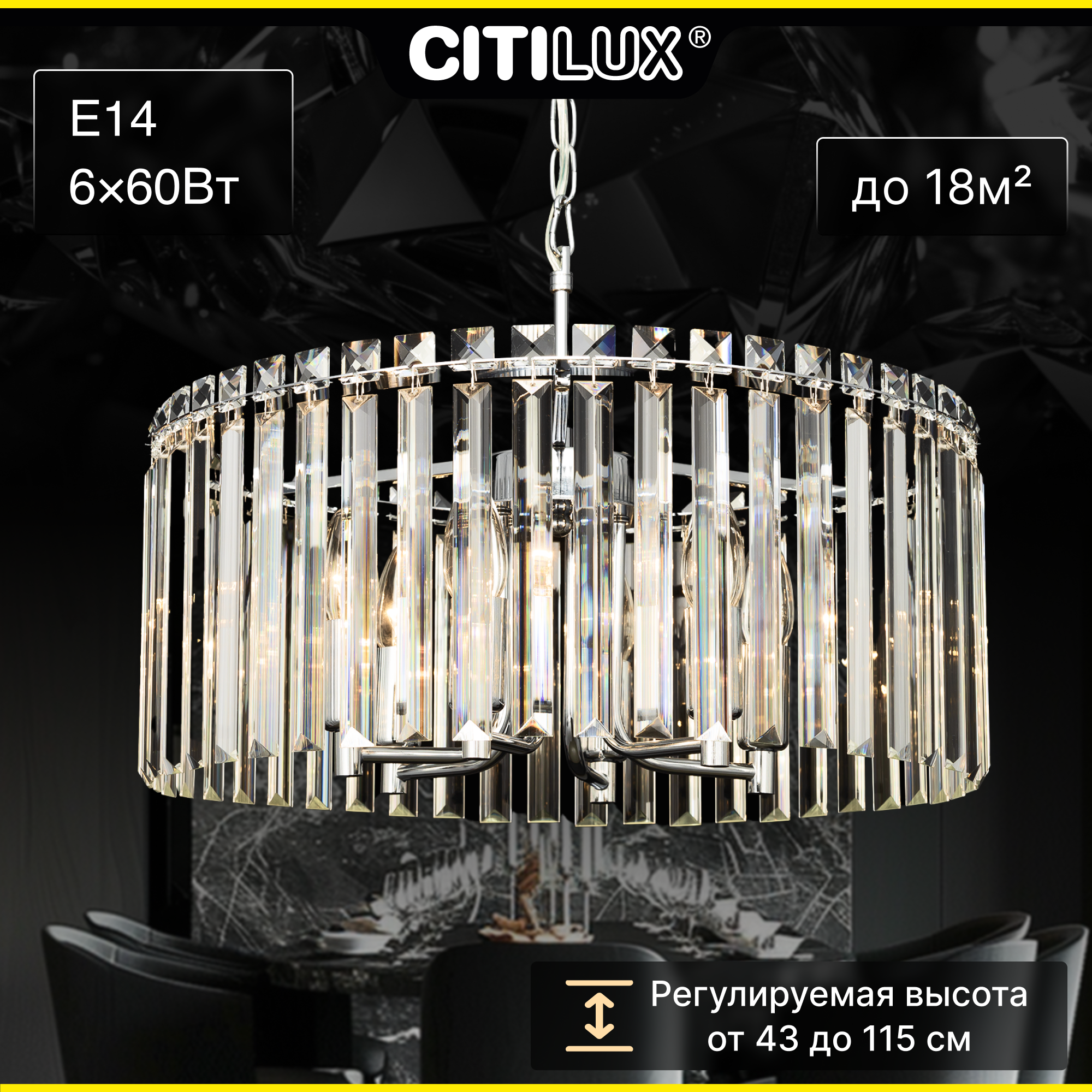 Подвесная хрустальная люстра Citilux Джейн выполнена в стиле современной классики. Корпус светильника металлический круглой формы, цвет глянцевый хром. Подвески хрустальные, кристально прозрачные с модной огранкой.В изделии 6 ламп с цоколем Е14 максимальной мощностью для ламп накаливания 60Вт (в комплект не входят, приобретаются отдельно). Люстра подходит для основного и дополнительного освещения помещений как с высокими, так и с низкими потолками, длина цепи регулируется при установке, тип крепления – планка.Изящная подвесная люстра Ситилюкс Джейн потрясающе выглядит в модных интерьерах стильных современных квартир, студий, апартаментов и уютных загородных домов. Ярко осветит гостеприимную кухню, аккуратную спальню, небольшую столовую и строгий кабинет. Поможет легко создать атмосферу изысканности в популярных кафе и ресторанах.