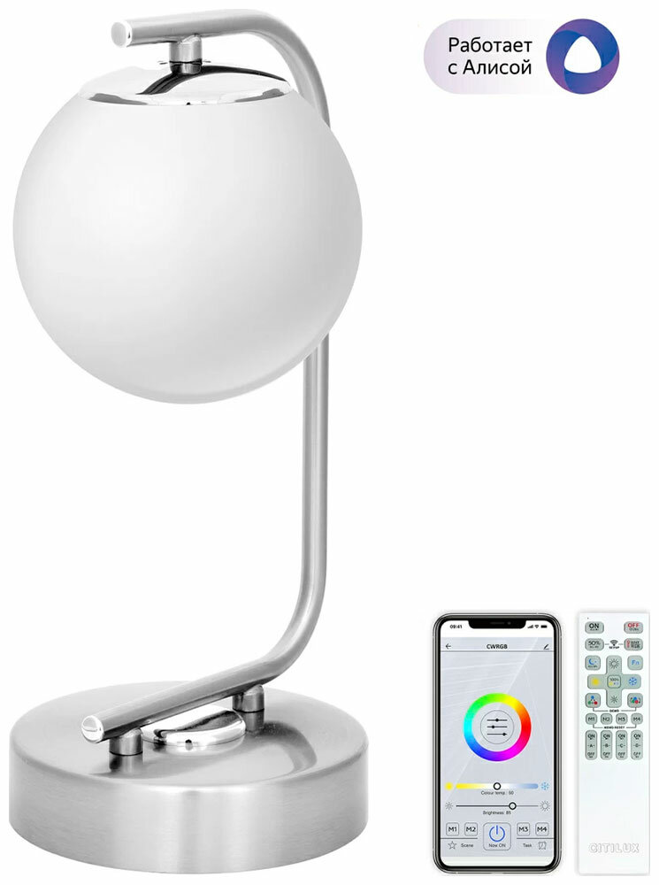 Светильник настольный светодиодный Citilux Адам Смарт RGB выполнен в современном стиле. Корпус металлический, цвет хром матовый. Плафон в форме шара, изготовлен из оптического полимера, цвет белый матовый. Внутри плафона расположена уникальная светодиодная панель, обеспечивающая яркое основное освещение или красочную RGB подсветку (для управления цветной подсветкой нужен пульт). Мощность 14Вт, световой поток 1500Лм. Предустановлено 4 режима освещения, управление выключателем.* Опционально: управляется радиопультом дистанционного управления Citilux CLR5G (НЕ входит в комплект, приобретается отдельно или в комплекте с другими светильниками экосистемы Citilux);При наличии пульта (НЕ входит в комплект): можно настроить светильник и сделать его умным. Используя сеть Wi-Fi, при наличии интернет-соединения, доступно полноценное управление всеми режимами работы светильника из приложения Citilux Smart со смартфона или планшета, а также с помощью голосовых помощников Алиса и Маруся. Можно легко настроить работу по сценариям и расписанию.Цветовая температура лампы настольной прикроватной Ситилюкс Адам Смарт регулируется в диапазоне 3000-4000-5500Кельвин, позволяя настроить любые оттенки теплого, нейтрального или холодного света; два режима работы RGB подсветки; плавная регулировка яркости света; есть режимы памяти и отсроченного выключения. Настольная лампа идеально подойдет для спальни, кухни, в детскую и для зала. Станет отличным подарком на новый год, на день рождения, детям, другу, подруге, родителям, бабушке, дедушке, папе, маме.