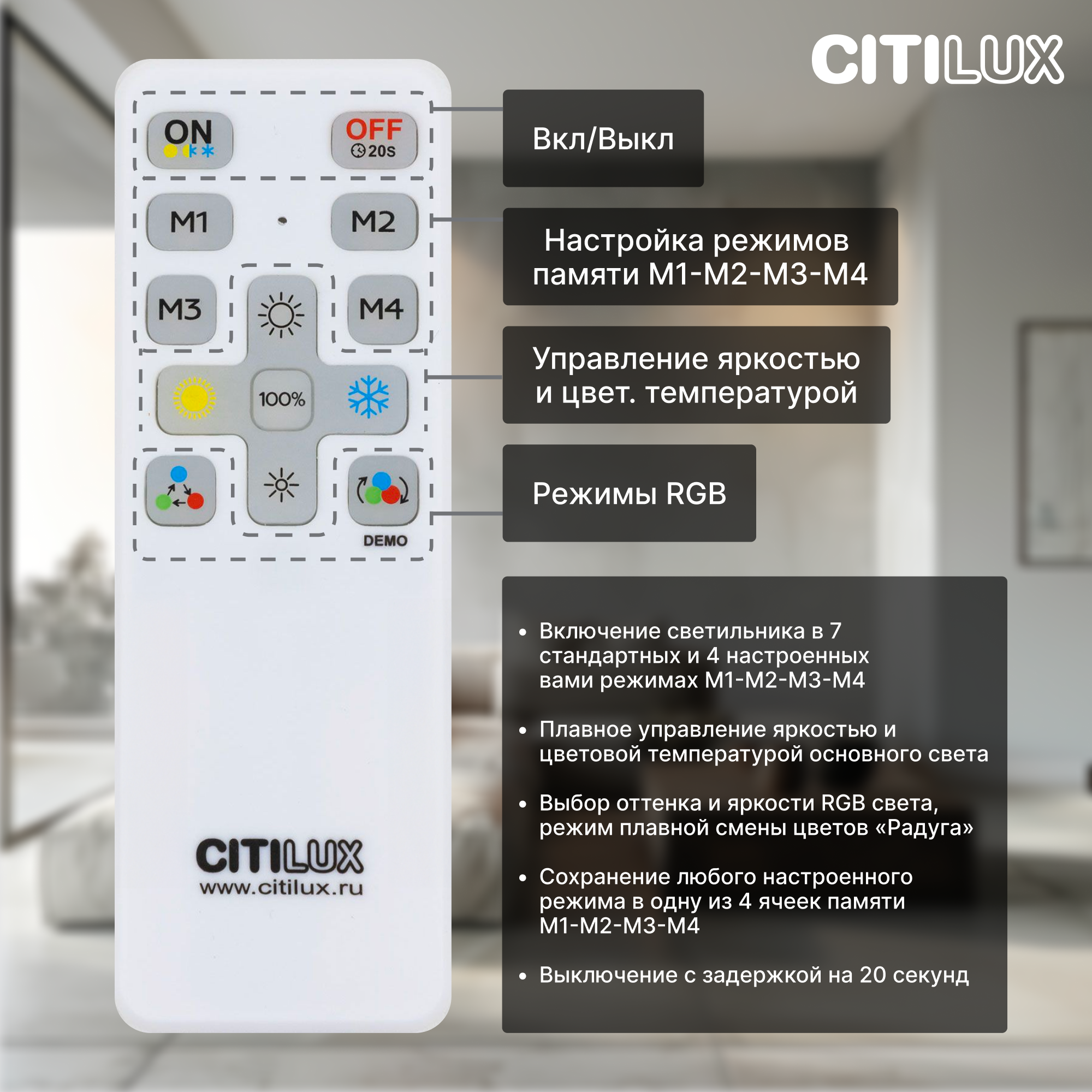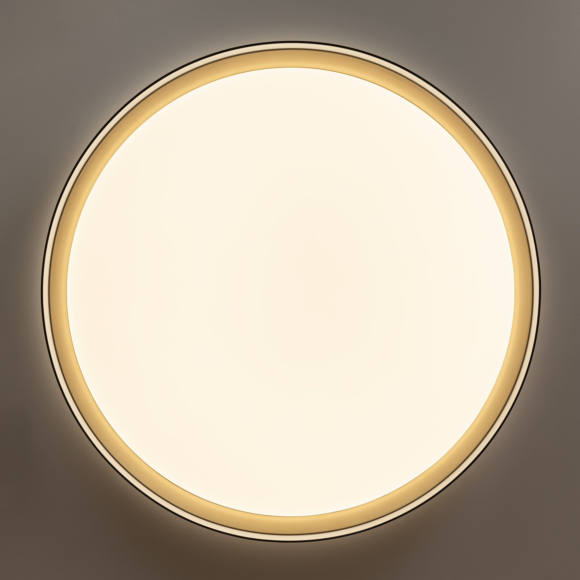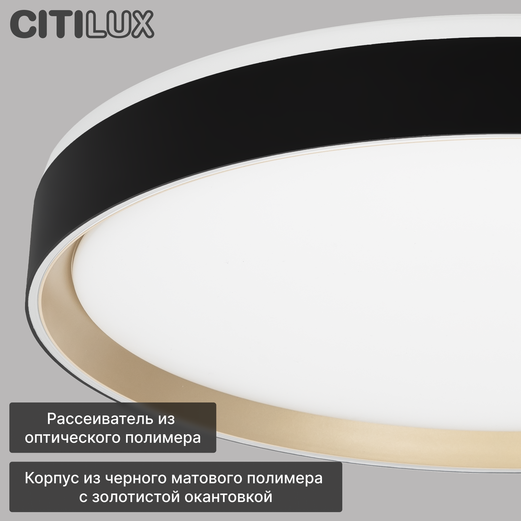 Светодиодный потолочный светильник Citilux BOSS с яркой цветной RGB подсветкой всего плафона. Основание металлическое, корпус из чёрного полимера с декоративным элементом в цвете матовое золото. Благодаря оригинальной конструкции, круглый светильник равномерно освещает помещение и дополнительно подсвечивает потолок, что придаёт пространству дополнительный объём.Мощность изделия 68Вт, световой поток 5800Лм. С помощью пульта дистанционного управления вы сможете плавно регулировать яркость 10% - 100%, менять цветовую температуру в диапазоне 3000K - 5500K, что позволяет настроить любые оттенки теплого, нейтрального или холодного света. Цветная подсветка RGB имеет несколько режимов работы, погружая ваше пространство в яркие и насыщенные тона. Функция таймера - отсроченного выключения и 4 настраиваемых режима памяти позволяют управлять светильником максимально комфортно.Накладной светильник подходит для всех видов потолков, в том числе натяжных. Тип крепления – через основание. Изделие комплектуется инфракрасным пультом ДУ. Для питания пульта применяются 2 батарейки формата ААА, напряжением 1,5V (не входят в комплект).Плоский потолочный светильник Ситилюкс BOSS станет стильным дополнением для интерьера квартиры, студии, загородного дома или дачи. Легко обеспечит равномерное и мягкое освещение таких помещений, как гостиная, спальня, столовая, кухня или рабочий кабинет. Благодаря высокому качеству, оригинальному дизайну и простоте использования, эта модель будет долго приносить радость своему обладателю.