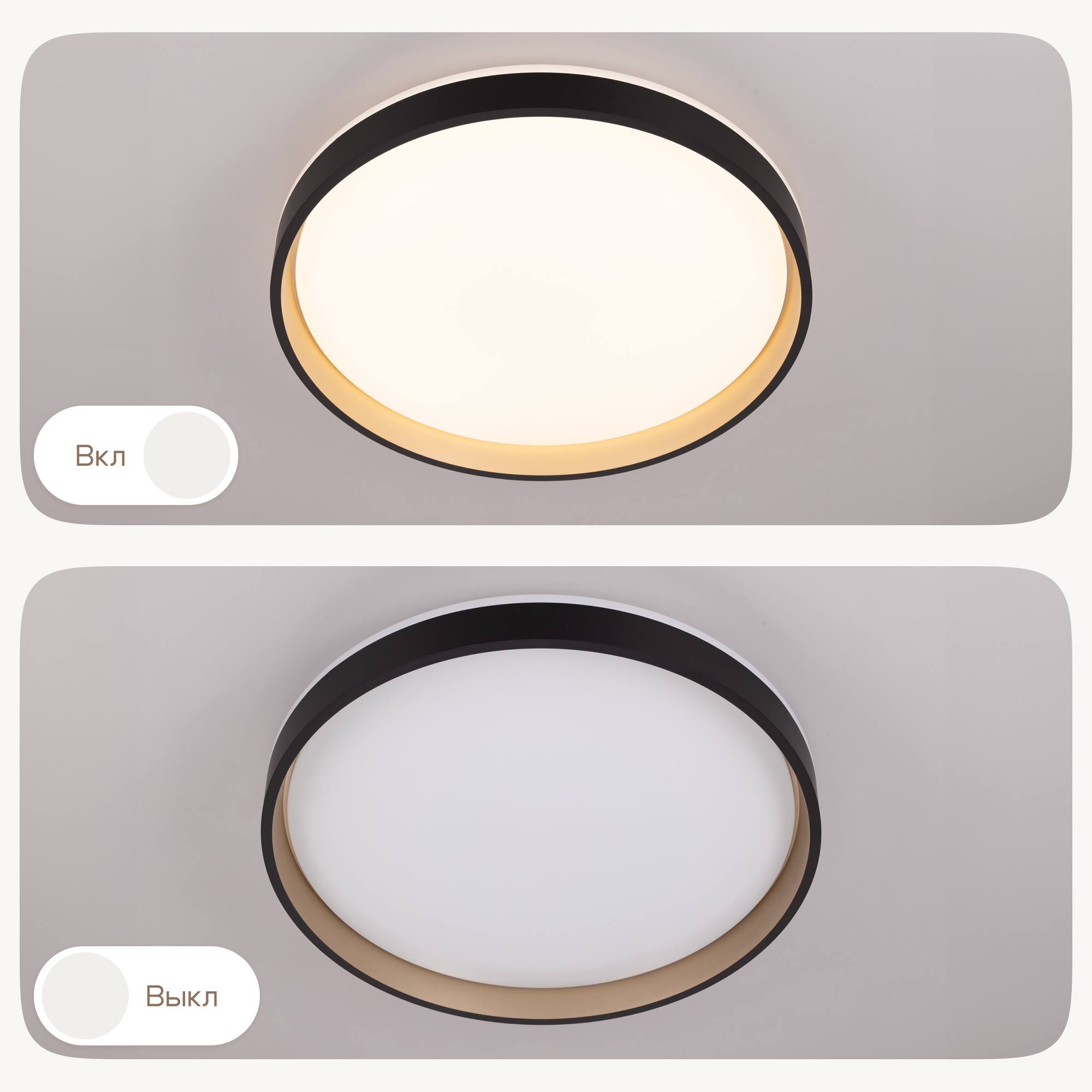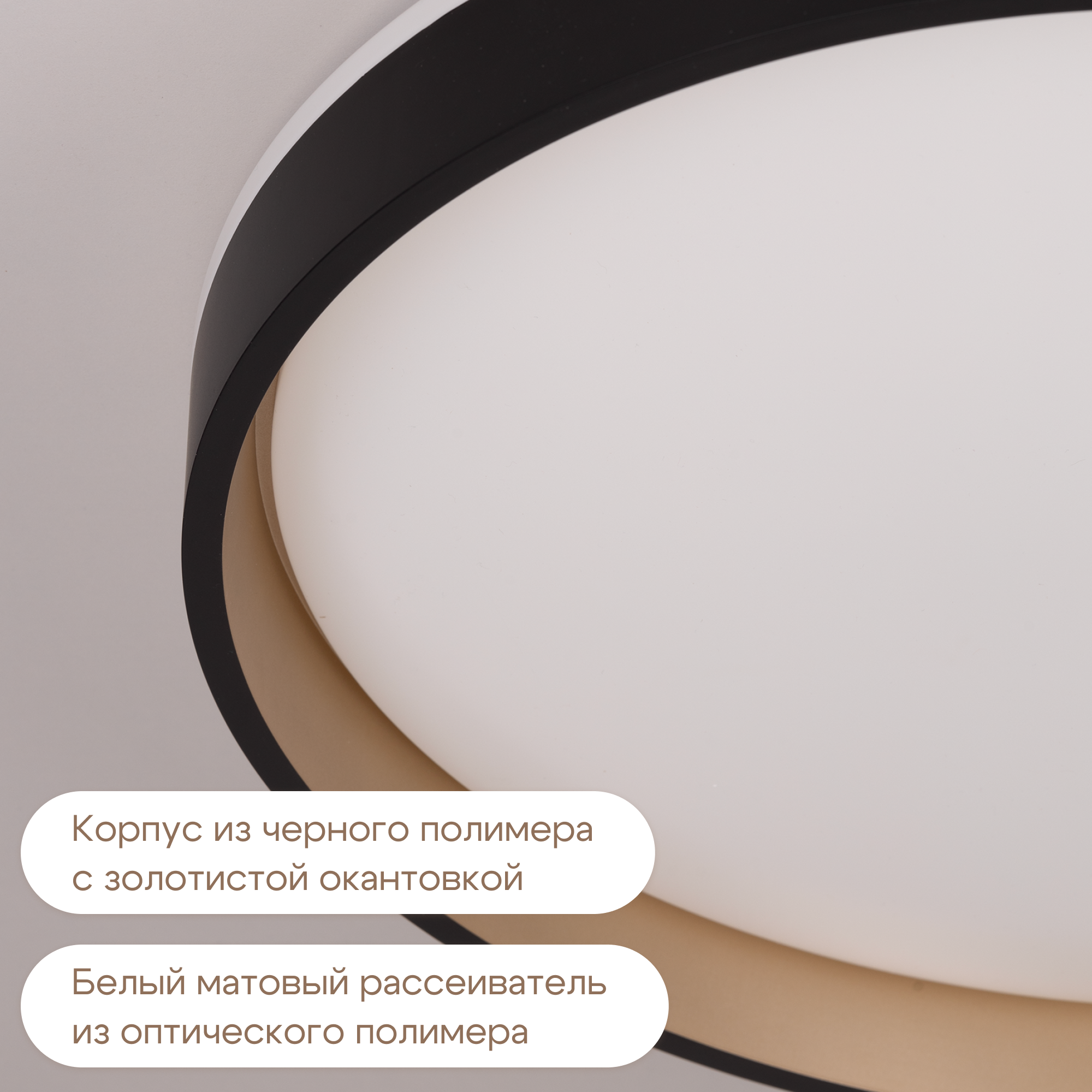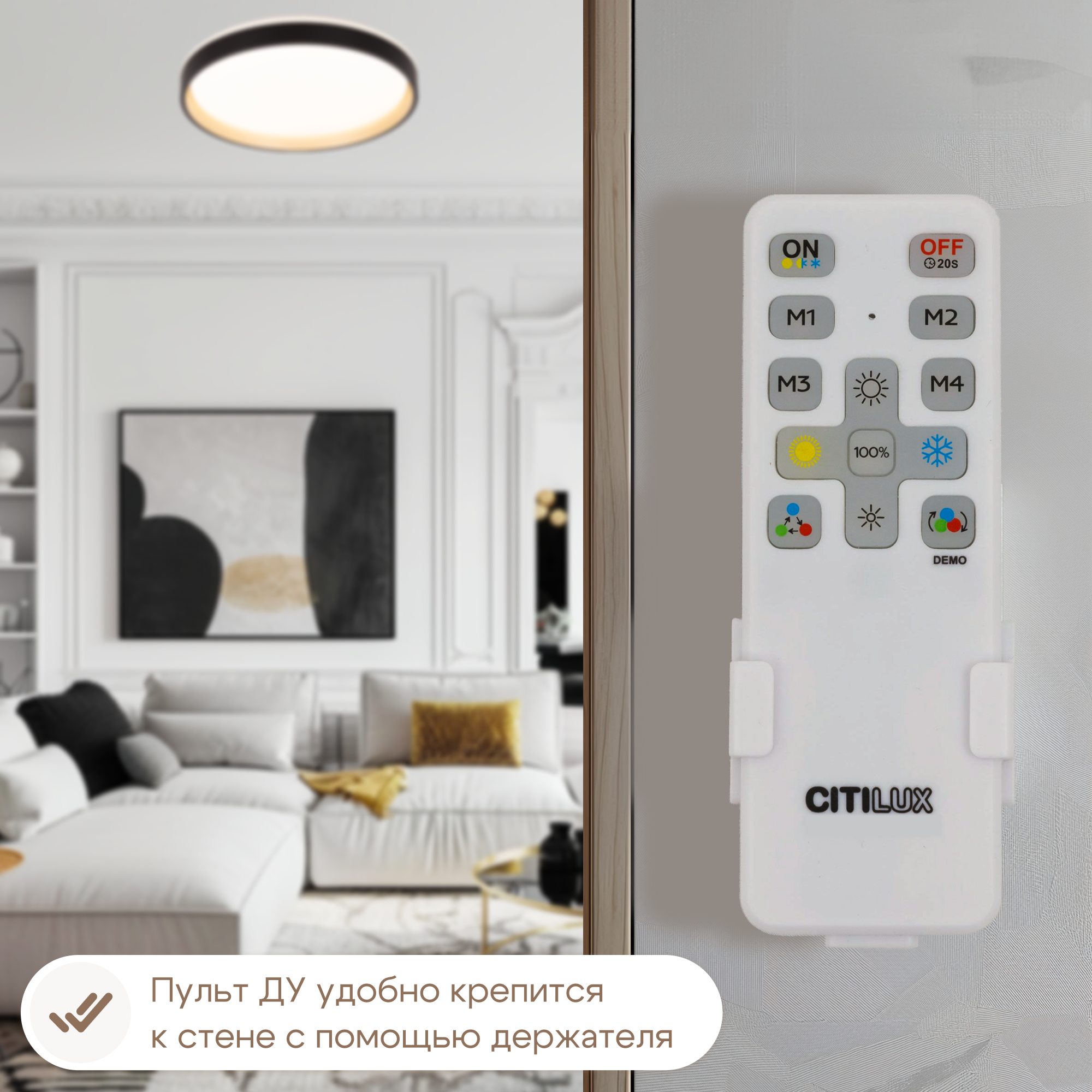 Светодиодный потолочный светильник Citilux ENZO с яркой цветной RGB подсветкой выполнен в современно стиле. Основание металлическое. Плафон круглой формы из прочного полимера чёрного цвета с золотой декоративной окантовкой и рассеивателем из оптического полимера. Благодаря оригинальной конструкции, светильник равномерно освещает помещение и дополнительно подсвечивает потолок, что придаёт пространству дополнительный объём.Мощность изделия 68Вт, световой поток 5800Лм. С помощью пульта дистанционного управления пользователь может плавно регулировать яркость 10% - 100%, менять цветовую температуру в диапазоне 3000K - 5500K, что позволяет настроить любые оттенки теплого, нейтрального или холодного света. Цветная многорежимная RGB подсветка может наполнить пространство яркими и насыщенными цветами. Функция таймера и 4 настраиваемых режима памяти позволяют управлять светильником максимально комфортно.Накладной светильник подходит для всех видов потолков, в том числе натяжных. Тип крепления – через основание. Изделие комплектуется инфракрасным пультом ДУ. Для питания пульта применяются 2 батарейки формата ААА, напряжением 1,5V (не входят в комплект).Плоский потолочный светильник Ситилюкс ENZO станет стильным дополнением для интерьера квартиры, студии, загородного дома или дачи. Легко обеспечит мягкое и равномерное освещение таких помещений, как гостиная, спальня, столовая, кухня или рабочий кабинет. Благодаря оригинальному дизайну, высокому качеству и удобству управления, эта модель будет радовать вас долгие годы.