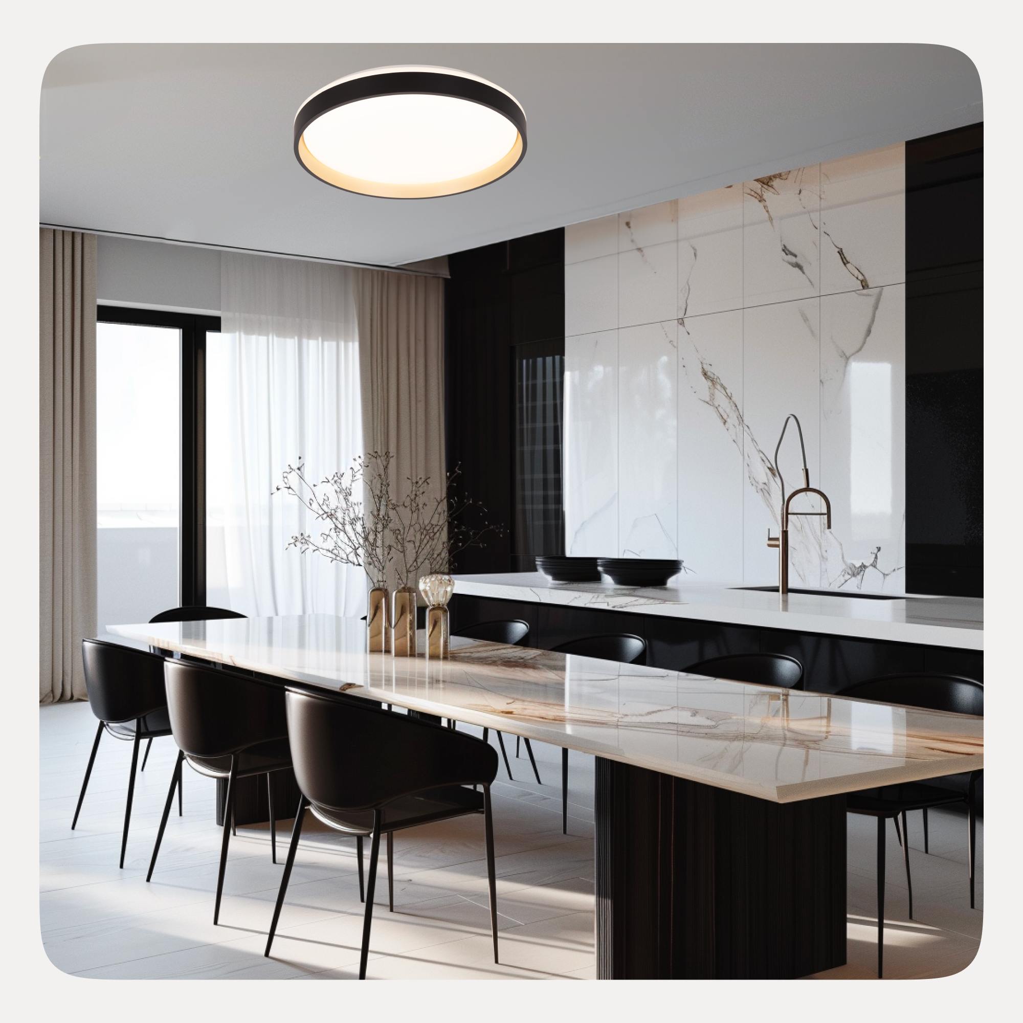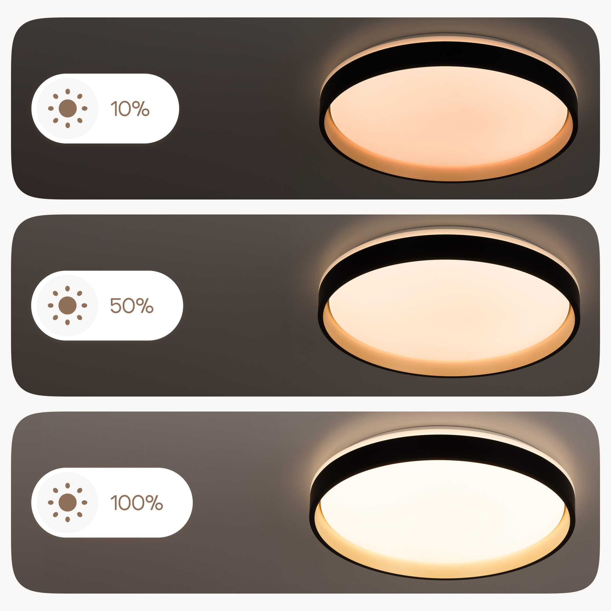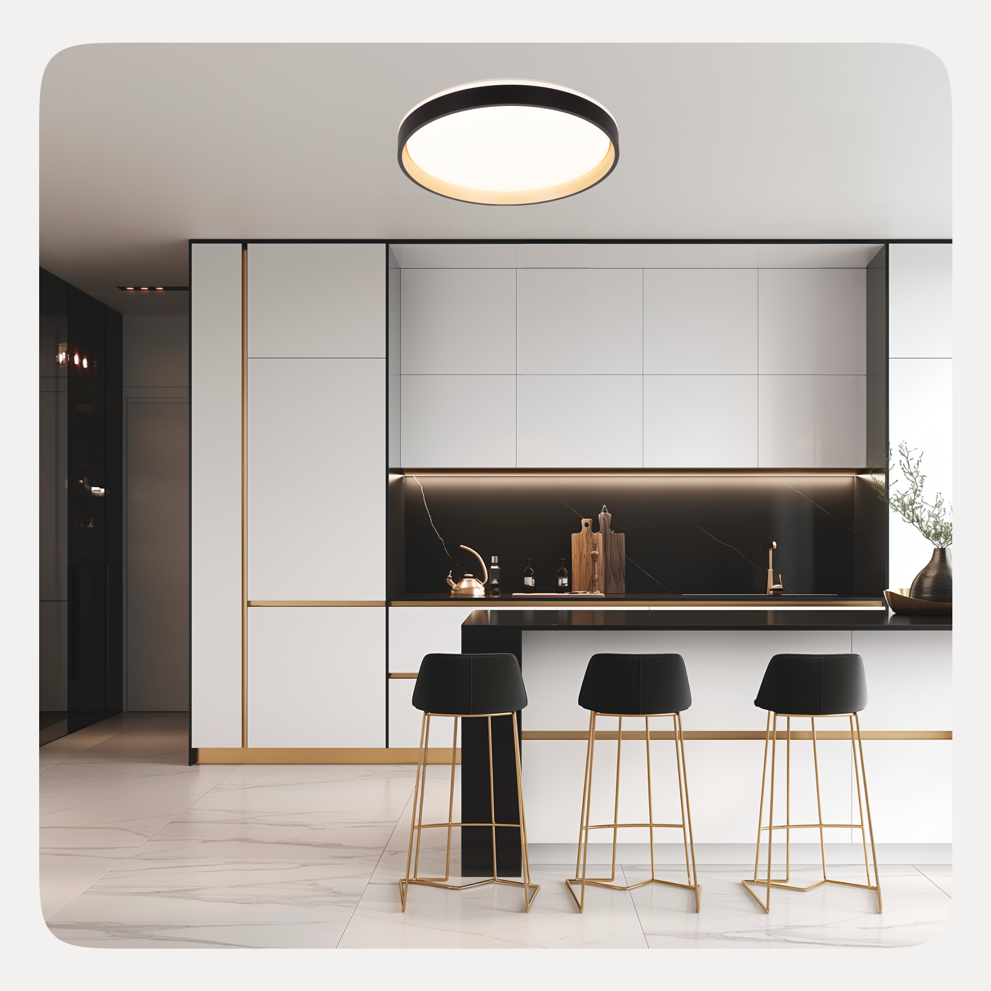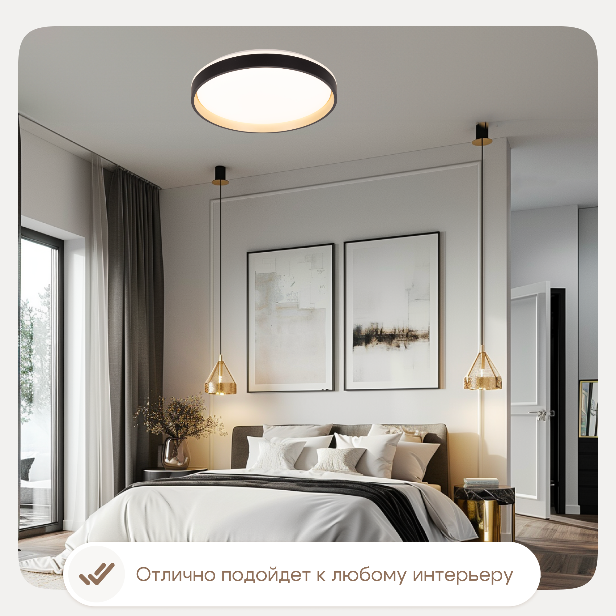 Светодиодный потолочный светильник Citilux ENZO с яркой цветной RGB подсветкой выполнен в современно стиле. Основание металлическое. Плафон круглой формы из прочного полимера чёрного цвета с золотой декоративной окантовкой и рассеивателем из оптического полимера. Благодаря оригинальной конструкции, светильник равномерно освещает помещение и дополнительно подсвечивает потолок, что придаёт пространству дополнительный объём.Мощность изделия 68Вт, световой поток 5800Лм. С помощью пульта дистанционного управления пользователь может плавно регулировать яркость 10% - 100%, менять цветовую температуру в диапазоне 3000K - 5500K, что позволяет настроить любые оттенки теплого, нейтрального или холодного света. Цветная многорежимная RGB подсветка может наполнить пространство яркими и насыщенными цветами. Функция таймера и 4 настраиваемых режима памяти позволяют управлять светильником максимально комфортно.Накладной светильник подходит для всех видов потолков, в том числе натяжных. Тип крепления – через основание. Изделие комплектуется инфракрасным пультом ДУ. Для питания пульта применяются 2 батарейки формата ААА, напряжением 1,5V (не входят в комплект).Плоский потолочный светильник Ситилюкс ENZO станет стильным дополнением для интерьера квартиры, студии, загородного дома или дачи. Легко обеспечит мягкое и равномерное освещение таких помещений, как гостиная, спальня, столовая, кухня или рабочий кабинет. Благодаря оригинальному дизайну, высокому качеству и удобству управления, эта модель будет радовать вас долгие годы.