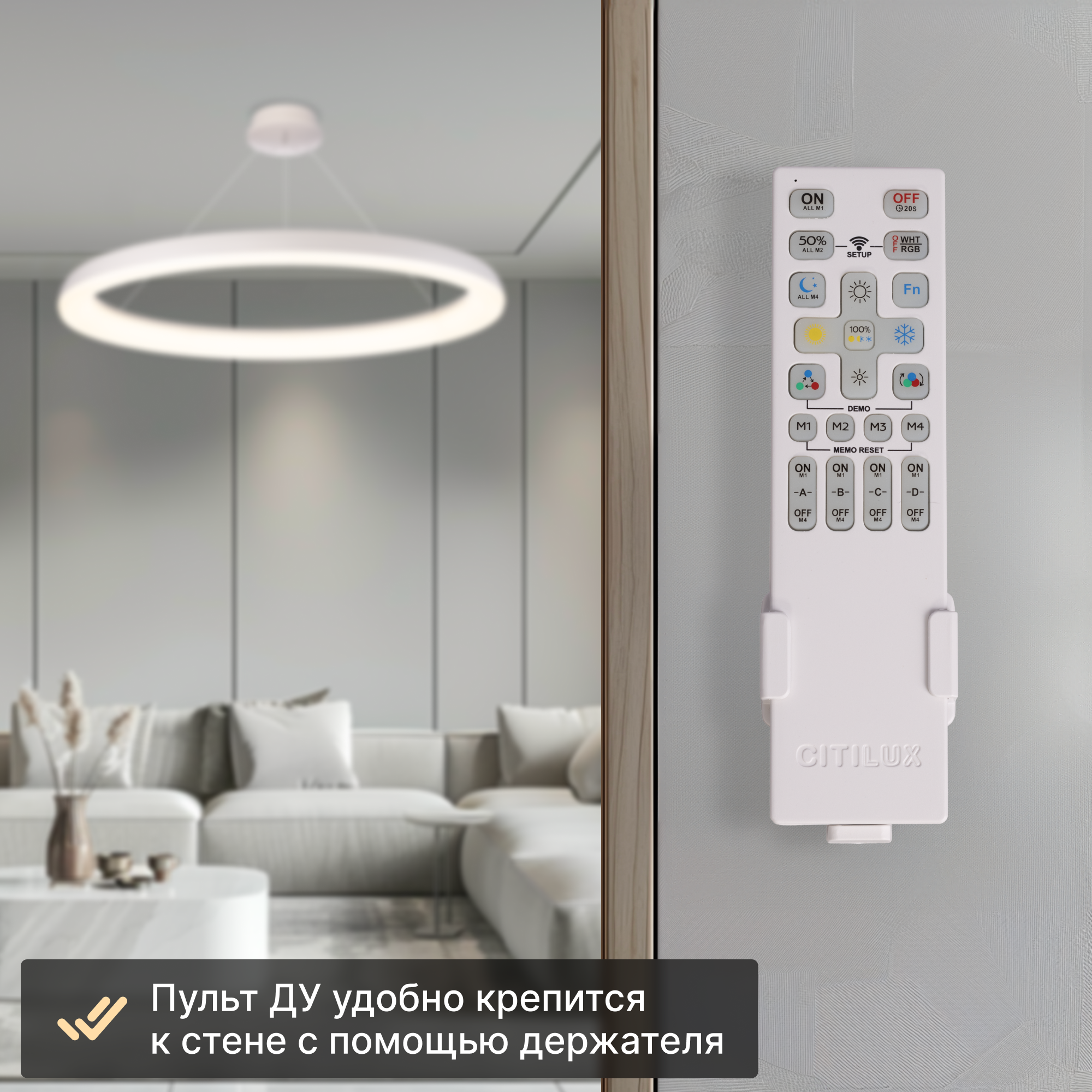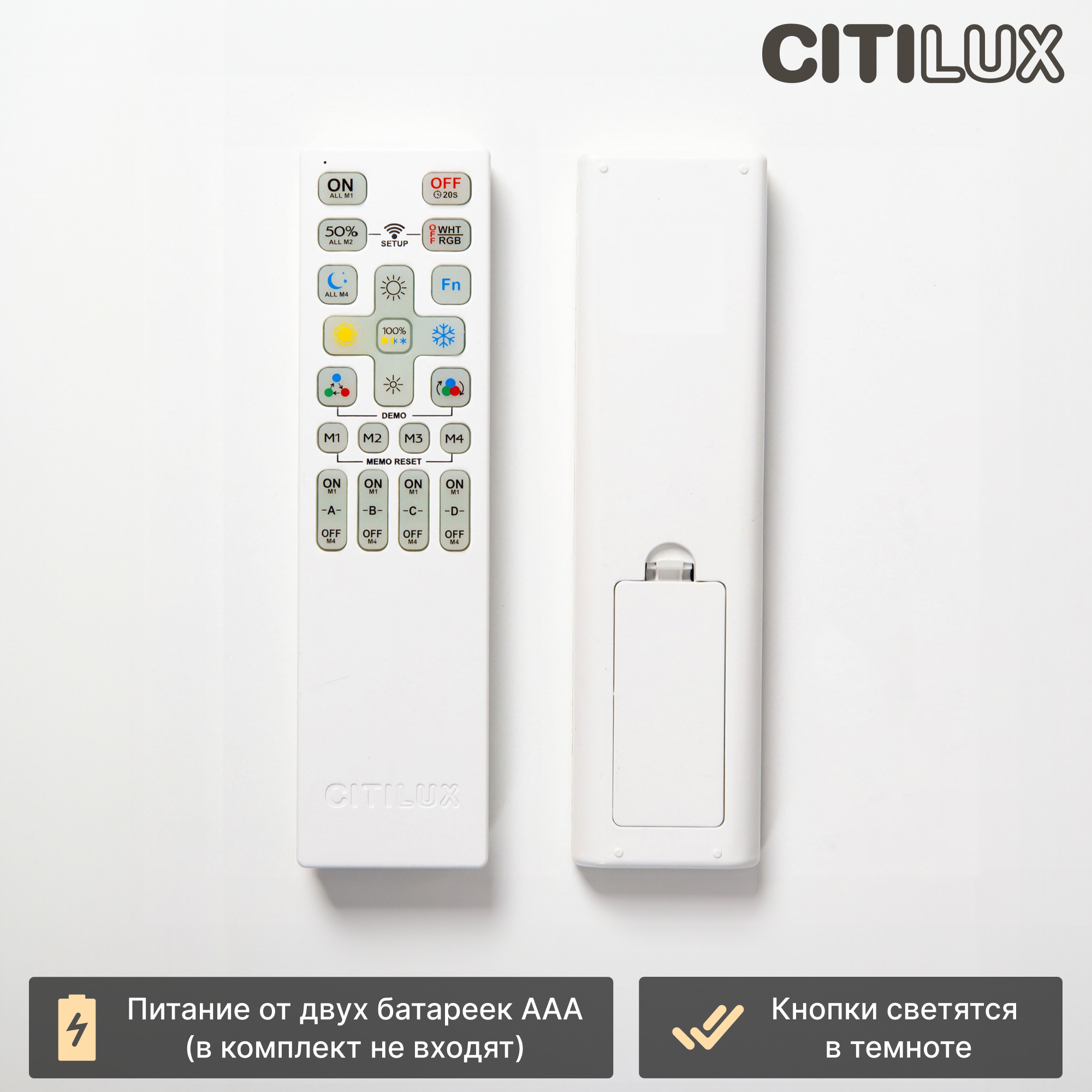 С помощью пульта доступно: плавная регулировка яркости 10 - 100%; управление цветовой температурой 3000К - 5500К, позволяет настроить любые оттенки теплого, нейтрального и холодного света. Есть функция отсроченного выключения и ночника; 4 настраиваемых режима памяти, которыми также можно управлять настенным выключателем. Радиопульт ДУ в комплекте. Питание пульта - 2 батарейки формата ААА, напряжением 1,5V (не входят в комплект).