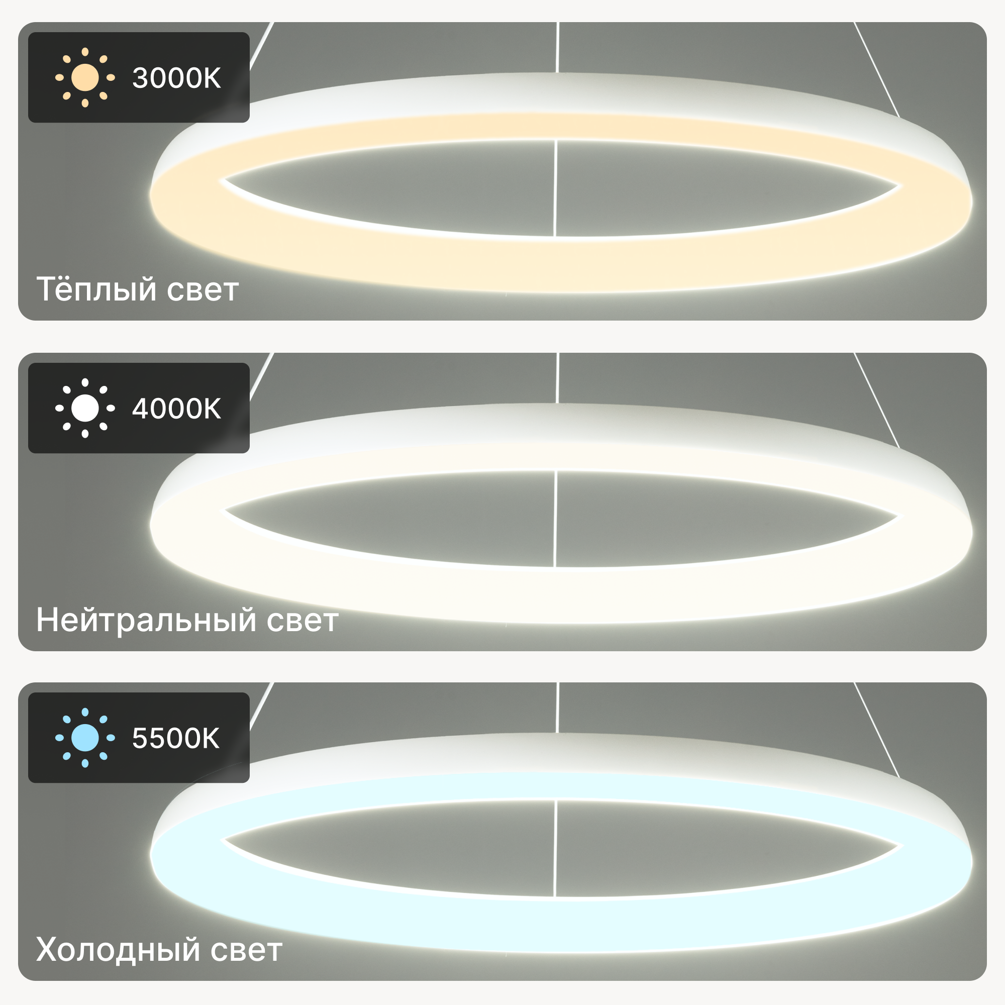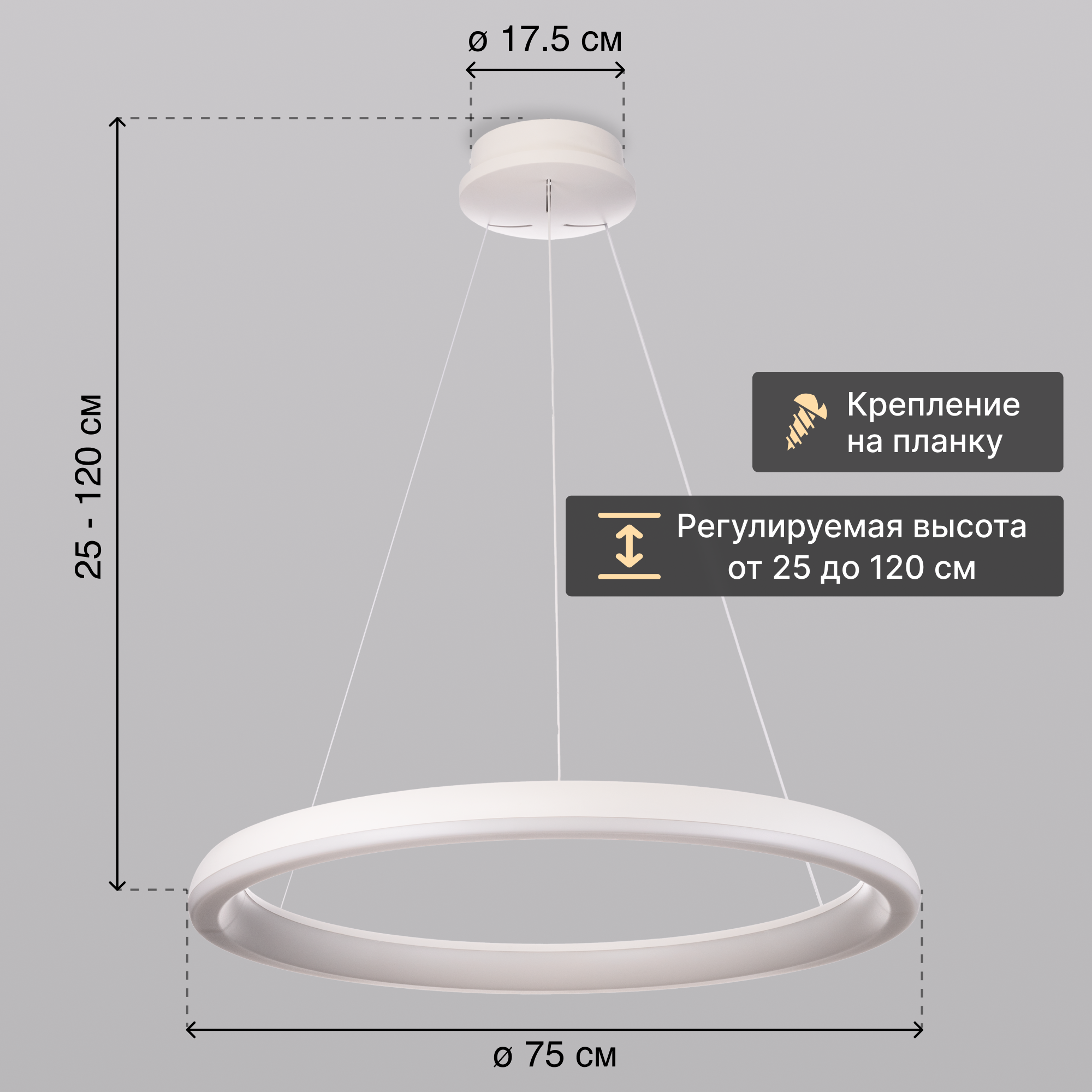 Мощность изделия 95Вт, световой поток 7800Лм, индекс цветопередачи CRI>85. Диаметр 75см, высота легко регулируется от 20см до 1,2м. Крепление подходит для всех видов потолков, в том числе натяжных, тип крепления – планка.