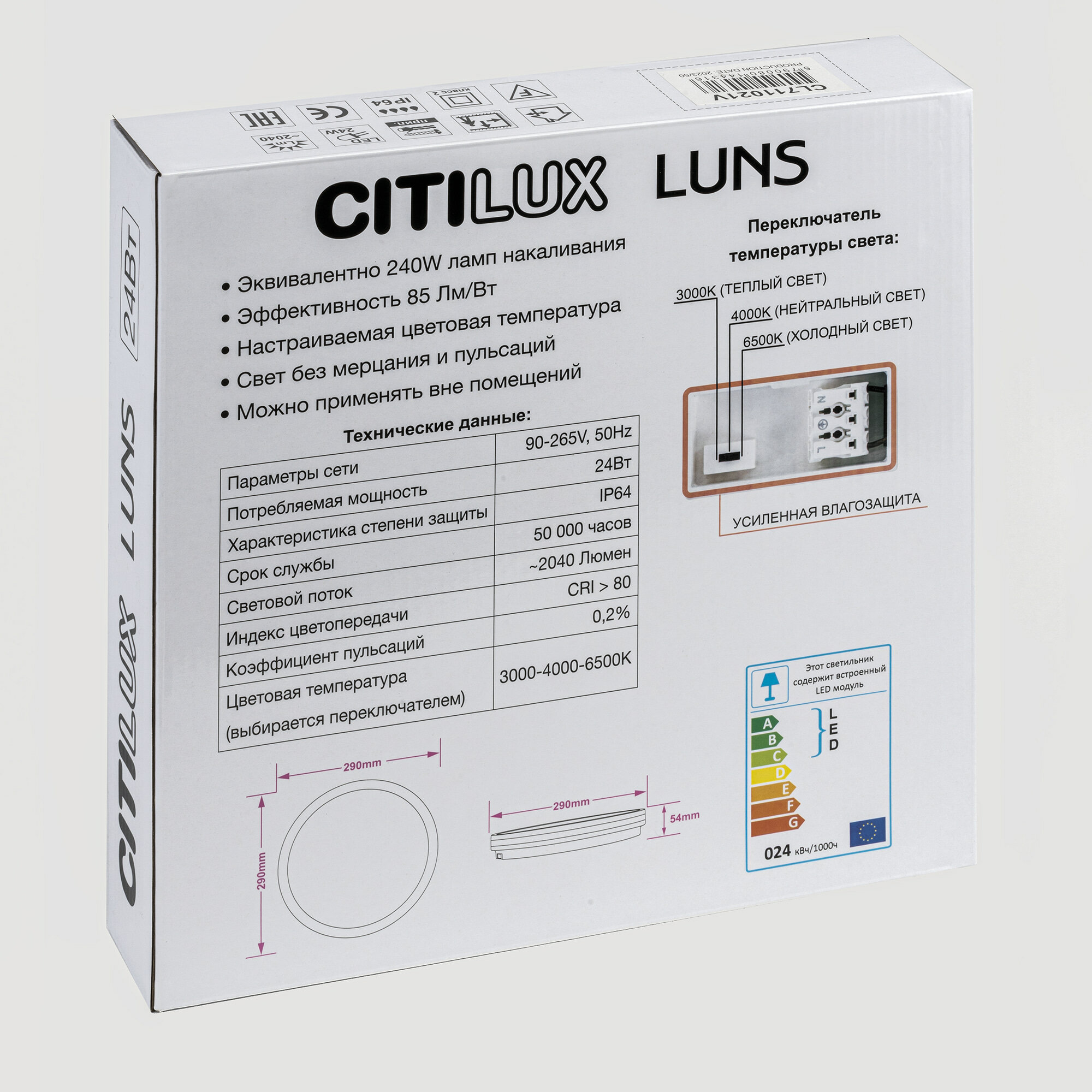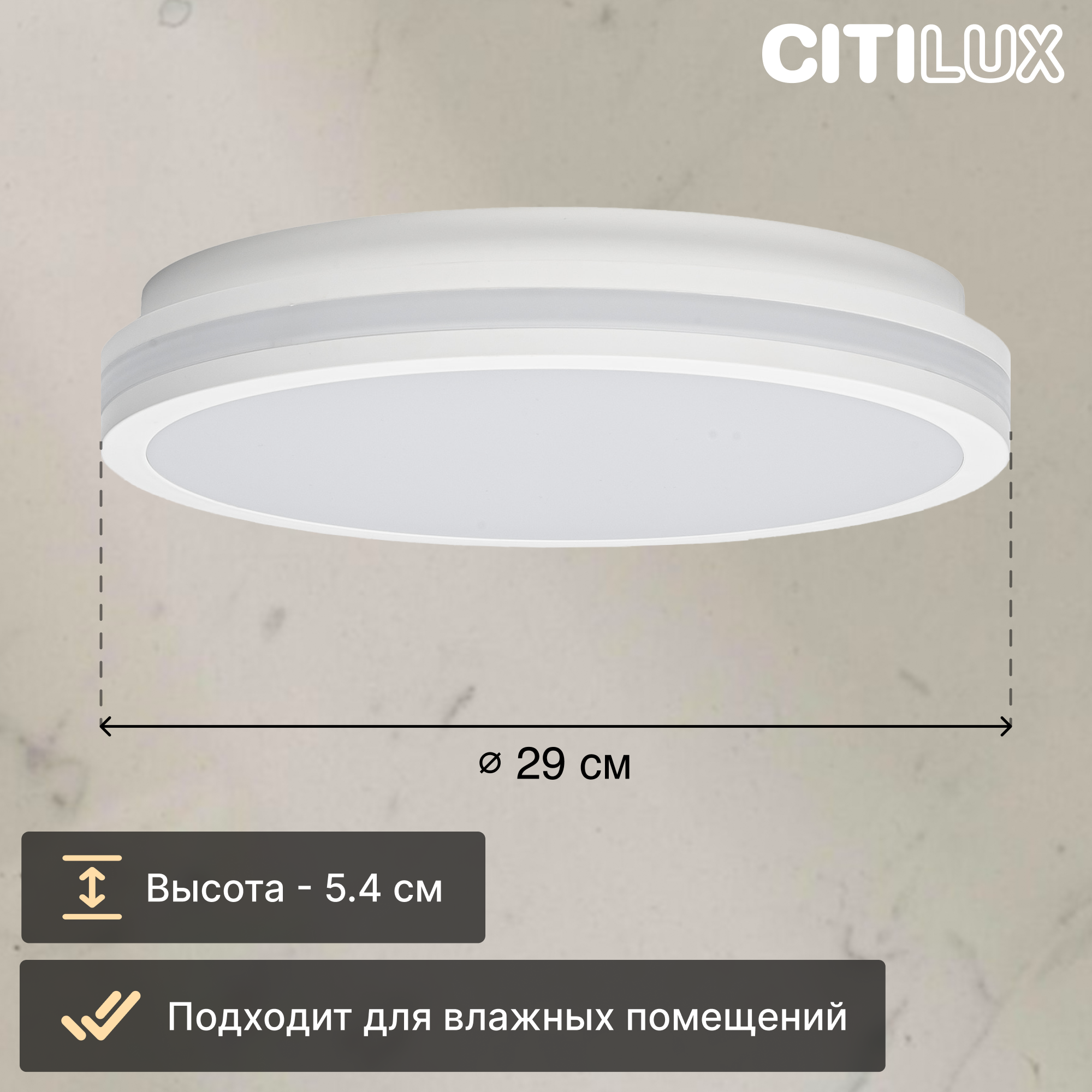 Светодиодный влагозащищённый светильник Citilux LUNS выполнен в современном стиле. Накладной светильник плоский, круглой формы. Корпус из белого ударопрочного полимера, плафон-рассеиватель матовый из оптического полимера.Диаметр изделия 29см, высота 5,4см, мощность 24Вт, класс защиты IP64, осветит до 8м?. Модель оснащена переключателем цветовой температуры 3000К, 4000К, 6500К - тёплый, нейтральный, холодный свет. Перед монтажом, на тыльной стороне светильника, переключателем устанавливается выбранный вариант свечения. Свет безопасный для глаз, без мерцания и пульсаций.Светильник-таблетка Ситилюкс LUNS ярко осветит ванную комнату, туалет, совмещённый санузел и другие помещения с высокой влажностью. Отлично подойдёт для уличного освещения.