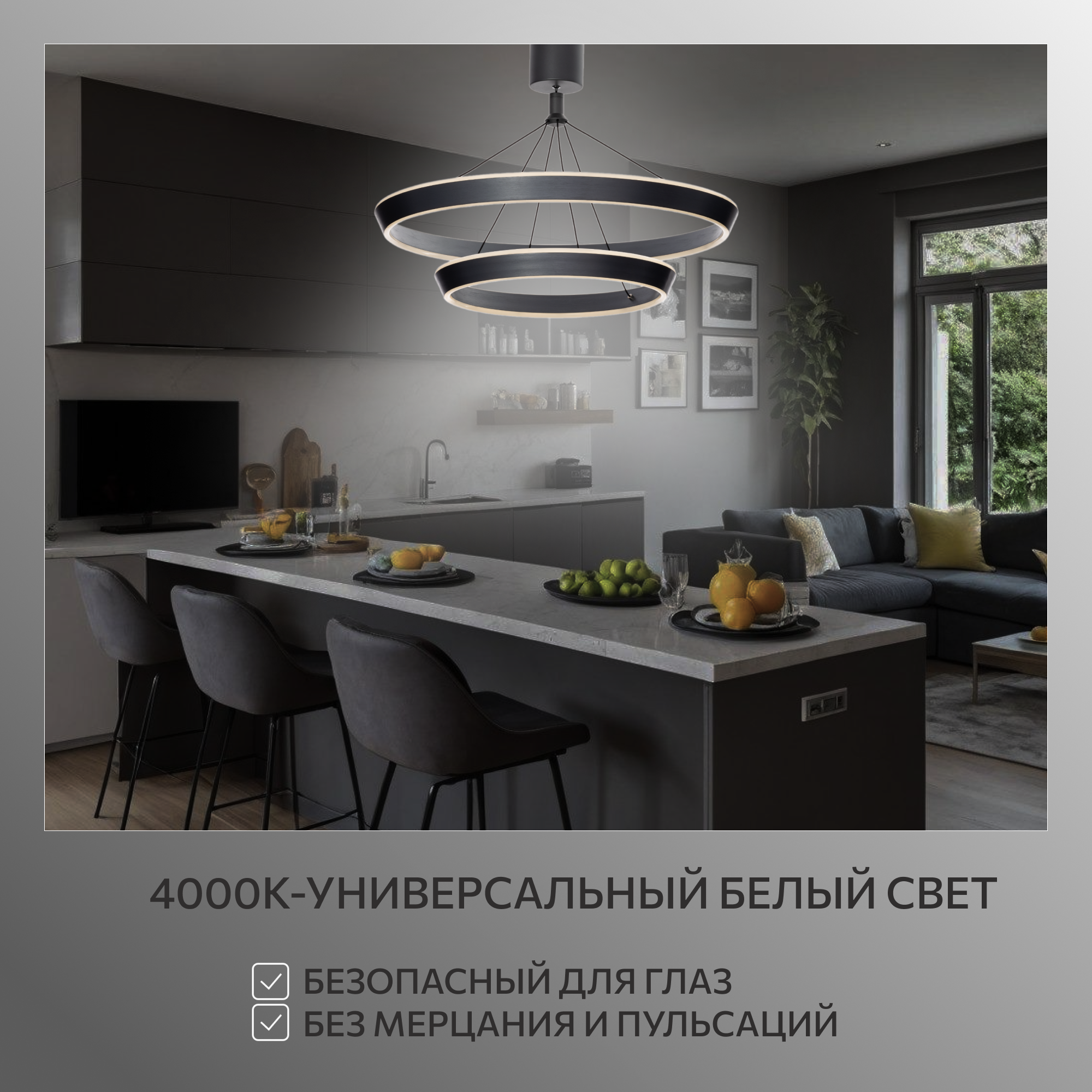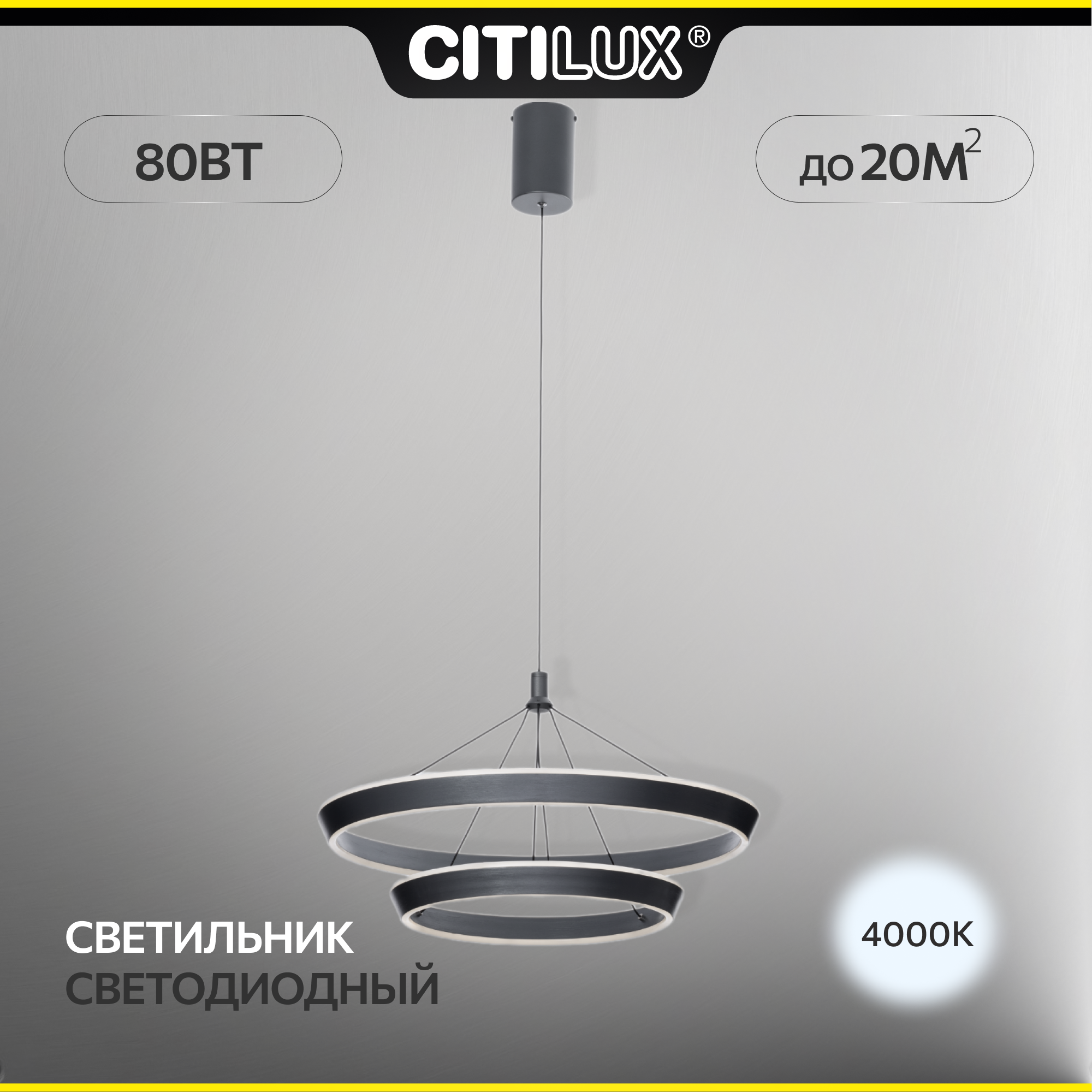 Светодиодная люстра с двумя подвесными кольцами Citilux Tavi выполнена в современном стиле. Каждое кольцо - светодиодный модуль, изготовленный из алюминиевого профиля благородного серого цвета, рассеиватель из матового оптического полимера. Наличие источников света с двух сторон профиля позволяет равномерно осветить всё помещение.Мощность изделия 80Вт, световой поток 5000Лм, цветовая температура 4000К – нейтральный белый свет. Мягкий комфортный свет, безопасный для глаз, без мерцания и пульсаций. Высота светильника легко регулируется при установке, что позволяет использовать его в помещениях как с высокими, так и с низкими потолками. Крепление подходит для всех видов потолков, в том числе натяжных, тип крепления – планка.Кольцевая люстра Ситилюкс Tavi отлично справиться с задачей основного освещения стильной гостиной, модной спальни, уютной кухни и строго кабинета. Потрясающе выглядит над столом, прекрасно осветит зону отдыха.