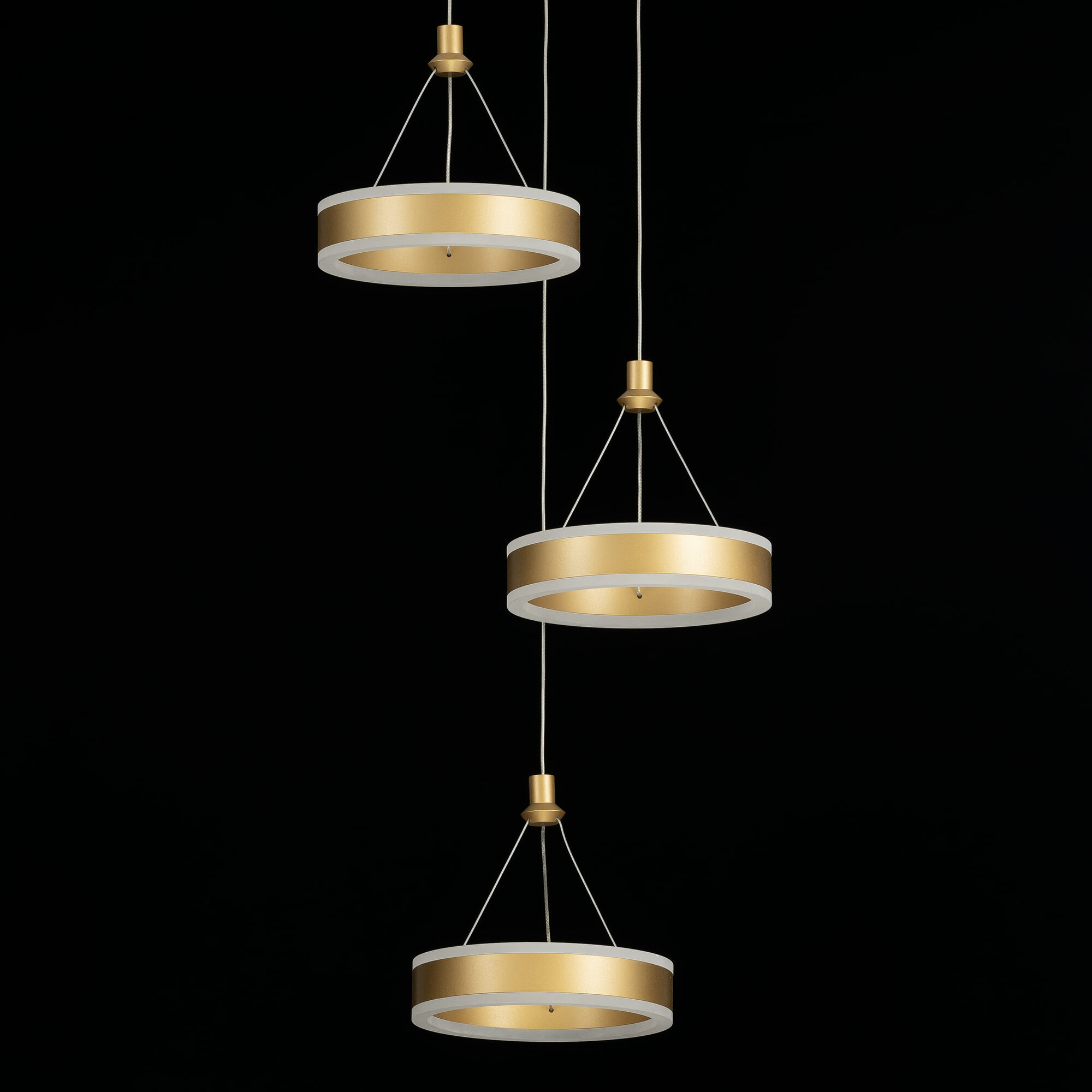 Светодиодный каскадный светильник Citilux Дуэт выполнен в современном стиле. Корпус металлический, цвет благородное золото. Светильник состоит из круглого основания и трёх подвесных колец. Кольцо - светодиодный модуль, корпус изготовлен из алюминиевого профиля, рассеиватель из оптического полимера. Наличие источников света с двух сторон профиля позволяет равномерно осветить всё помещение.