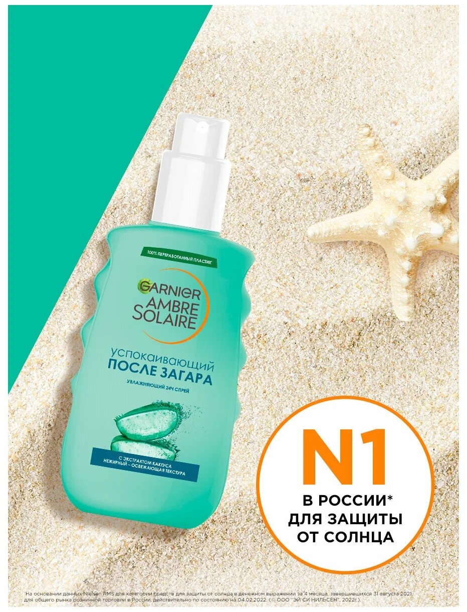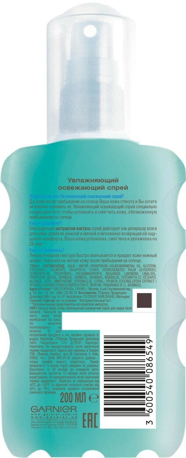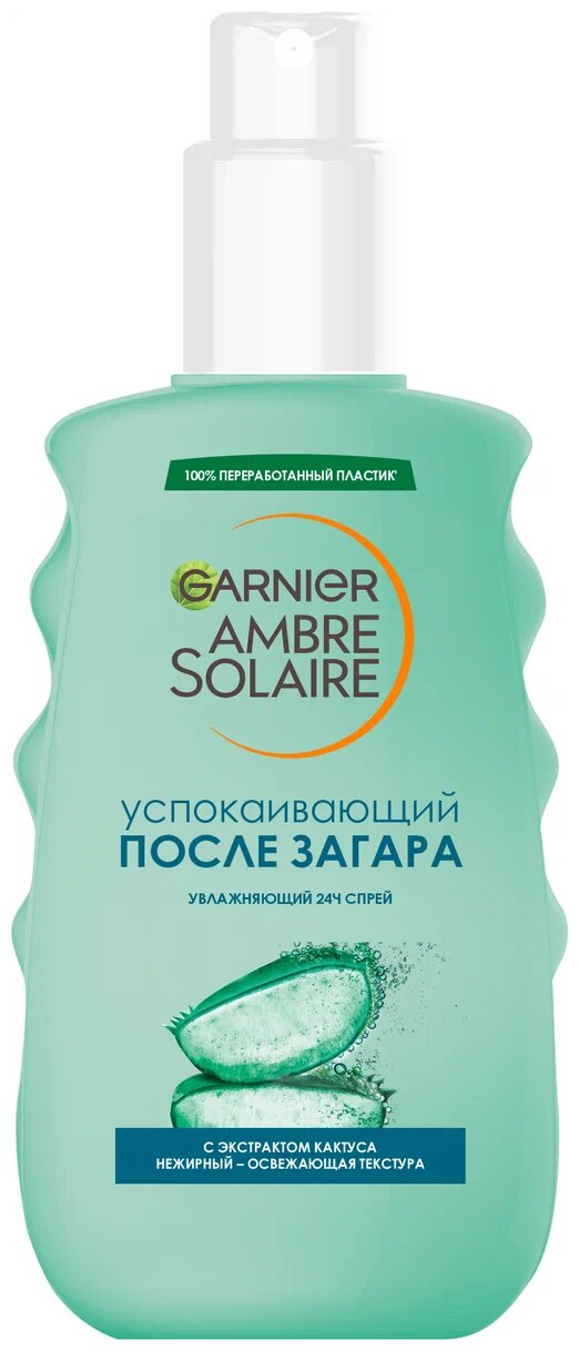 Garnier Ambre Solaire с экстрактом кактуса создан для того, чтобы успокоить и восстановить кожу, обезвоженную пребыванием на солнце. Обогащенный экстрактом кактуса спрей действует как резервуар влаги для кожи, делая ее нежной, мягкой и мгновенно возвращая ей состояние комфорта.