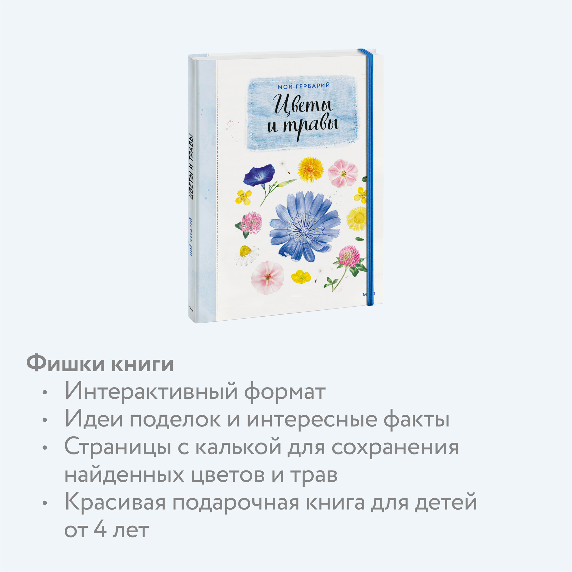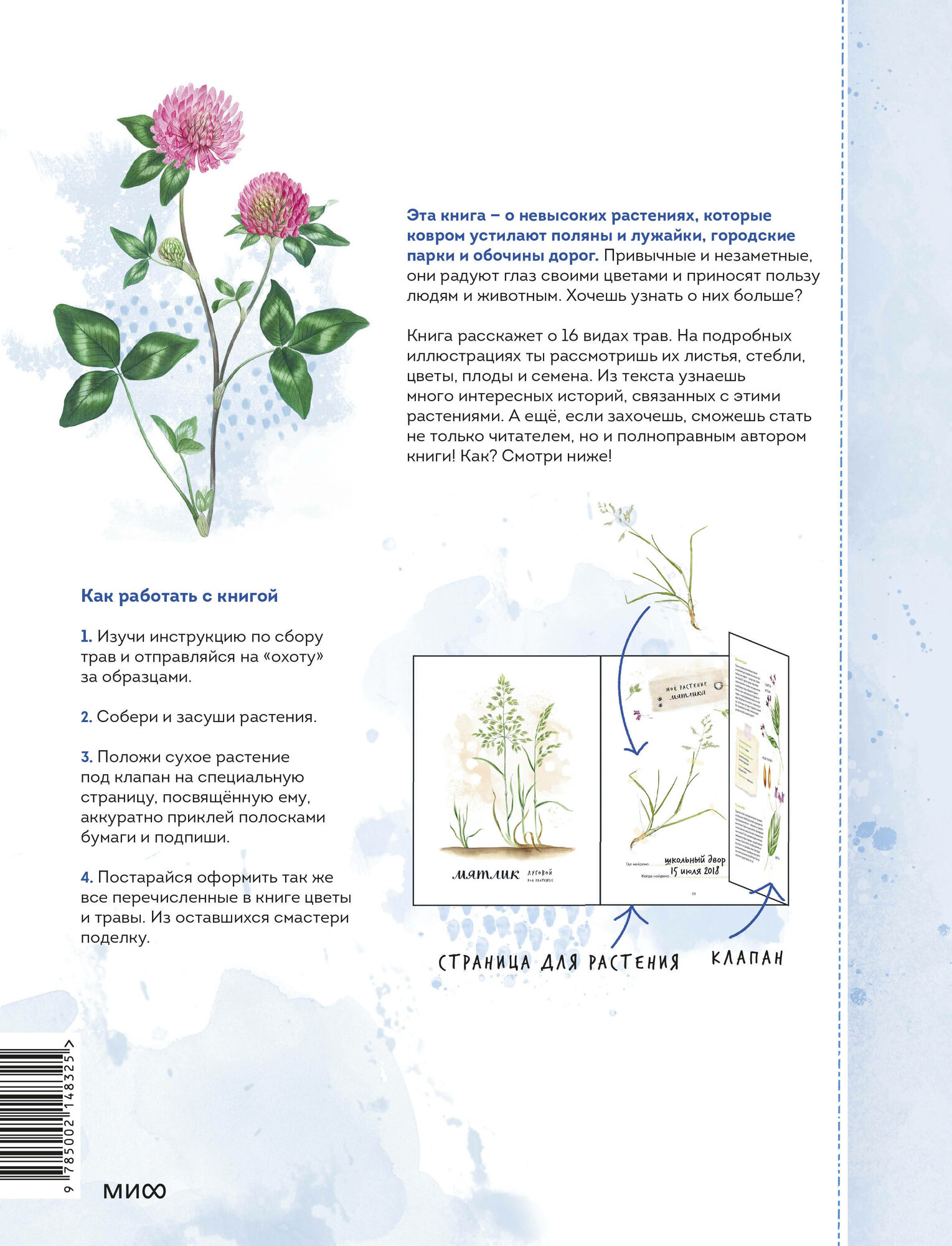 Это вторая книга из серии "Мой гербарий", она посвящена травам. В ней вы найдете описания и подробные иллюстрации 16 видов трав средней полосы России: одуванчика, ромашки, подорожника, цикория, сныти, вьюнка, чистотела и других. Здесь же, между страниц, под калькой можно сохранить своё растение. Тексты написаны учёным-биологом, а реалистичные акварельные иллюстрации откроют читателю мир растений, научат внимательнее относиться к природе и искренне восхищаться её красотой. В книге объясняется как правильно собирать и засушивать растения для гербария, есть идеи поделок из цветов и листьев, информация про виды и строение трав и цветков, описание их значения для природы и человека. Как работать с этой книгой 1. Изучить инструкцию по сбору трав и отправиться "на охоту" за образцами. 2. Собрать и засушить растения. 3. Положить сухое растение под кальку на специально отведенную для него страницу, аккуратно приклеить полосками бумаги и подписать. 4. Из оставшихся цветков, стебельков и листьев смастерить поделку (по инструкциям в конце книги). Фишки книги: Описание растений, которые нас окружают: одуванчика, ромашки, подорожника и других трав, которые можно найти около вашего дома. Интерактивный формат. Поделки и интересные факты. Страницы с калькой для сохранения найденных цветов и трав. Красивая большая подарочная книга, которая подарит по-настоящему весеннее настроение Для кого: Для любителей природы от 4 лет и старше.