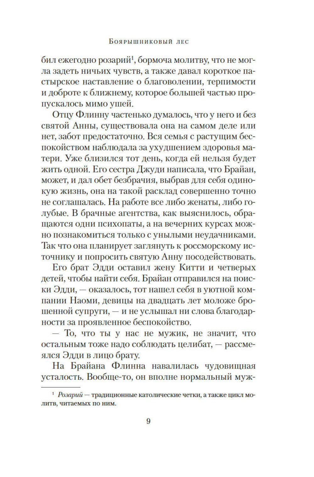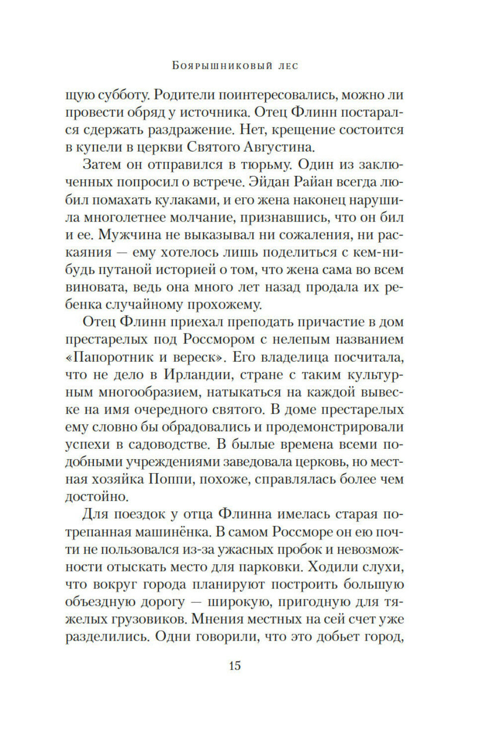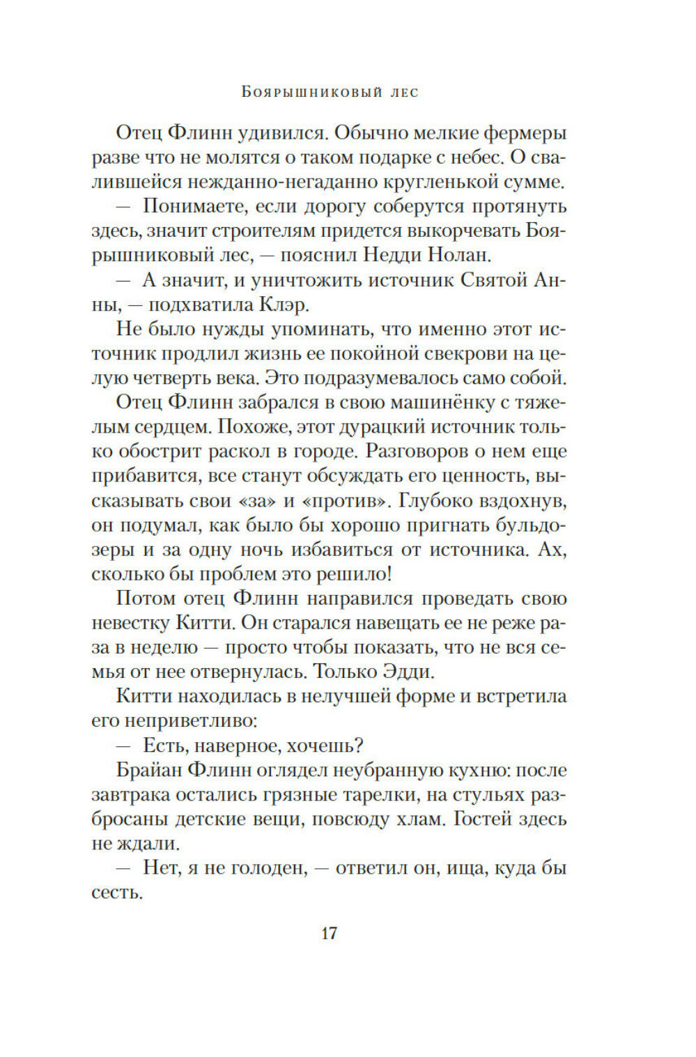 Ирландская писательница и журналистка Мейв Бинчи (1940–2012) хорошо известна не только на своей родине, но и во всем мире. Перу Бинчи, помимо рассказов, принадлежит более полутора десятков романов, ее книги неизменно становились бестселлерами и не раз получали престижные международные премии. В 1970-х годах Бинчи опубликовала три сборника рассказов, и довольно успешно, но настоящая слава пришла к ней после выхода первого романа «Зажги свечу» (1982). «Боярышниковый лес», написанный в 2006 году, получил самые теплые отзывы читателей и критиков. На окраине ирландского городка Россмор растет Боярышниковый лес, где бьет источник Святой Анны. Одни уверяют, что это место обладает чудесной силой, другие считают его фетишем, вокруг которого насаждаются нелепые суеверия. Ходят слухи, что скоро вокруг города протянут трассу, а значит, придется выкорчевать лес и уничтожить источник. Но ведь люди из поколения в поколение приходили сюда, чтобы поделиться своими мечтами и страхами Несомненно, горожане только выиграют от строительства новой дороги, но не потеряется ли при этом что-то неизмеримо более ценное, чем современный комфорт? Когда приходится делать выбор между добрыми традициями и обещаниями будущего, страсти в Россморе разгораются не на шутку Книга выходит в новом переводе.