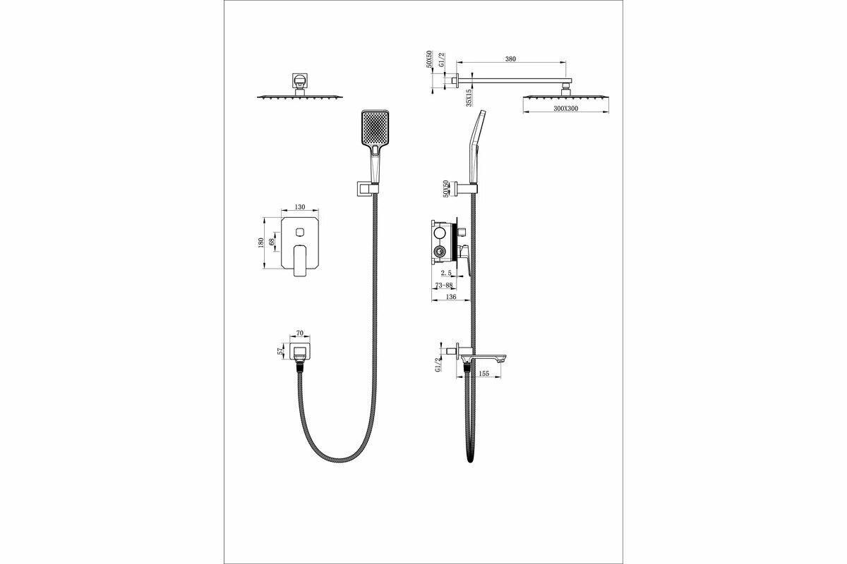 | Состав комплекта | верхний душ, настенный держатель, смеситель, излив, душевой гарнитур |