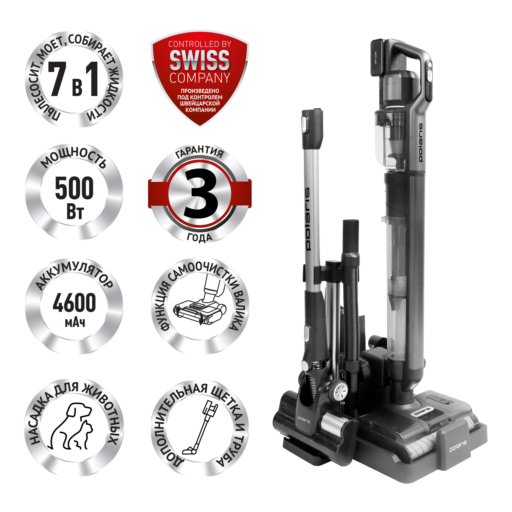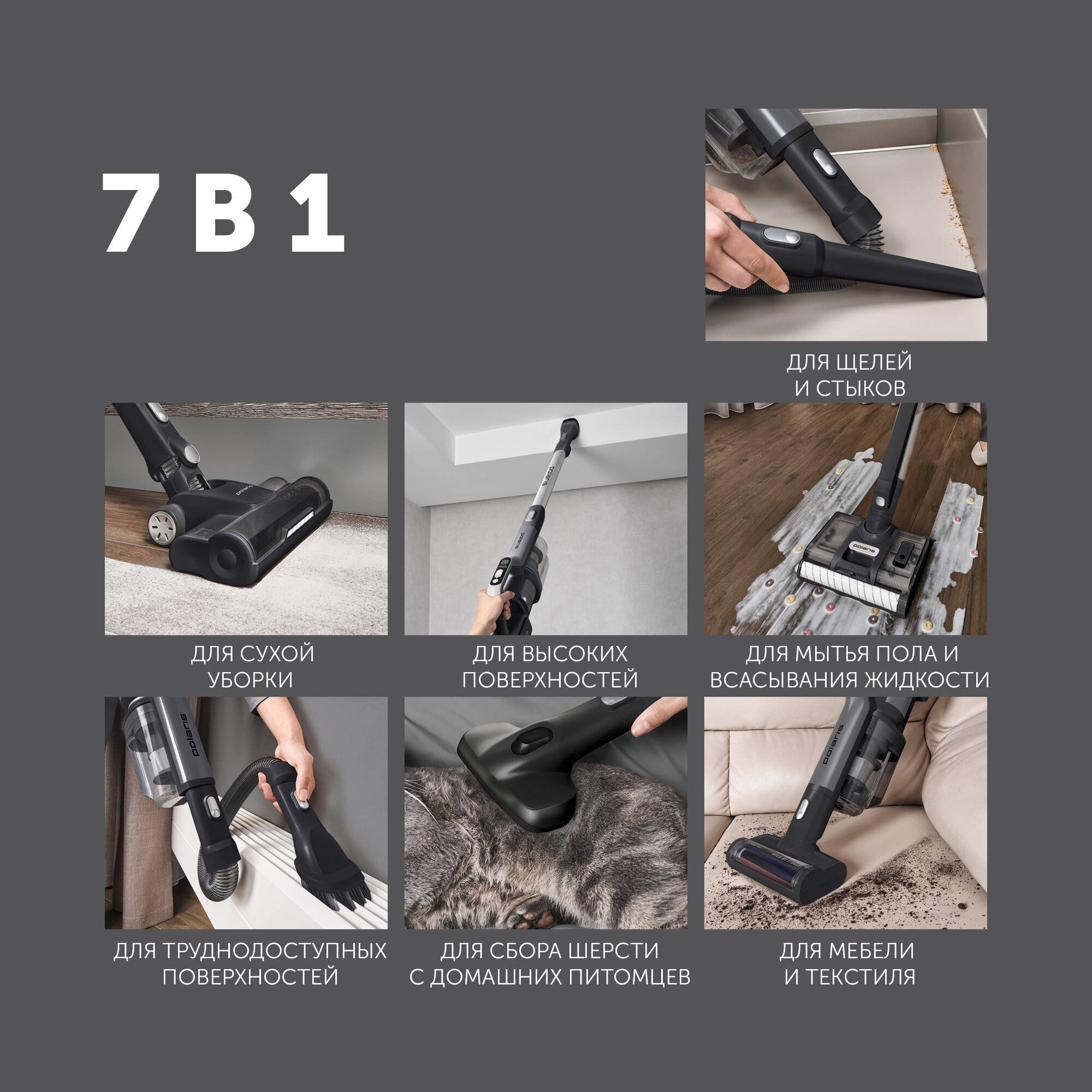 С его помощью можно пылесосить, мыть пол, собирать пролитые жидкости с пола, чистить мягкую мебель, Также благодаря съемной моторной части и дополнительной щетке и трубе пылесос превращается в самостоятельный беспроводной вертикальный пылесос, который можно использовать для повседневной сухой уборки.