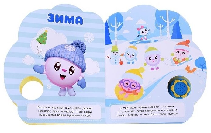 Музыкальная книга «Малышарики. Летом и зимой» ТМ «УМка» станет отличным подарком для вашего малыша:- 1 музыкальная кнопка-ромашка- 3 песенки- история по мотивам м/ф- красочные иллюстрации- фигурная вырубкаРебёнок с удовольствием будет листать плотные страницы, рассматривать красивые картинки и слушать о приключениях героев любимого мультсериала. Кроме того, эта книга не простая - при нажатии на красивую кнопку-ромашку заиграют три песенки. Малыш легко освоит включение звука: по нажатию на кнопку песенка включится, при втором нажатии выключится. Благодаря компактному размеру книгу удобно взять с собой в дорогу.Музыкальная книга ТМ «УМка» расширяет кругозор и развивает:- слуховое восприятие и музыкальный слух- навык чтения- фантазию- образное мышление- память- тактильное восприятиеОбъём: 8 стр. Формат: 170 х 205 мм.Материал: пластмасса + картон.Работает от 3-х батареек типа LR1130 (в комплекте).Рекомендовано детям старшего дошкольного возраста.