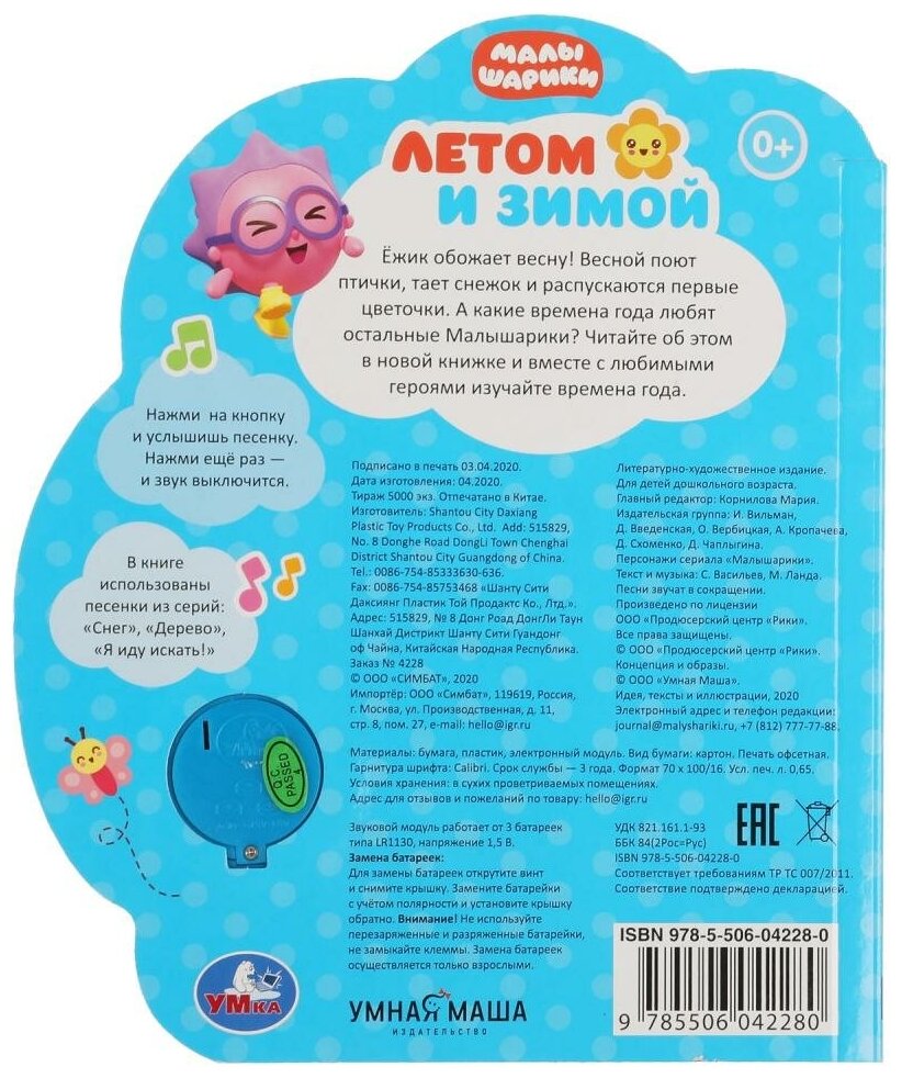 Книга Умка 9785506042280 Летом и зимой. МАЛЫШАРИКИ 1 кнопка-ромашка 3 песенки (Марина Анатольевна Ланда); Симбат, 2020