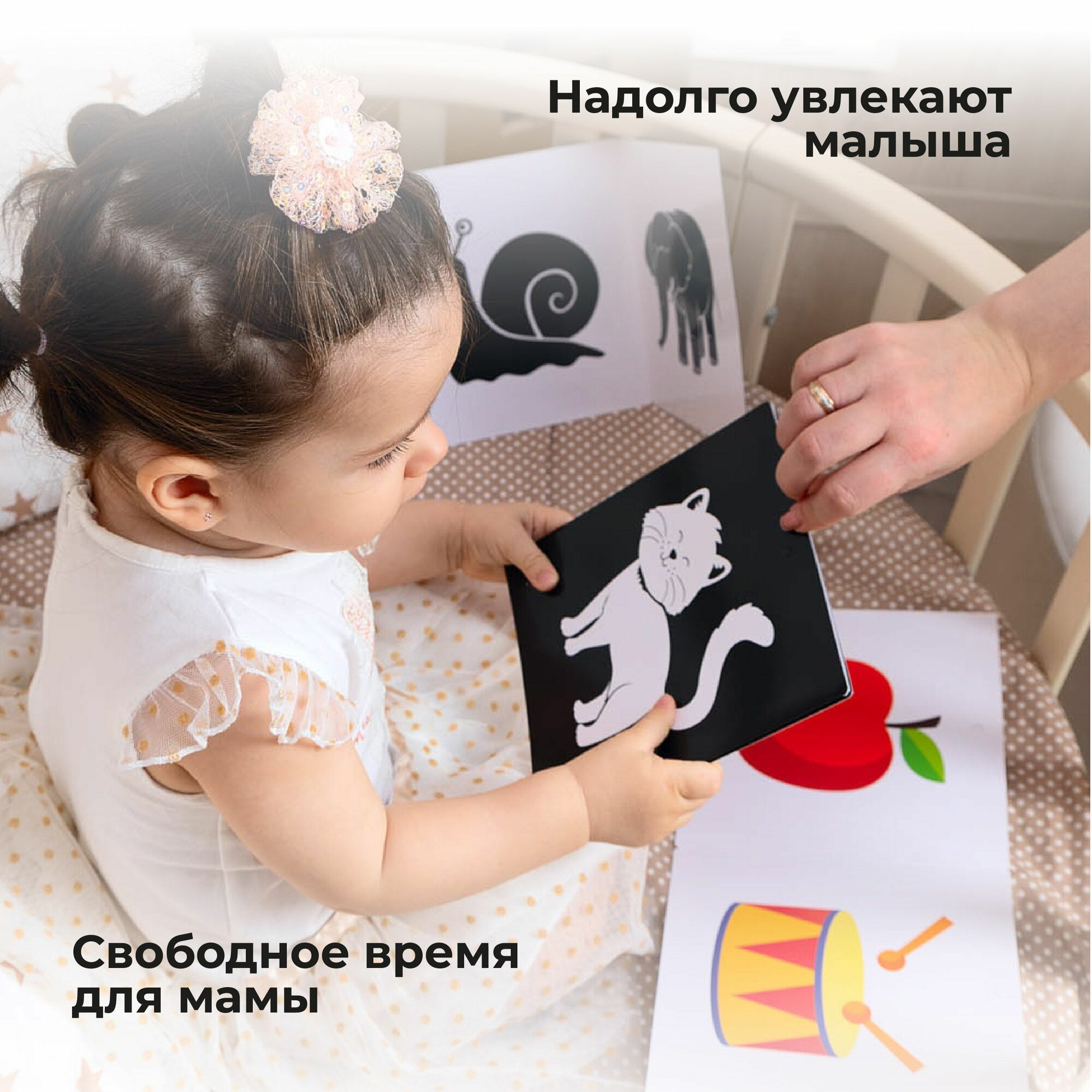 Набор книжек-гармошек «Смотрелки» станет незаменимым развивающим пособием для вашего малыша уже с первых месяцев жизни. В набор включены 6 книжек-гармошек из трёх серий: «Животные», «Узоры» и «Предметы». С чёрно-белыми книжками-гармошками "Животные" и "Узоры" знакомим кроху с до 5 месяцев, после 5 месяцев будет актуальна цветная книжка-гармошка "Предметы", в которой представлены основные цвета, доступные детям до года. Малышам старше месяца полезно показывать контрастные картинки из книжек, чтобы укреплять и развивать его глазки. Чёрный и белый - это те цвета, которые ребёнок может различать с самого рождения. Контрастные изображения привлекают внимание детей, побуждают подолгу рассматривать их, всматриваться в детали, изучать и запоминать увиденное. Обтекаемые формы, силуэтные изображения, узоры и линии понятны и доступны для восприятия новорожденных. В результате занятий с черно-белыми картинками у новорожденного улучшаются зрительные функции: острота зрения, цветоощущение, контрастная чувствительность, расширяется поле зрения. Книжку-гармошку полезно ставить то с одной стороны кроватки, то с другой, чтобы малыш поворачивал голову и расширял поле зрения, лёжа то на спинке, то на животике. Малыши начинают радоваться и гулить, когда изучают чёрно-белые картинки. Вы можете повесить книжку в коляску, поставить её на пеленальный столик или в кроватку, использовать вместо мобиля (для этого в карточках предусмотрены специальные отверстия). Сначала малыш фиксирует взгляд на картинке не более пары секунд, но постепенно ребёнок учится подолгу задерживать взгляд на предмете. Мамам на заметку: • В вертикальном положении новорожденные лучше способны фокусировать взгляд. Поэтому, чтобы привлечь внимание крохи, следует взять его на ручки: вертикально; • Картинки не должны постоянно находиться перед ребёнком, иначе они будут перегружать мозг малыша, доставайте их на 0 минут два-три раза в день. • За одно "занятие" даём по -2 книжки, чтобы не было гиперстимуляции. • Книжка-гармошка должна находиться на расстоянии не более 30 см от глаз ребёнка младше 3х месяцев. Для детей постарше - на расстоянии не более 60-90 см (длина вытянутой руки). • Также, книжки в кроватку следует вешать не перед самым лицом малыша, а немного дальше вперёд— ближе к ножкам. Внимание! Недопустимо самостоятельное использование детьми младше 3х лет. Использовать только под непосредственным наблюдением взрослых.