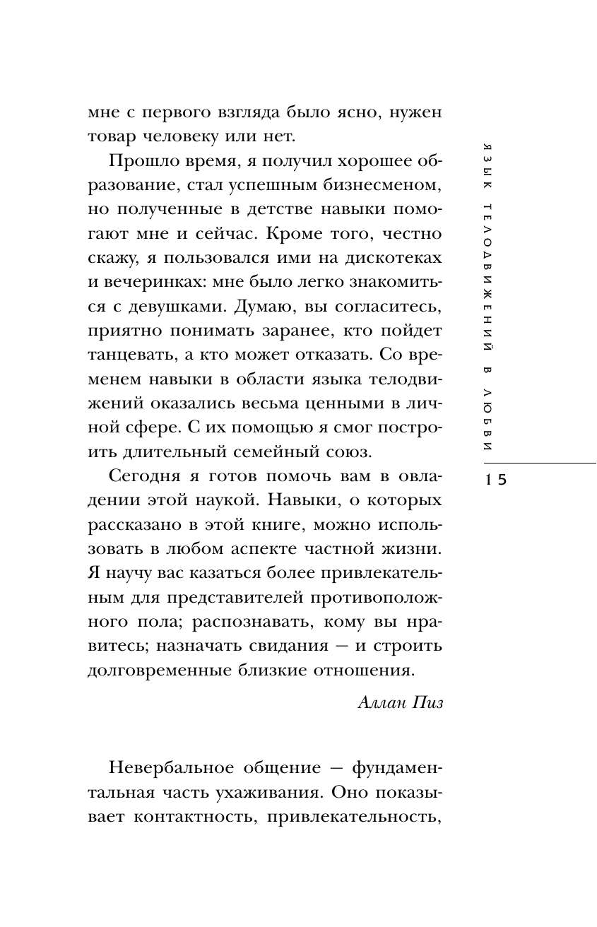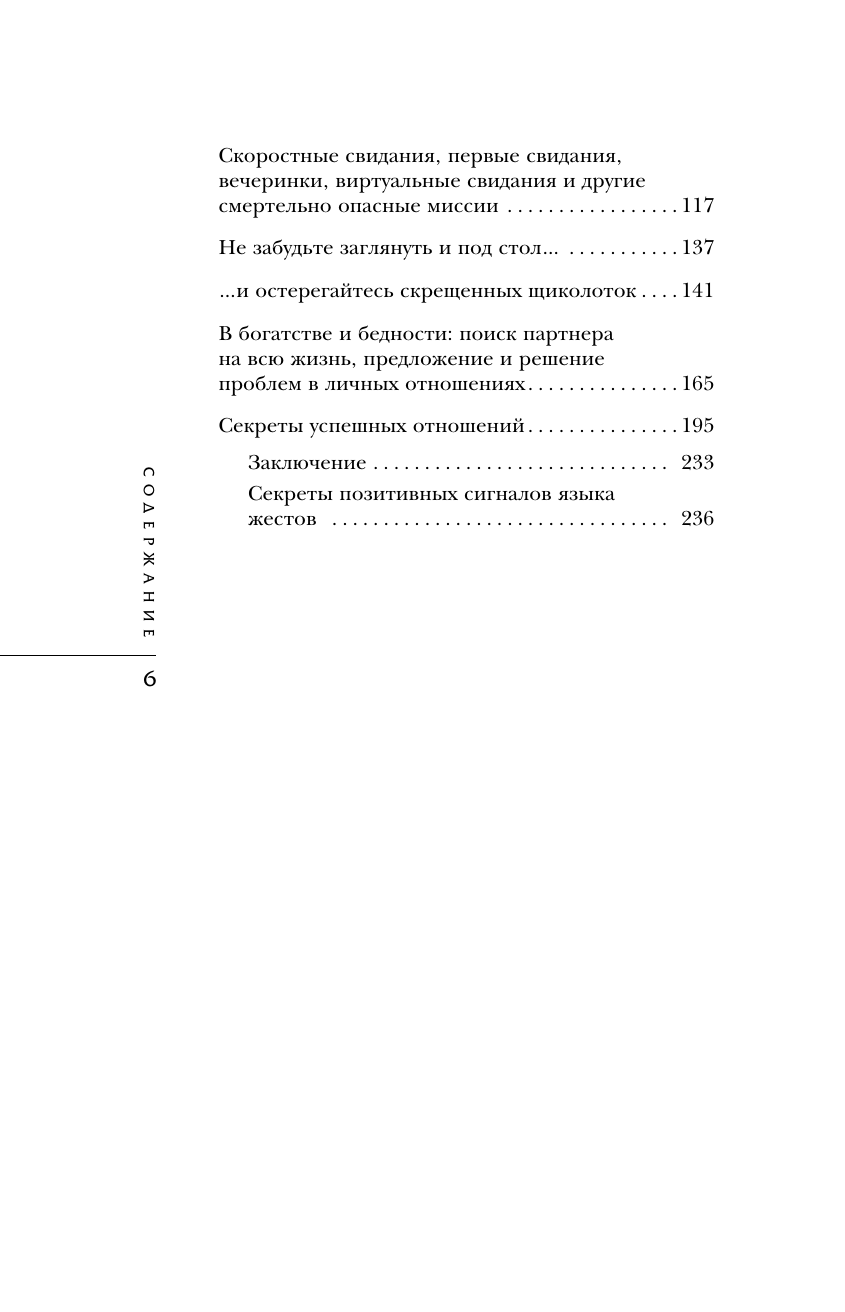 Авторы знаменитых бестселлеров «Язык телодвижений» и «Язык взаимоотношений», общий тираж которых превысил 40 миллионов экземпляров, в своей новой книге раскрывают главные секреты общения между мужчинами и женщинами. Вы научитесь быть более привлекательными для представителей противоположного пола, распознавать, кому вы симпатичны, назначать свидания и строить крепкие отношения со своей второй половинкой.