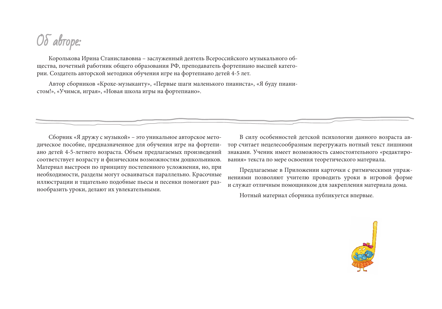 «Я дружу с музыкой» — новая книга автора уникальной методики обучения игре на фортепиано Ирины Корольковой. Главы в сборнике расположены по принципу «от простого к сложному», сопровождаются яркими выносками для запоминания. Красочные иллюстрации и тщательно подобранные пьесы и песенки помогают разнообразить занятия, сделают их увлекательными, а специальные карточки позволят проводить уроки в игровой форме.