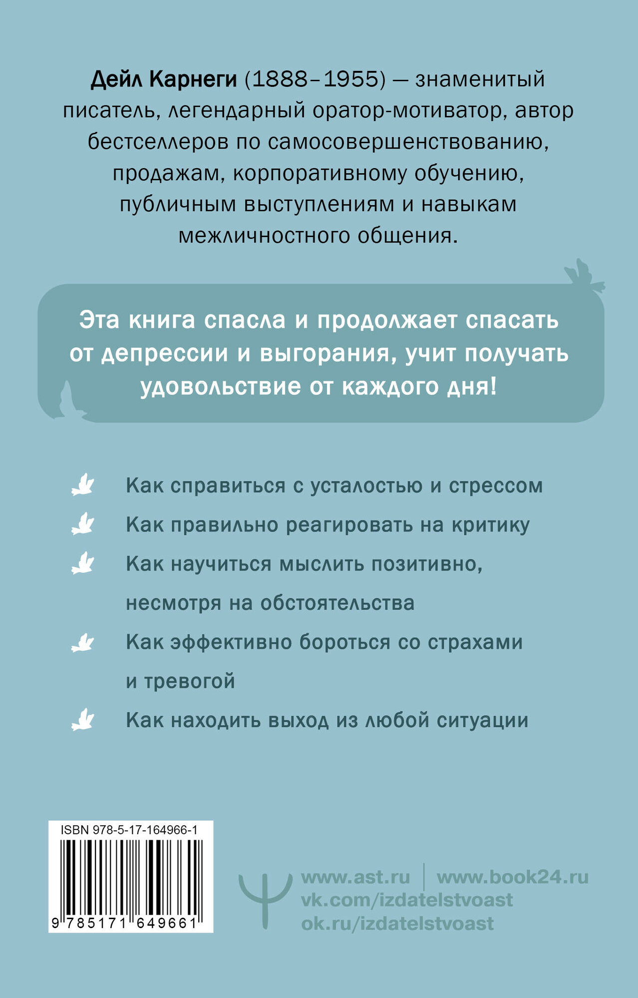 Двадцать пятое, расширенное и обновленное издание вневременного бестселлера Дейла Карнеги «Как перестать беспокоиться и начать жить» — классика, которая улучшила и изменила личную и профессиональную жизнь миллионов людей! Это одна из самых влиятельных книг в мире, она входит во все списки бестселлеров и переведена почти на все языки. Надежные, проверенные опытом и временем советы Карнеги остаются актуальными для современного читателя, поскольку автор обращается к вечным вопросам. Книга «Как перестать беспокоиться и начать жить» научит вас, как: