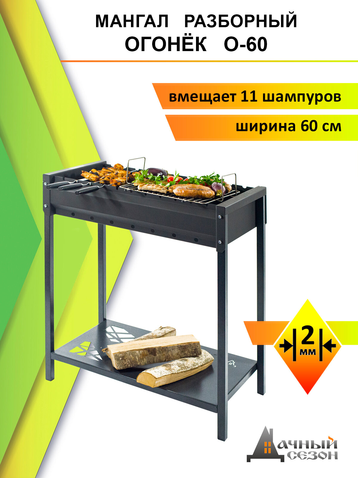 Мангал "Огонек О-60" от производителя "Дачный Сезон" - это надежный и стильный выбор для приготовления пищи на открытом огне.Мангал изготовлен из качественной стали толщиной 2 мм, что обеспечивает его прочность и долговечность даже при использовании дров. Топка покрыта термостойкой краской, которая выдерживает температуру до 700 градусов.Ширина топки составляет 60 см, что позволяет разместить до 11 шампуров. Для удобства фиксации шампуров предусмотрены специальные пазы.Каркас мангала покрыт порошковой краской, что обеспечивает его защиту от внешних воздействий. В комплекте идет большой поддон для угля и посуды.Мангал оснащен дровницей, что позволяет удобно хранить дрова и поддерживать порядок на участке.Мангал "Огонек О-60" поставляется в разобранном виде, что облегчает его транспортировку и хранение. В комплект входит топка, стойки - 4 шт., поддон.Мангал имеет черный цвет и размеры 66 см x 38 см x 80 см. Вес мангала составляет 13 кг.Выбирая мангал "Огонек О-60", вы получаете надежный и стильный инструмент для приготовления пищи на открытом огне, который прослужит вам долгое время.