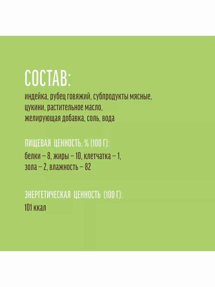 | Состав | индейка, рубец говяжий, субпродукты мясные, цукини, растительное масло, желирующая добавка, соль, вода |