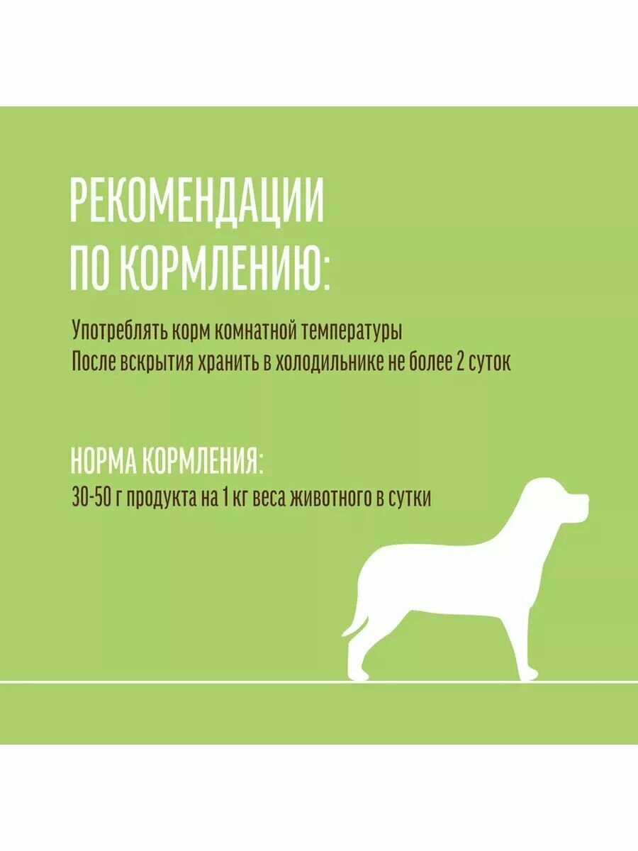 | Инструкция по кормлению | Суточная норма - 30-50 г на килограмм веса собаки. Употреблять корм комнатной температуры. |