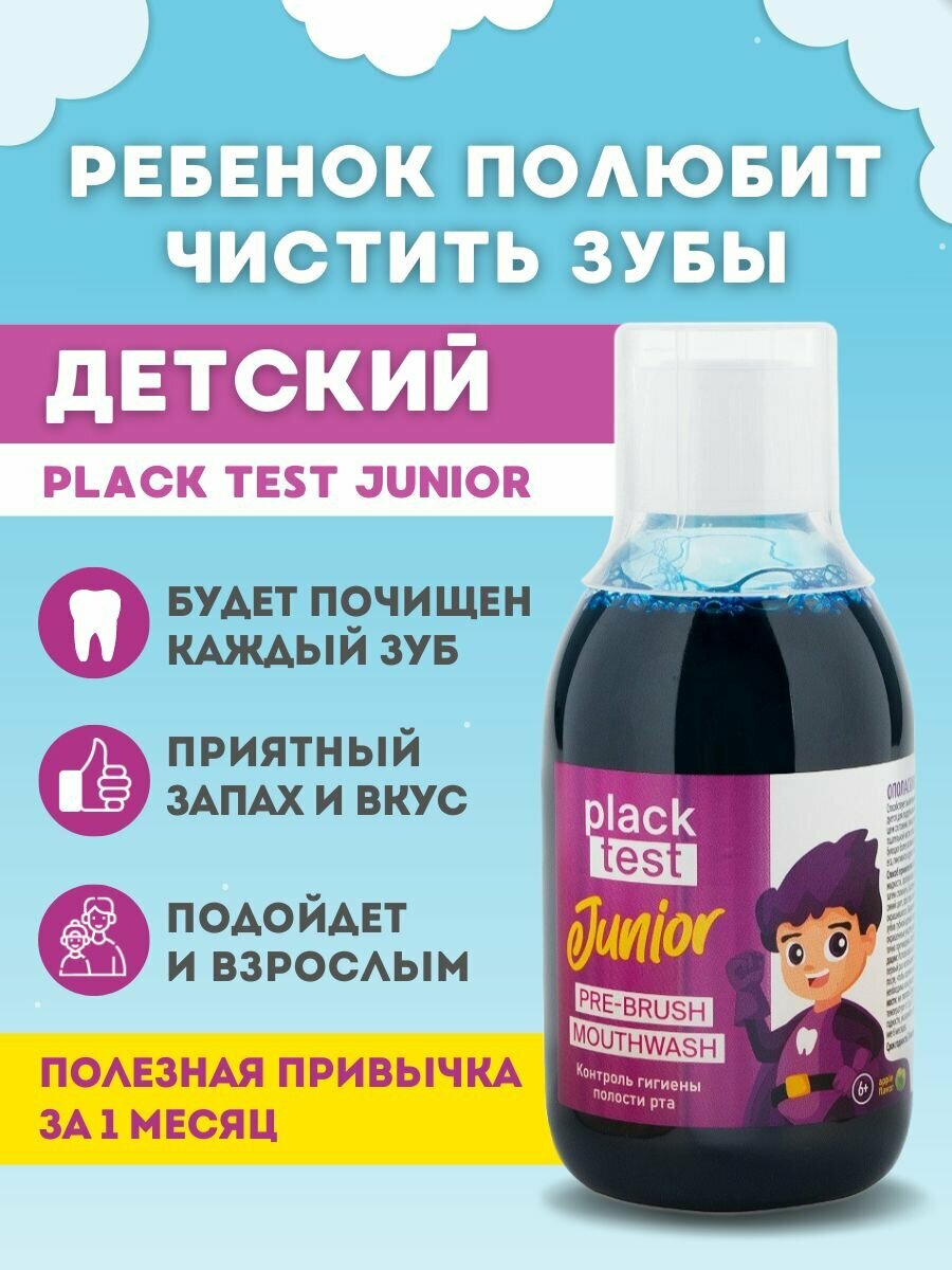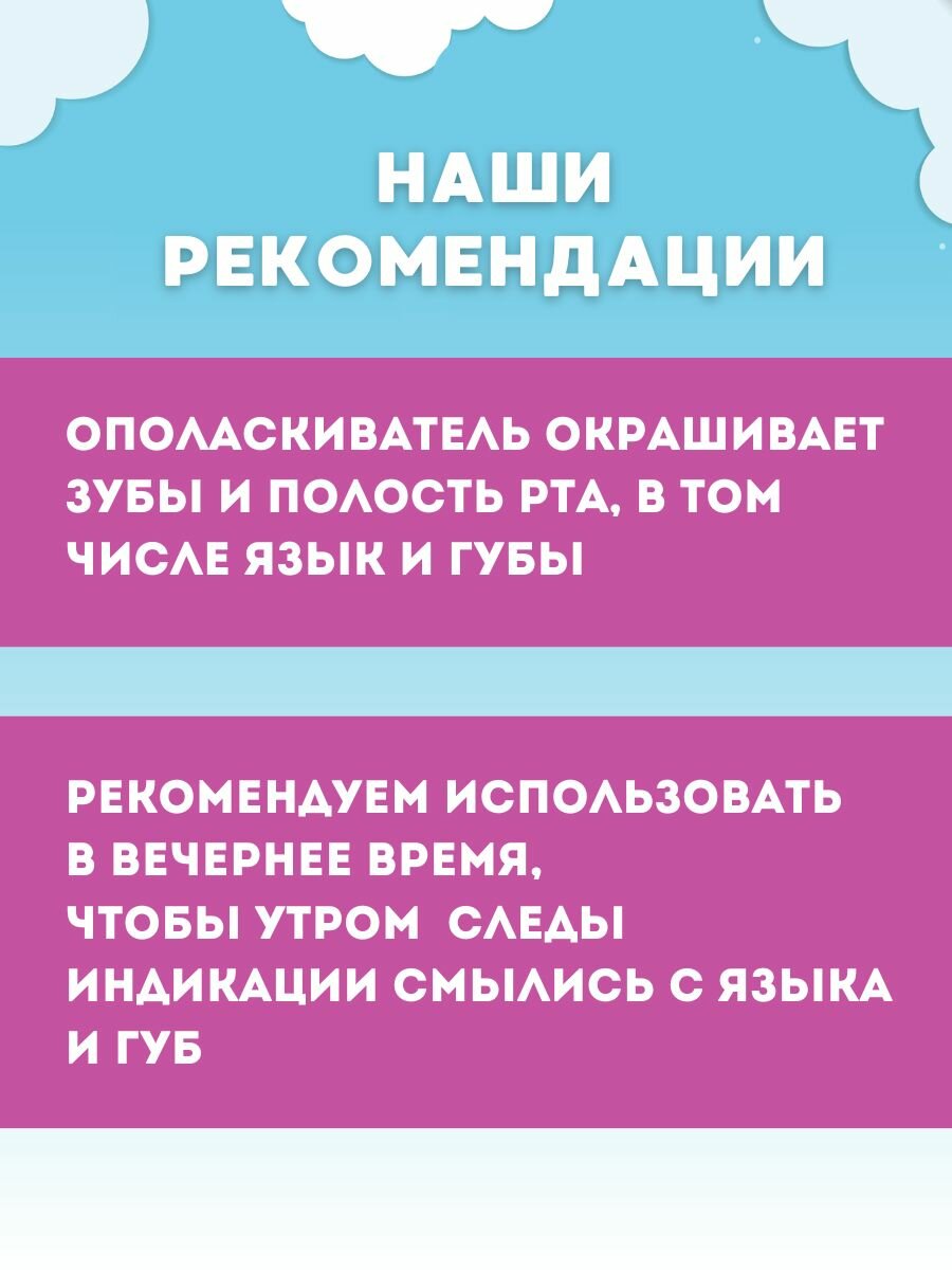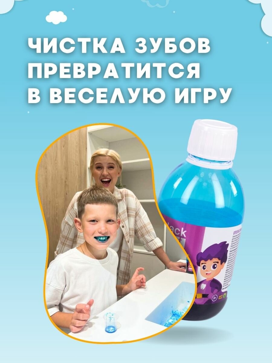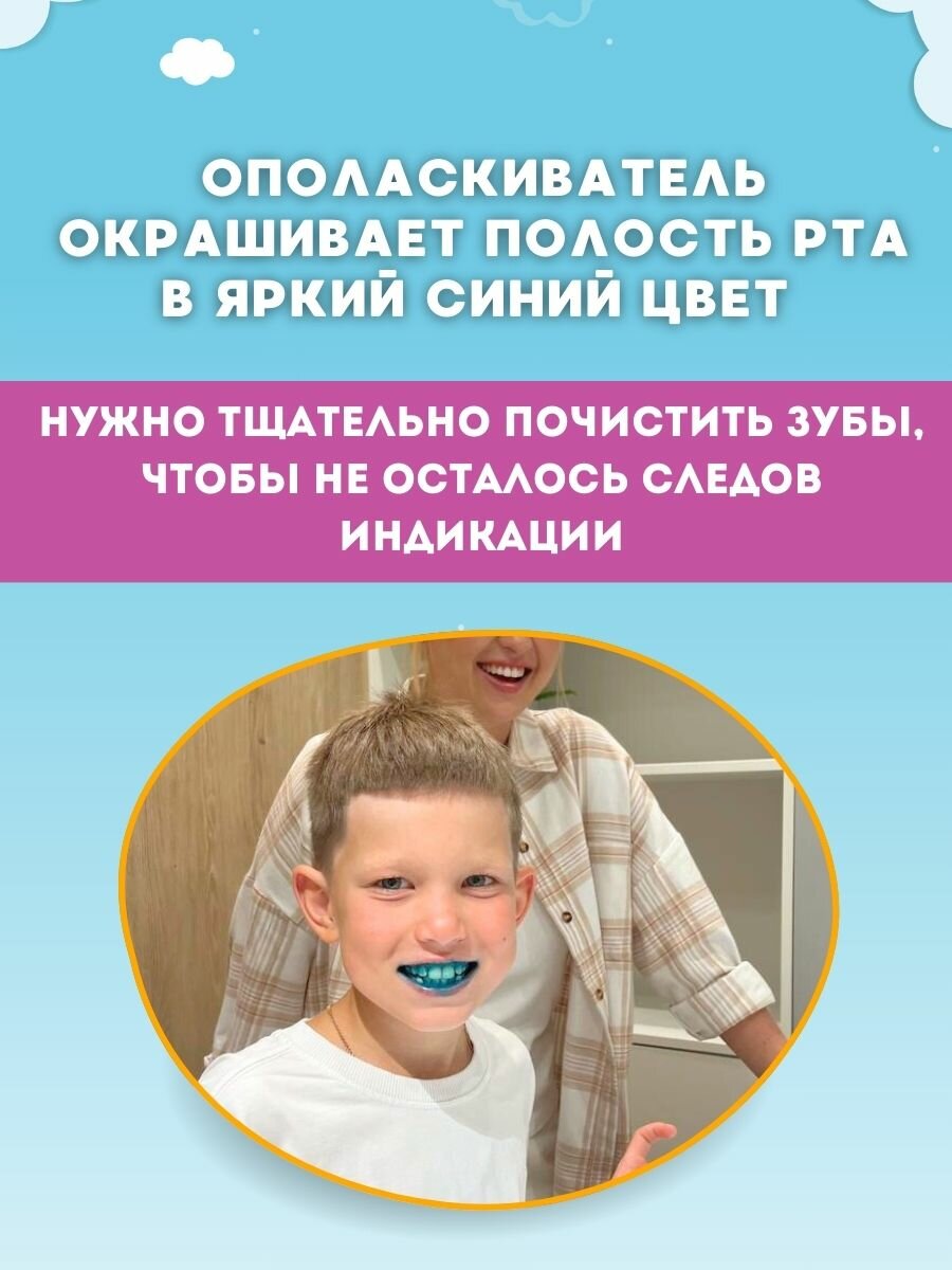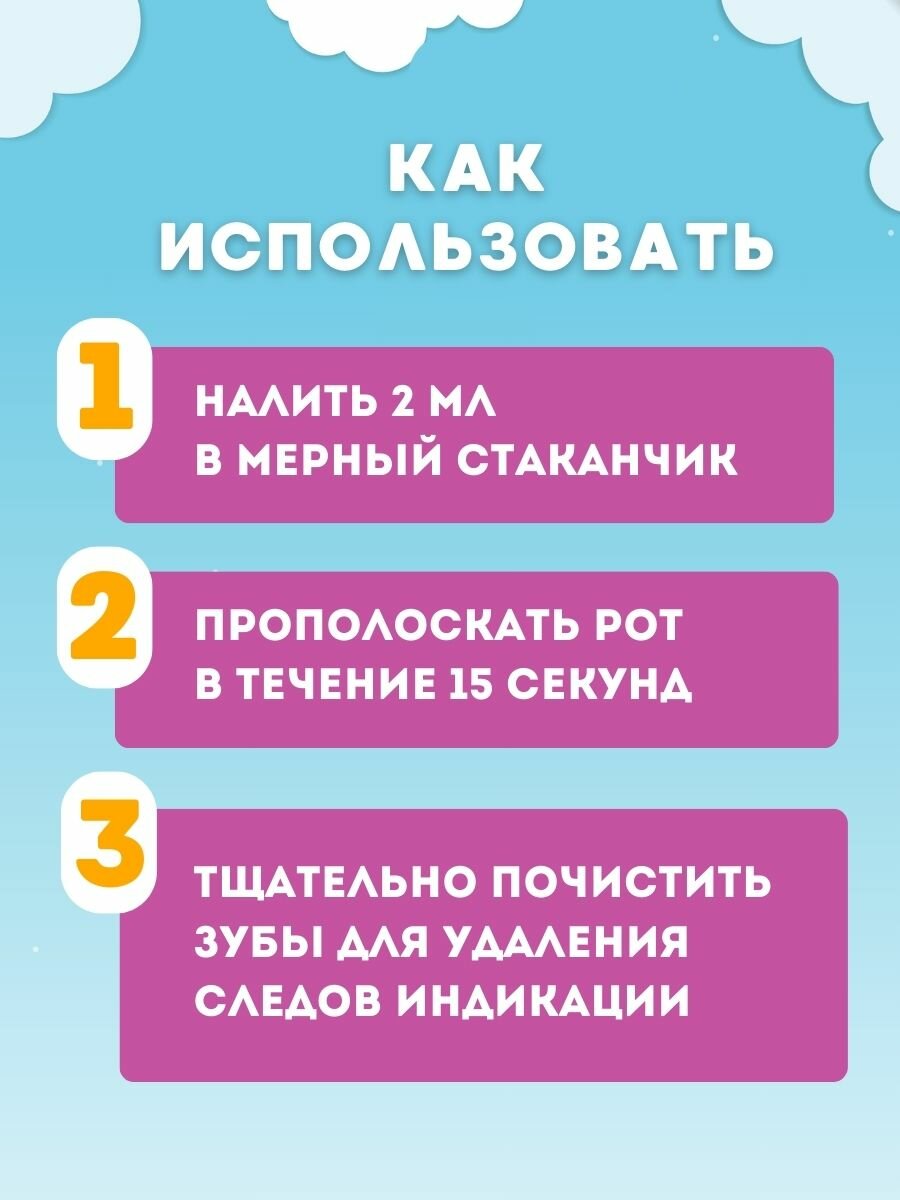 Приучает детей к чистке зубов.Ваш ребенок полюбит чистить зубы!Способ применения-Набрать в мерный стаканчик 2-2.5 мл жидкости, прополоскать ротовую полость в течение 15 секунд, затем сплюнуть. -Полость рта окрасится в синий цвет-Выявленный налет удалить обычной чисткой зубов зубной щеткой и пастой.-Оставшиеся после чистки зубов окрашенные участки указывают, что эти участки были недостаточно прочищены и требуют дополнительной чистки.Рекомендации:-Использовать строго под присмотром взрослых! Меры предосторожности:-Не глотать! Предназначен для детей с 6 лет. Без спирта, без глютена, без фтораСрок годности 24 месяца