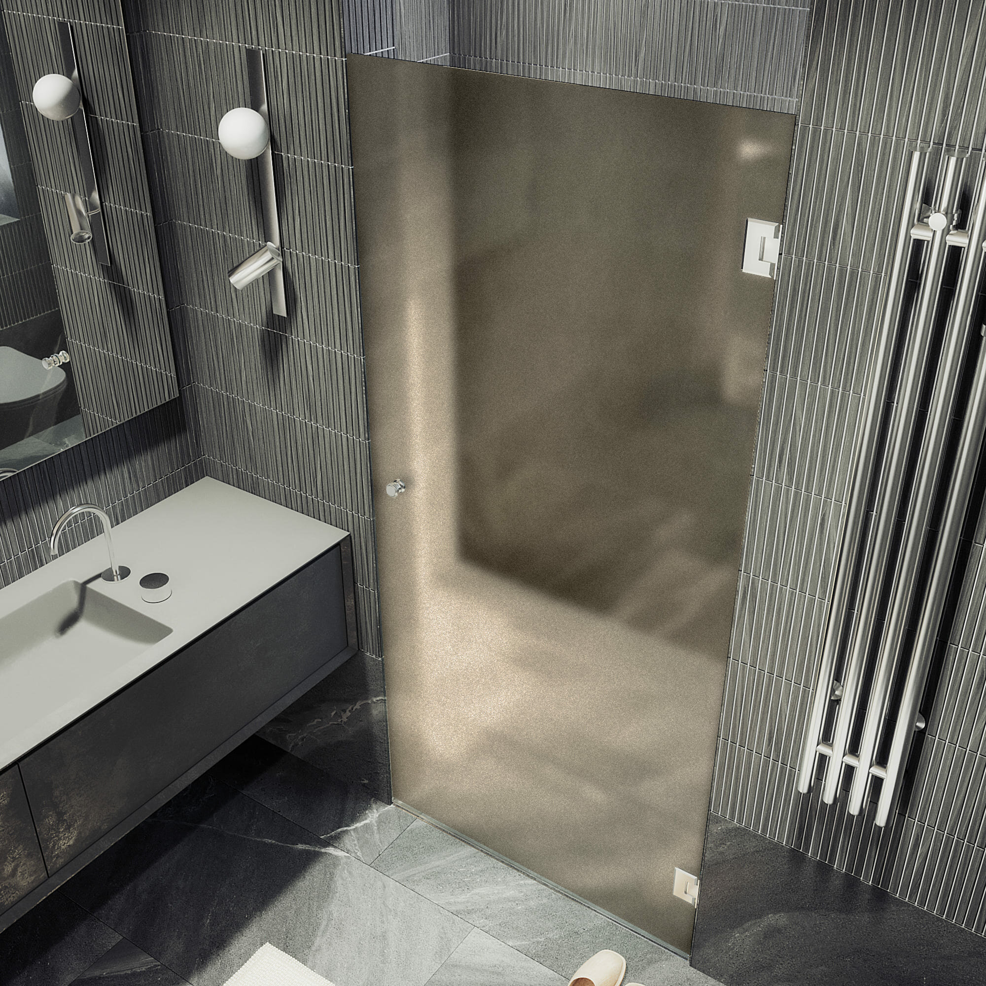 - Исполнение полотна двери: бронзовое матовое закаленное стекло, толщиной 8 мм.