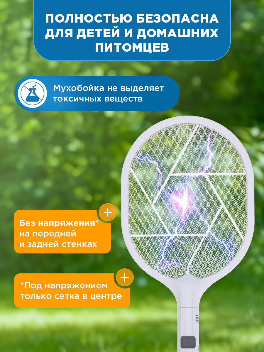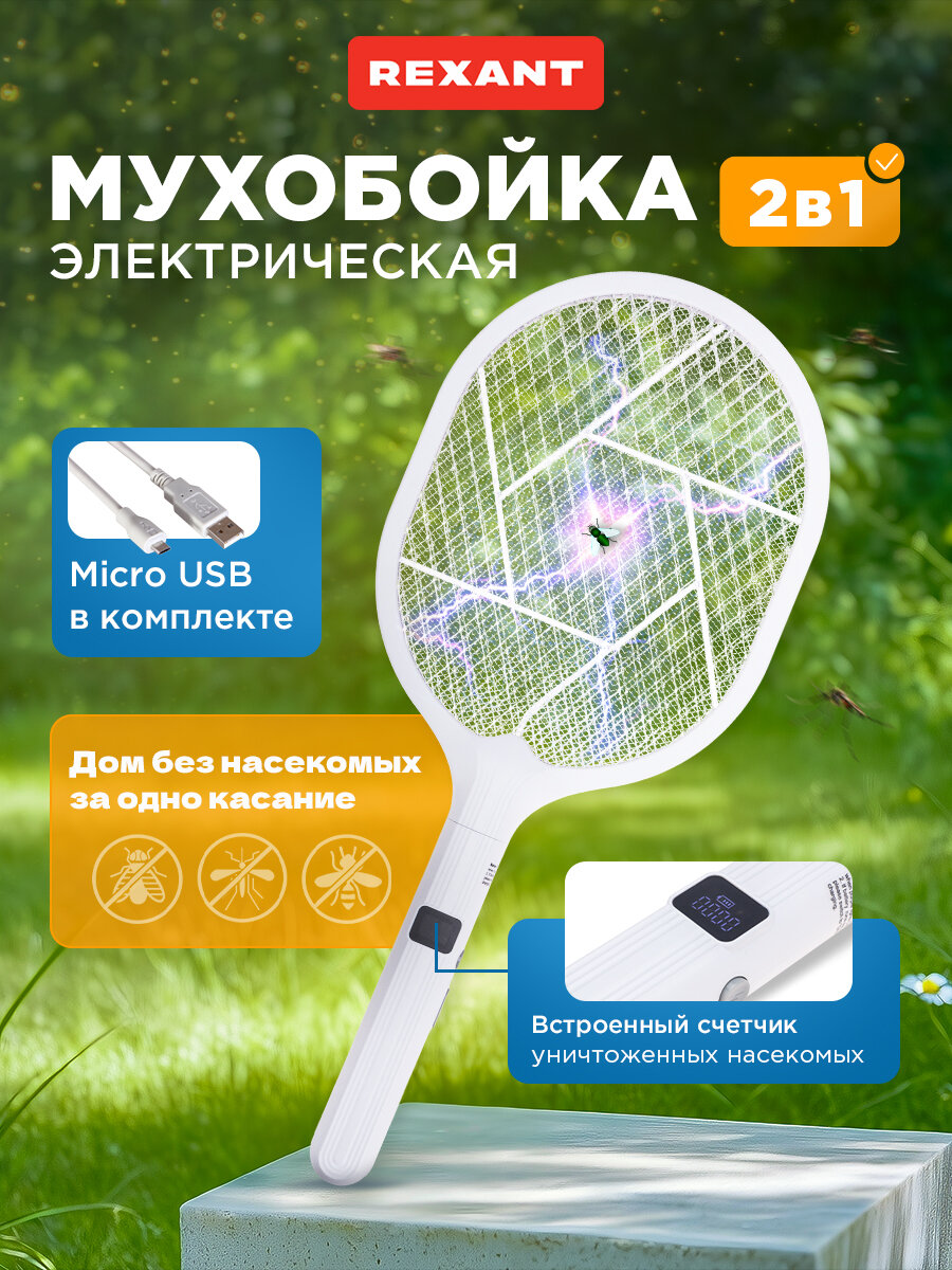 Электрическая мухобойка Rexant по внешнему виду похожа на ракетку для бадминтона. При нажатии кнопки на внутреннюю сетку подается ток (800 В), в результате насекомое при контакте с ней получает удар током. Наружные сетки являются защитными и на них ток не поступает. Благодаря большой контактной сетке насекомых легко ловить. Мухобойка не оставляет кровавых пятен на стенах, потолке и шторах. Электрическое устройство не выделяет вредных веществ и не имеет специфического запаха.