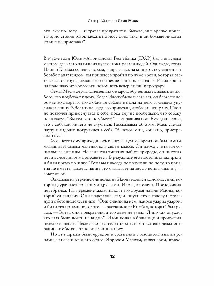 Чтобы ответить на этот вопрос и понять, кто такой Илон Маск в реальной жизни, Уолтер Айзексон на два года стал фактически его тенью, присутствовал на его встречах, проводил с ним десятки интервью. Маск предоставил писателю беспрецедентный доступ к своей переписке, а также настоятельно рекомендовал своим друзьям, коллегам, родственникам, противникам и бывшим женам не уходить от разговора с ним. Он не просил прочитать книгу до публикации и никак не влиял на ее содержание. В результате получился беспристрастный портрет одного из самых неоднозначных героев нашего времени.