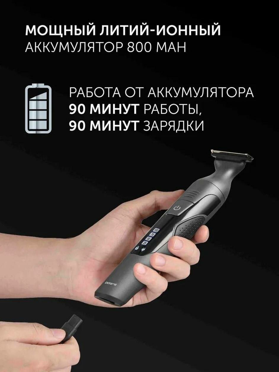 Профессиональный триммер Polaris PHC 1704 станет незаменимым помощником в уходе за вашей бородой и усами. Имеет технология Ultra Blade – супертонкое плавающее лезвие с особой конструкцией для идеальной гладкости кожи. Благодаря аккумулятору Li-Ion 14500 с ёмкостью 800 мАч и напряжением 3.7 В, вы получите долгое время работы без подзарядки. Smart насадка с регулировкой гребня позволит вам легко достичь необходимой длины стрижки в диапазоне от 0.5 до 9 мм. Высокая скорость зарядки 90 минут и автономная работа до 90 минут обеспечивают непрерывное использование устройства. Благодаря быстрой зарядке на 1 бритье всего за 5 минут, вы можете быть уверены, что ваш триммер всегда будет готов к работе. Цифровой дисплей позволяет точно контролировать уровень заряда, а влагозащита по стандарту IPX6 обеспечивает безопасное промывание под проточной водой. В комплекте с электрической бритвой поставляется USB-кабель, масло для ухода за лезвием, щетка для чистки, а также дополнительное лезвие и дорожный твердый чехол, который обеспечит безопасное хранение и транспортировку устройства. Станьте обладателем идеально сбалансированного триммера, который сделает процесс стрижки бороды и усов максимально комфортным и эффективным.