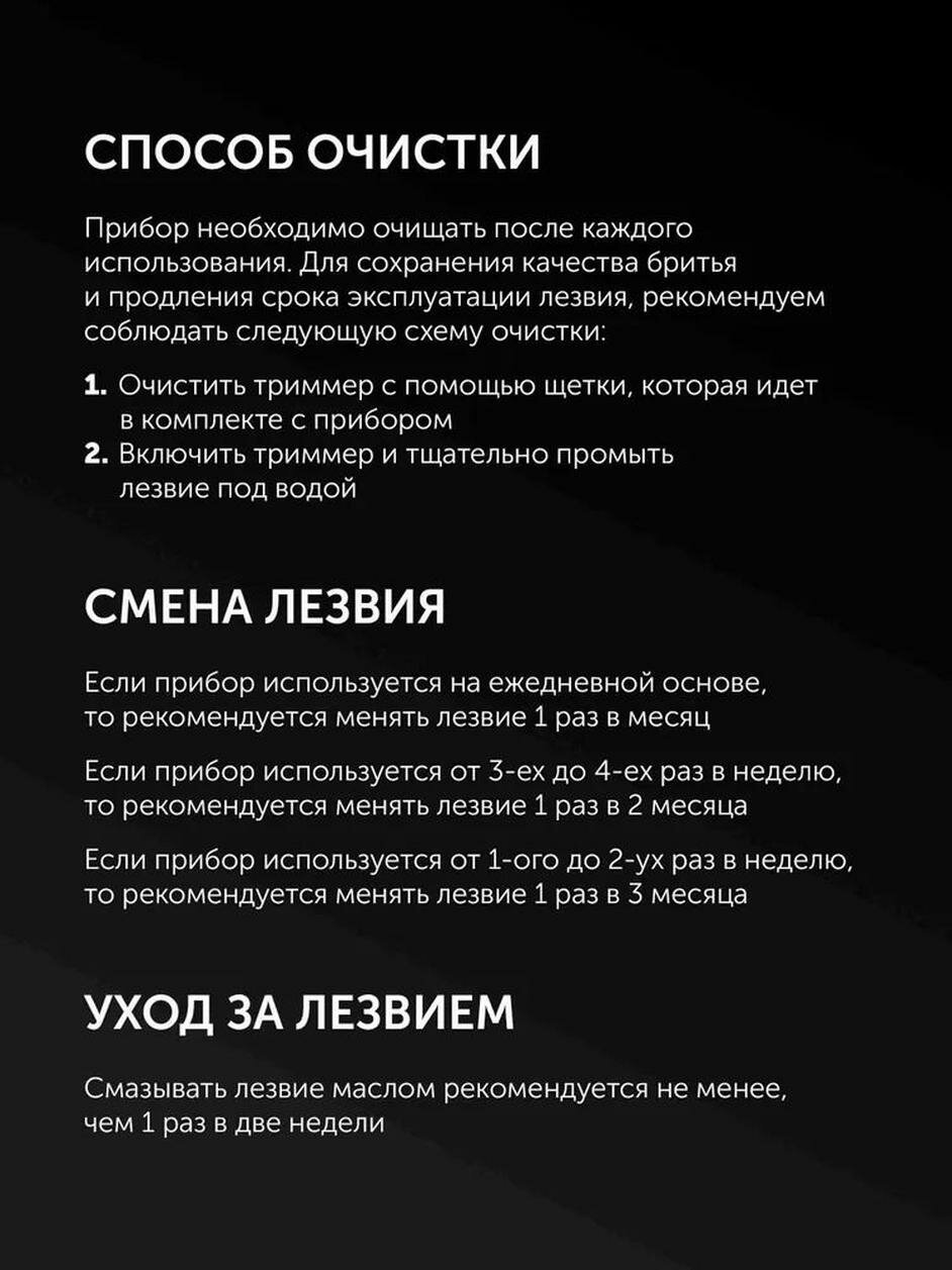 | Комплект поставки | Твердый кейс для хранения, зарядный адаптер, usb-шнур, щеточка для очистки, масло, 1 дополнительный режущий блок |