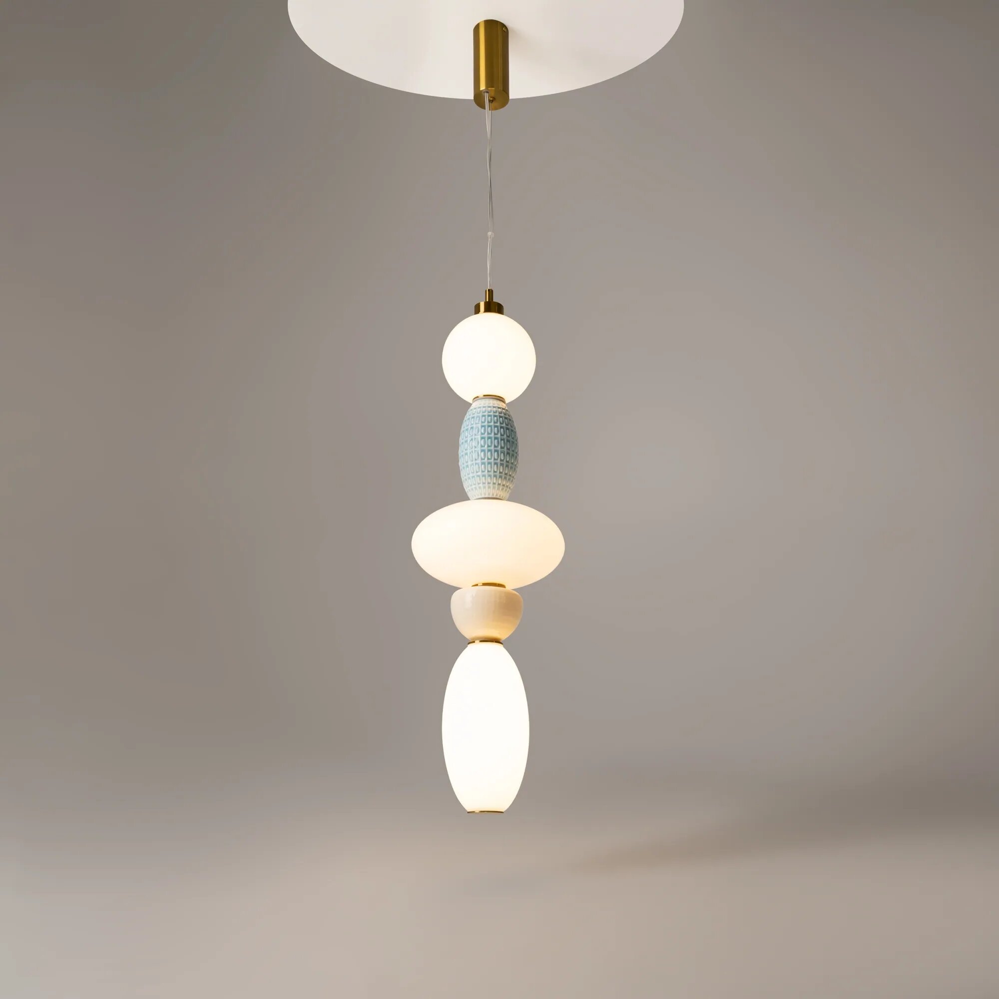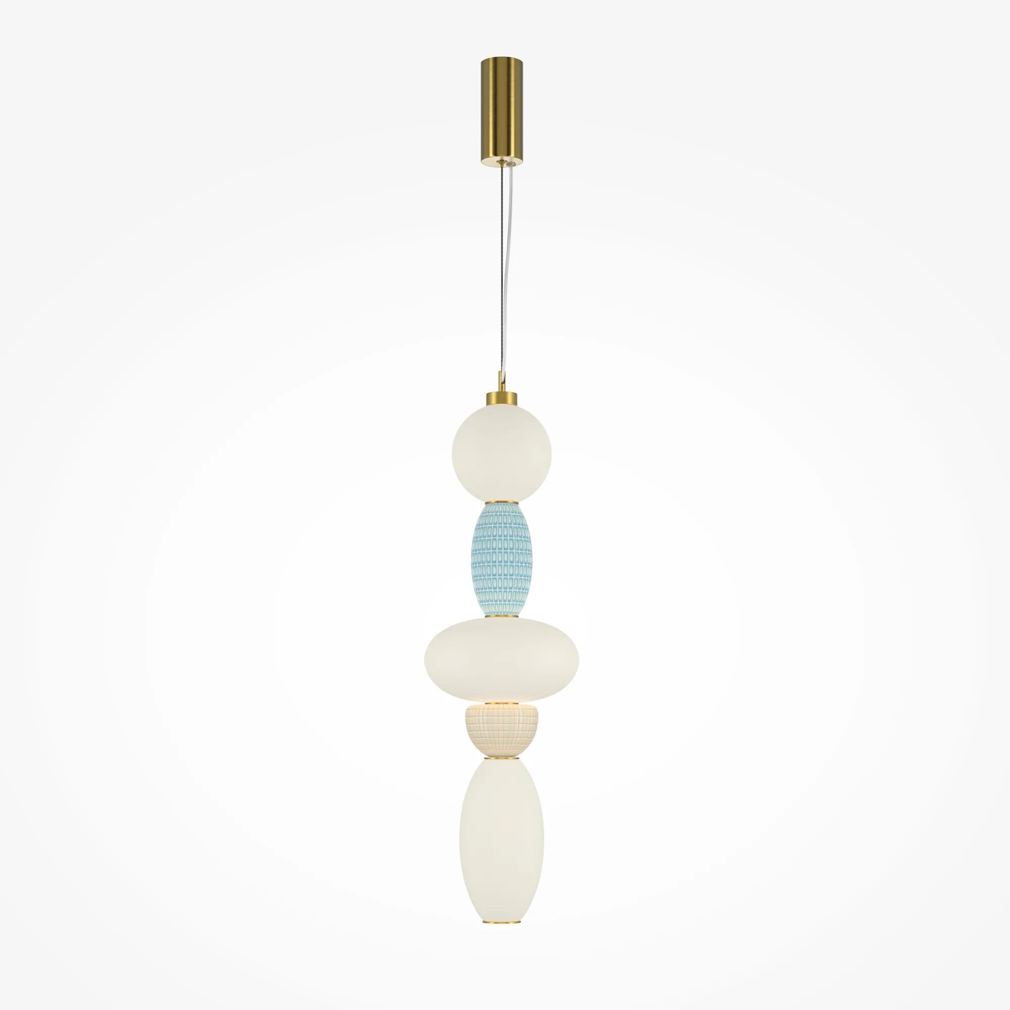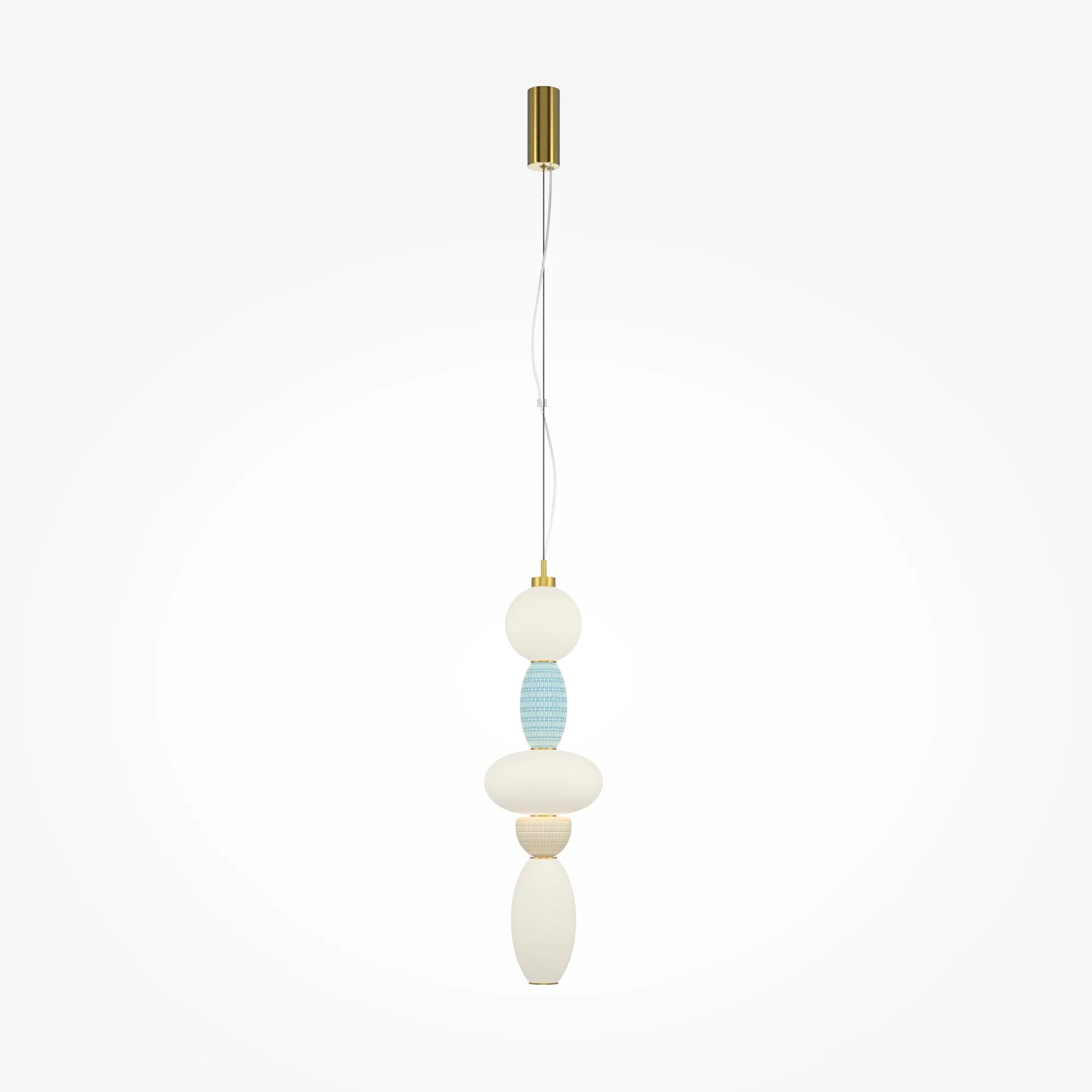 Металлическая арматура цвета латуни. Плафоны из белого стекла для мягкого, равномерного освещения, декоративные элементы из цветной керамики. Угол рассеивания 120°. Цветовая температура – 3000 К. Регулируемый провод длиной 3 м.