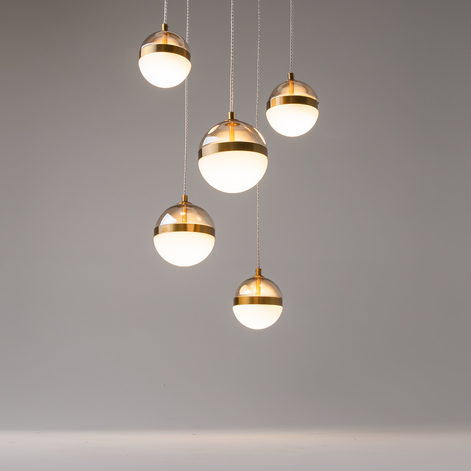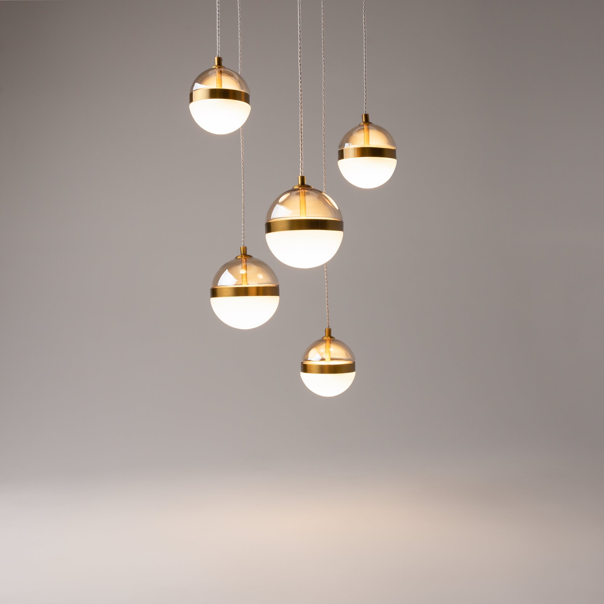 Черная потолочная чаша дополнена финишным антибликовым покрытием sandy, декоративный элемент плафона выполнен из металла цвета сатинированной латуни. Сочетание двух фактурных стекол в плафоне: нижняя полусфера из матового белого стекла для создания мягкого рассеянного света, верхняя часть плафона - из тонированного янтарного стекла. Внутри установлен LED-модуль, создающий равномерное освещение, направленное вверх и вниз. Цветовая температура – 3000К, угол рассеивания — 120°.
