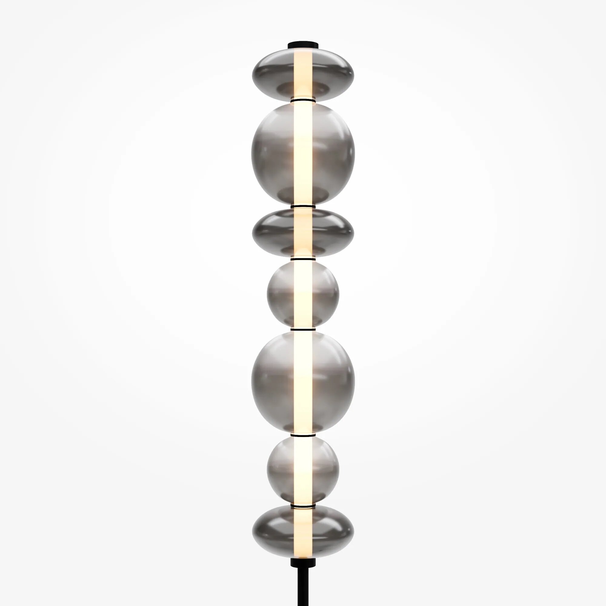 Светильники с тонированными выдувными стеклянными плафонами (дымчатыми или янтарными) и металлической арматурой (черной или цвета латуни). Окрашивание плафонов градиентное. Источник света: LED. Световой элемент установлен внутри акрилового рассеивателя. Цветовая температура источника света – 3000К, угол рассеивания — 120°. Торшеры снабжены Push-кнопкой на проводе.