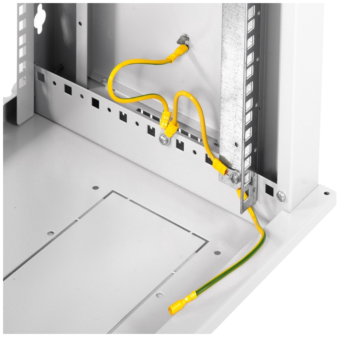 Настенный шкаф 19 ШРН-Э имеет полностью разборную конструкцию и состоит из пяти основных частей: крыша, дно, две передние направляющие, две боковые стенки c вертикальными направляющими, дверь. Настенный шкаф 19 ШРН-Э легок в сборке. За счет элементов крепления каркас шкафа имеет повышенную жесткость. Возможна комплектация металлической дверью и дверью с тонированным стеклом. Возможна установка двери как с правой, так и с левой стороны. Дверь фиксируется точечным замком. Предусмотрены два кабельных ввода в верхней и нижней частях шкафа, размер - 95х40мм. Перфорация обеспечивает хорошую вентиляцию установленного оборудования. В основание или крышу шкафа возможна установка вентиляторного модуля МВ-400-2. Для установки модуля демонтируется заглушка, и модуль фиксируется шестью винтами. Вертикальные направляющие регулируются по глубине. Система заземления входит в стандартную комплектацию. Возможна установка задней стенки.