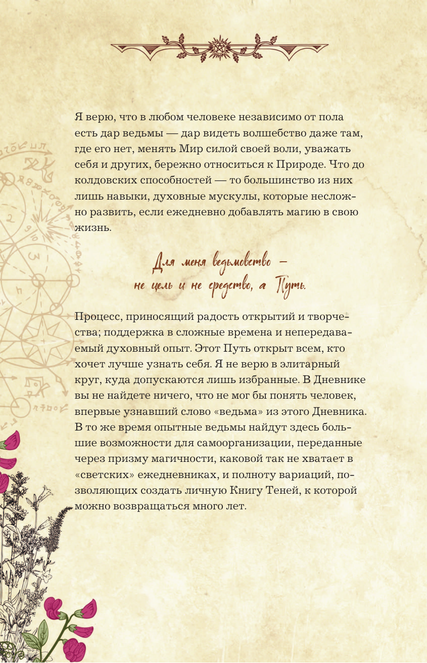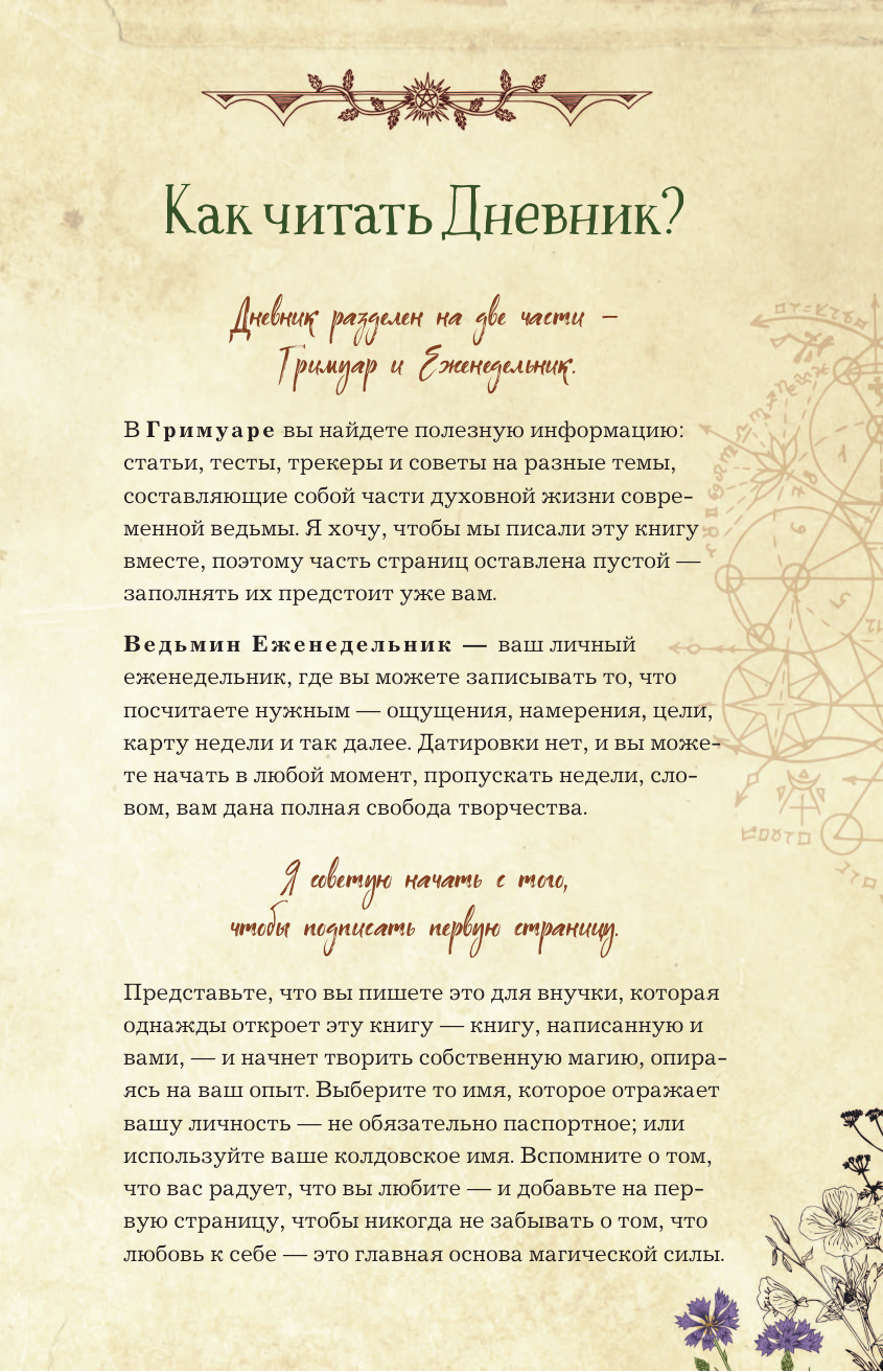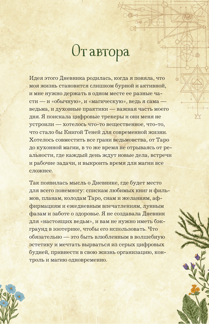 «Дневник современной ведьмы» — синтез Книги Теней, личного дневника и журнала для заметок, где вы станете и читателем, и соавтором, и творцом своего волшебного мира. Внутри — статьи, тесты, трекеры и советы на разные темы, составляющие собой важные вехи духовной жизни ведьмы. Часть страниц оставлена пустой — заполнить их предстоит вам. Таро, магия мысли и аффирмации, травы и минералы, история ведьмовства и виды ведьм, Колесо Года и духовное здоровье, лунные циклы и защитная магия, и даже «немагические» способы влияния на состояние — всему нашлось место! Вторая половина «Дневника» — недатированный еженедельник для фиксации планов и результатов недели и всего, что вы посчитаете нужным, от карты недели до текущих задач, от лунного дня до эмоций и ощущений.