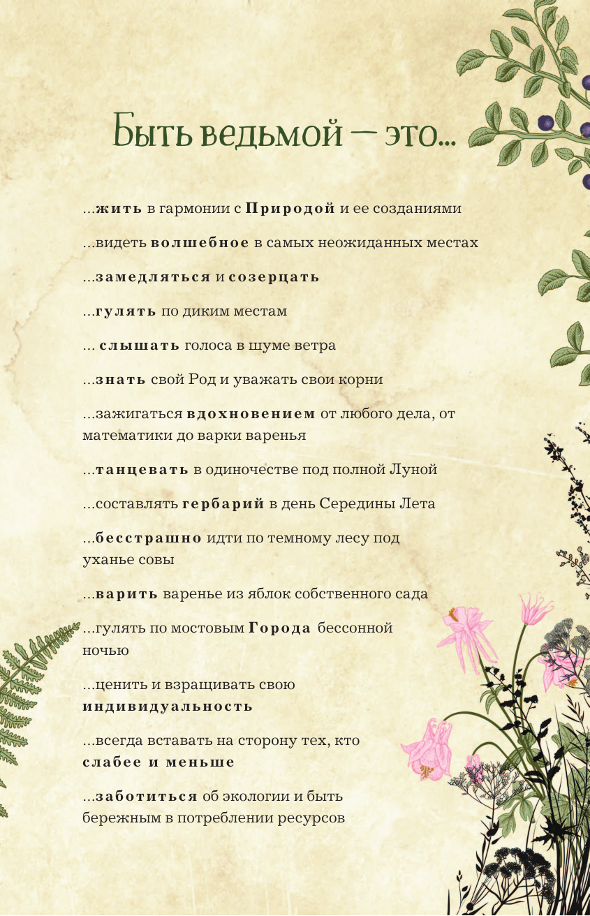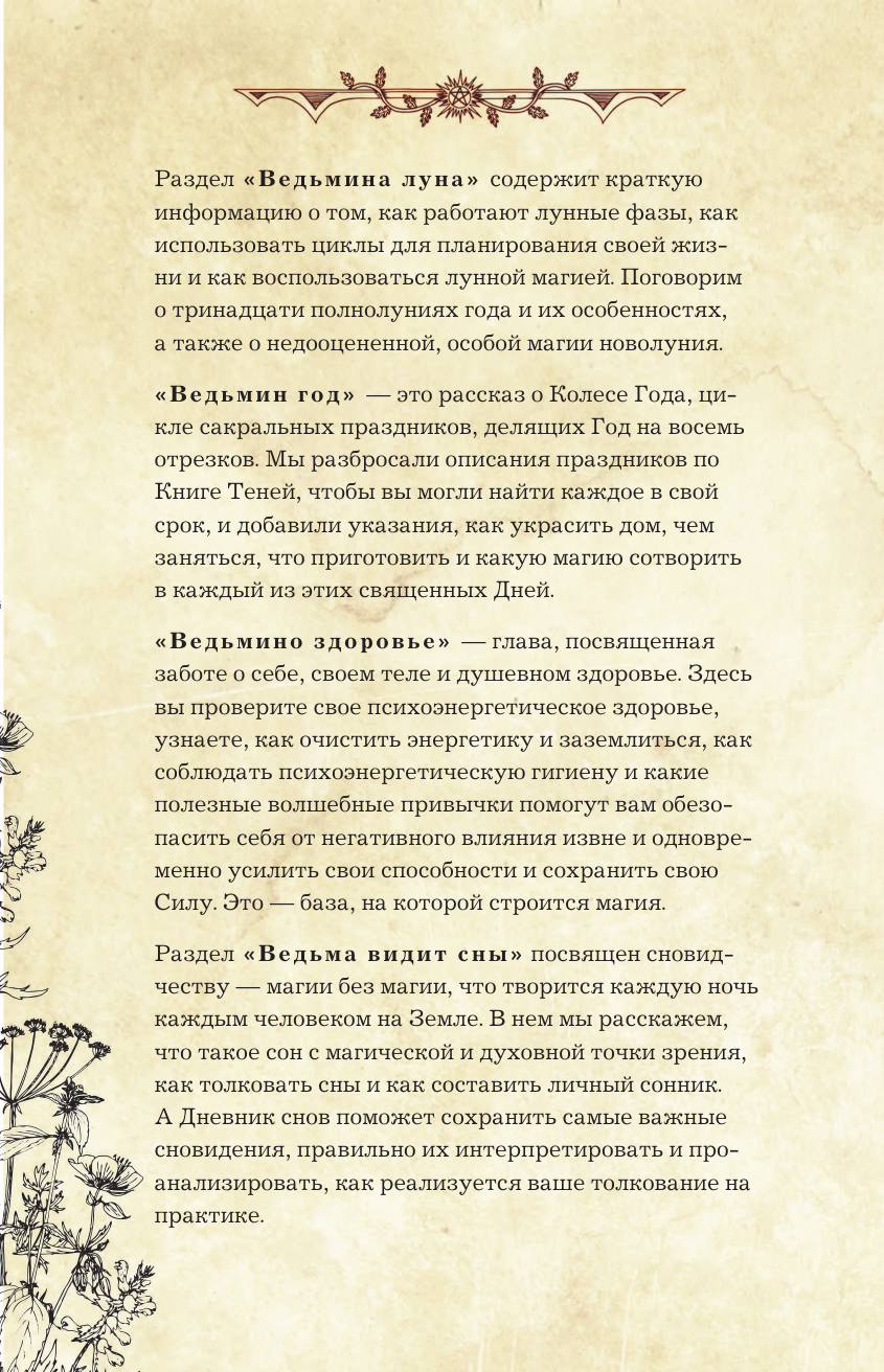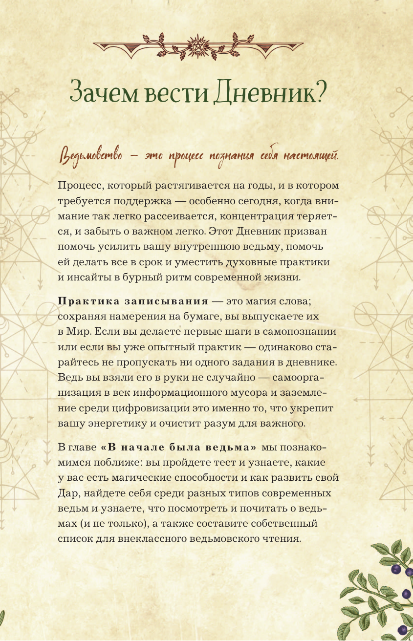 «Дневник современной ведьмы» — синтез Книги Теней, личного дневника и журнала для заметок, где вы станете и читателем, и соавтором, и творцом своего волшебного мира. Внутри — статьи, тесты, трекеры и советы на разные темы, составляющие собой важные вехи духовной жизни ведьмы. Часть страниц оставлена пустой — заполнить их предстоит вам. Таро, магия мысли и аффирмации, травы и минералы, история ведьмовства и виды ведьм, Колесо Года и духовное здоровье, лунные циклы и защитная магия, и даже «немагические» способы влияния на состояние — всему нашлось место! Вторая половина «Дневника» — недатированный еженедельник для фиксации планов и результатов недели и всего, что вы посчитаете нужным, от карты недели до текущих задач, от лунного дня до эмоций и ощущений.