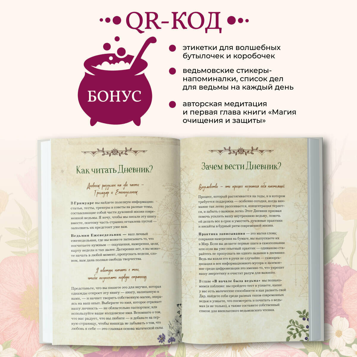 В книге вас ждет бонус от автора — QR-код, где вы найдете подарки и материалы для распечатки: ведьмовские стикеры-напоминалки, список дел для ведьмы на каждый день, этикетки для волшебных бутылочек и коробочек, авторскую аудиомедитацию и первую главу книги «Магия очищения и защиты».
