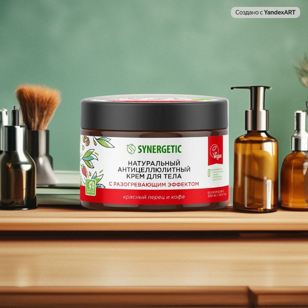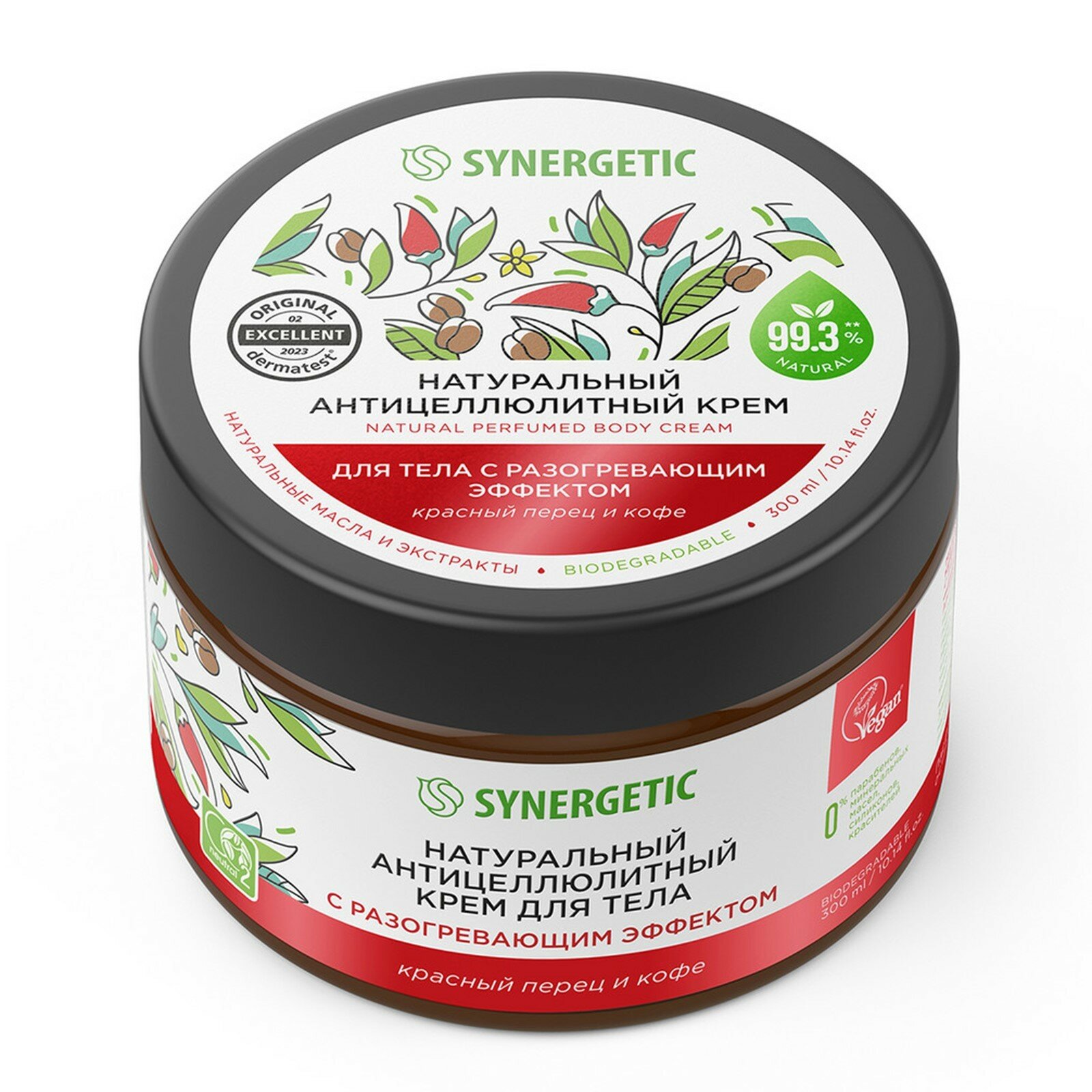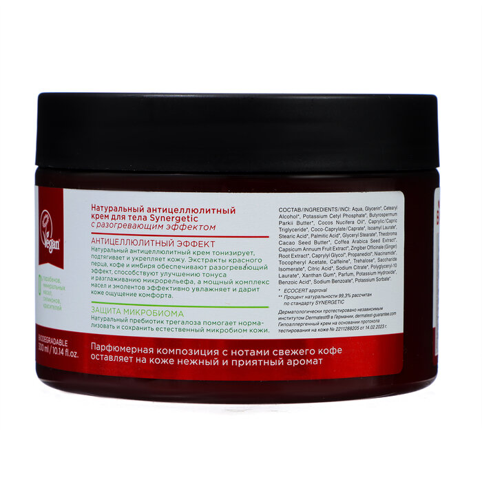Антицеллюлитный крем SYNERGETIC изготовлен из натуральных ингредиентов и обеспечивает эффективный уход за кожей. Он активно тонизирует, укрепляет и улучшает состояние кожи. Компоненты крема, включая изомерат сахарида, сохраняют влагу в коже, восстанавливают её барьерные функции и стимулируют регенерацию. Экстракты красного перца, кофе и имбиря оказывают разогревающее действие на кожу, разглаживают и улучшают ее общий тонус. Масла карите, кокоса и какао, а также эмоленты увлажняют кожу и дарят ей ощущение комфорта. Натуральный пребиотик трегалоза поддерживает естественный микробиом кожи. Безопасная формула без парабенов, минеральных масел, силиконов, красителей и компонентов животного происхождения соответствует стандартам качества. Крем не тестируется на животных и сертифицирован британской организацией The Vegan Society. Дерматологические испытания продукта проводил независимый институт Dermatest® в Германии.