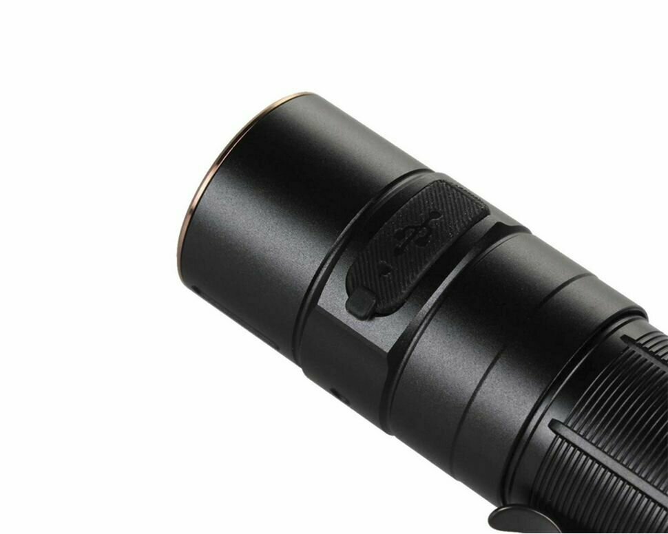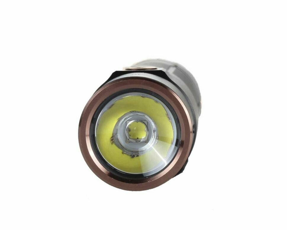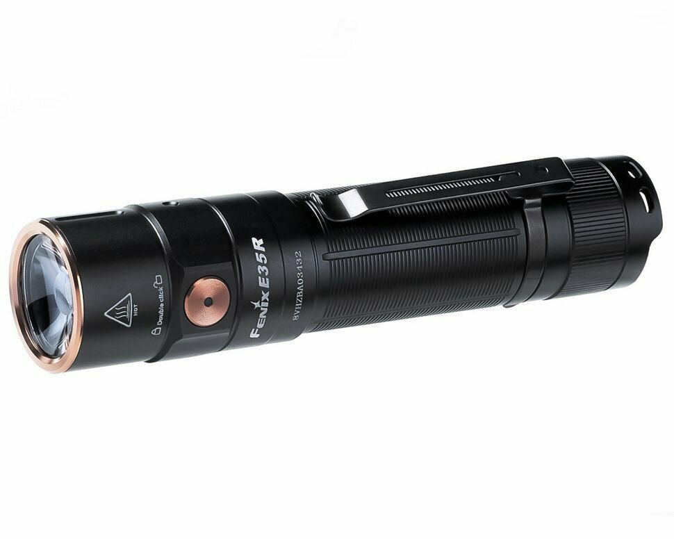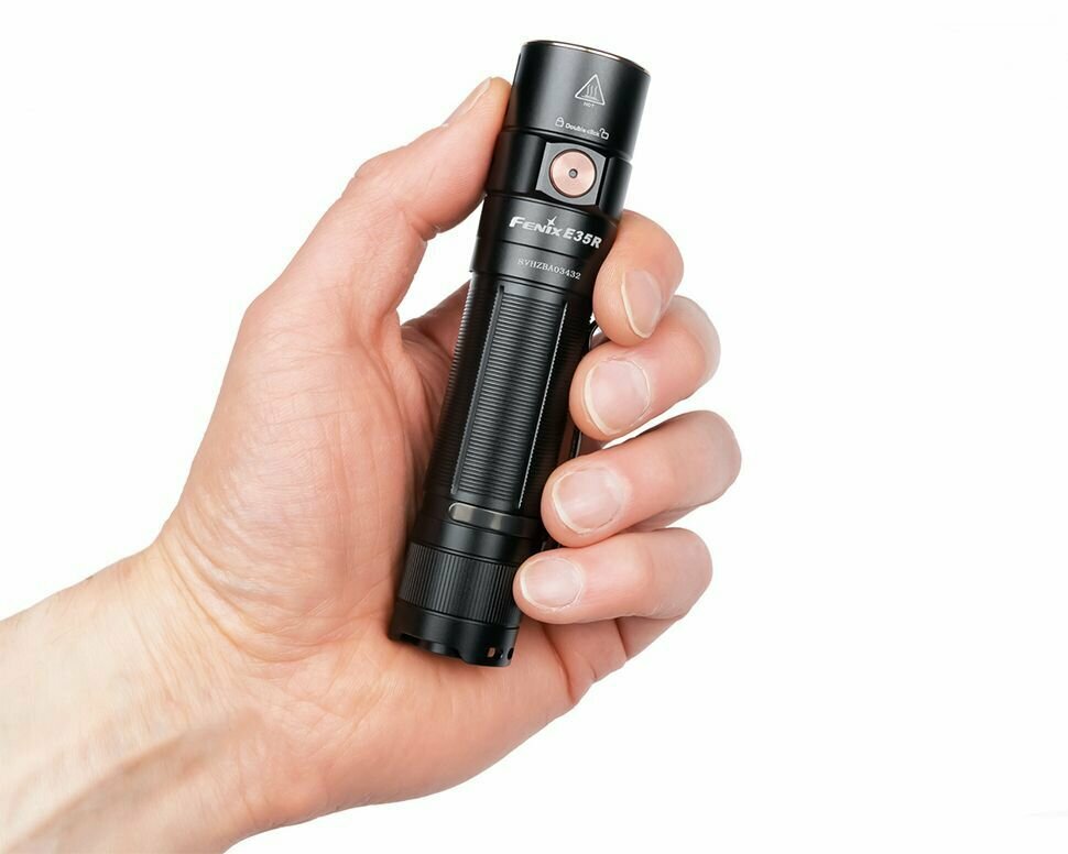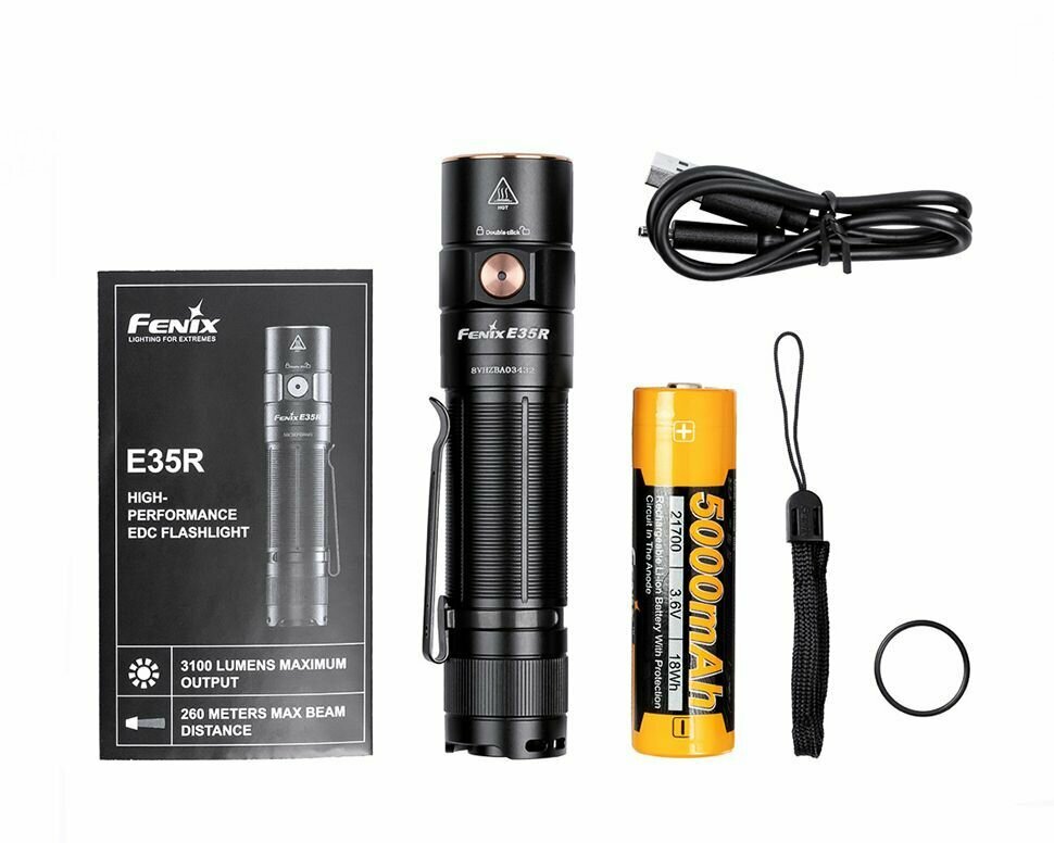 Усовершенствованная версия фонаря E35 V3.0, модель Fenix E35R, обладает впечатляющей яркостью, равной 3100 люменам. Данный наключный фонарь сохранил портативность конструкции, которая легко помещается в ладони и может использоваться как в быту, так и в полевых условиях. Диод Luminus SST70 в совокупности с оптической TIR линзой излучает приятный для человеческого зрения свет. Если использовать фонарь вместе с рассеивателем (приобретается отдельно), то владелец получит мягкую подсветку широкой области, а в обычном режиме дальность луча может достигать отметки в 260 метров. Режимы работы Доступные уровни света переключаются боковой кнопкой медного цвета, который выделяется на фоне черного корпуса. Среди трех пар режимов есть пять стандартных яркостей мощностью от 30 люменов и выше. Также присутствует тактический режим стробоскоп, который можно применять в качестве маячка или средства для отпугивания диких животных в туристическом лагере. Турбо: 3100 люмен – 260 метров – 2 часа 30 минут; Высокий: 1000 люмен – 138 метров – 3 часа 40 минут; Средний: 350 люмен – 80 метров – 9 часов 20 минут; Низкий: 150 люмен – 54 метра – 21 час 20 минут; Экономный: 30 люмен – 25 метров – 69 часов; Стробоскоп: 3100 люмен. При эксплуатации фонаря нужно учитывать наличие технологии IOP — современной защиты от перегрева. Она срабатывает каждый раз, когда температура оболочки достигает 60°C, и временно снижает яркость света. Характеристики: ручной фонарь для туризма и повседневного применения; светодиод – Luminus SST70; количество режимов – 6; предельная мощность света – 3100 люменов; дальность освещения составляет 260 метров; интенсивность освещения – 15 103 кандел; боковая кнопка управления с индикатором заряда элемента питания; источник питания – 1 х 21700; зарядка через порт Type-C в течение 3-х часов; материал корпуса – авиационный алюминиевый сплав с анодированием; магнитное основание и съемная клипса, расширяющие вариативность использования; класс герметичности – IP68; ударопрочность – 1.5 метра; размеры – 120 х 26.5 х 24.8 миллиметров; вес – 148 грамм (с учетом аккумулятора из набора).