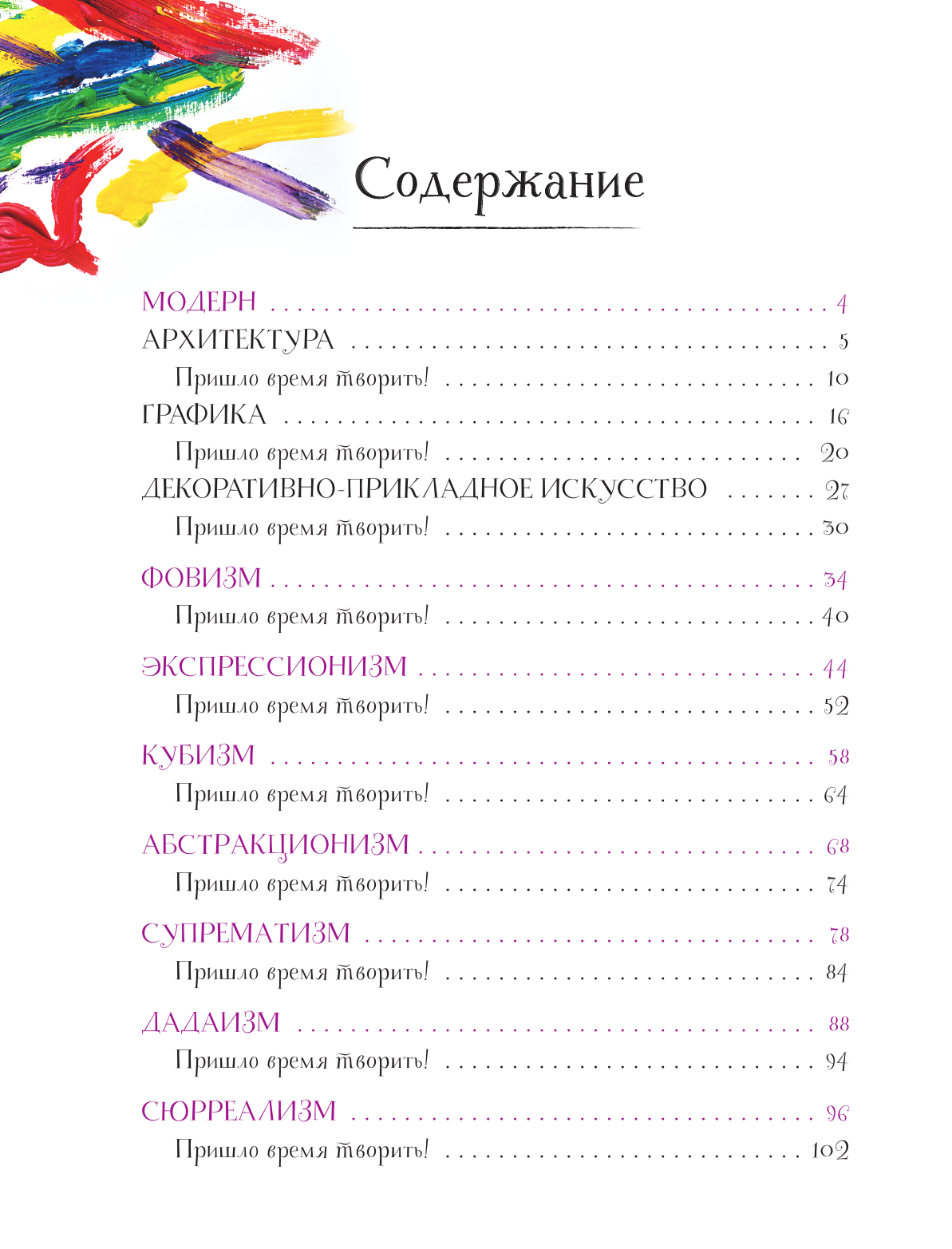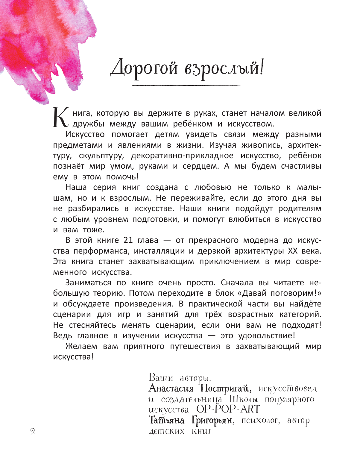 Вы научитесь понимать современное искусство и различать всю многогранность его проявления! А красочные практические задания помогут развить у вашего ребёнка творческое мышление, мелкую моторику, композиционное восприятие и художественный вкус.