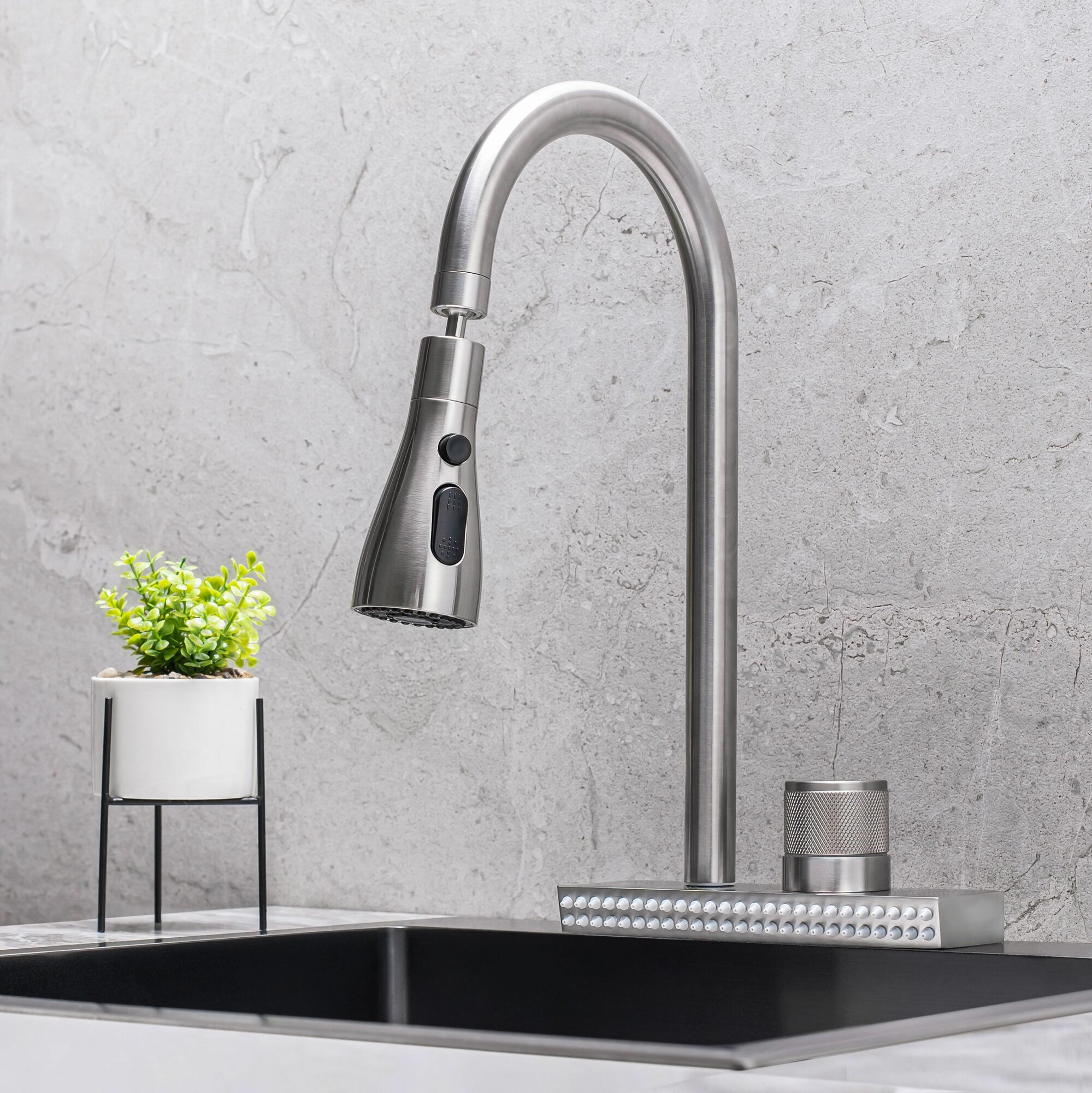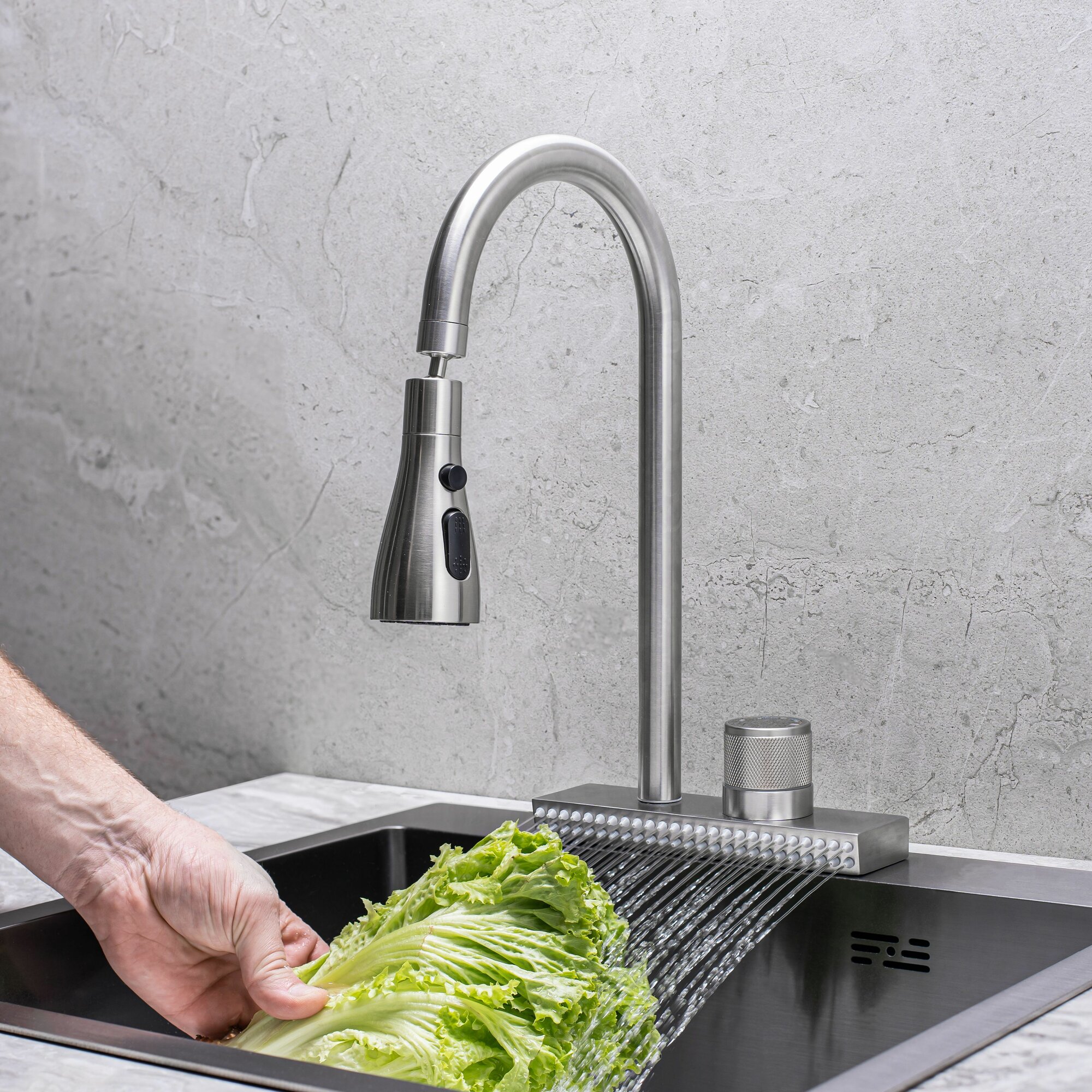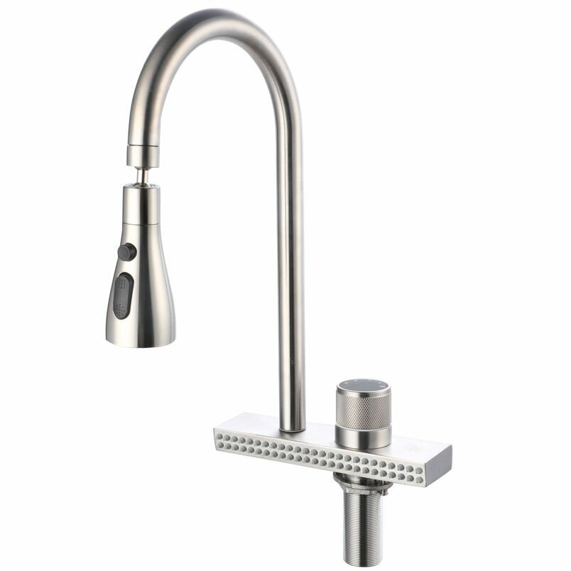 Смеситель с поворотным изливом и душем для мойки зелени, грибов, фруктов и овощей, станет отличным помощников на кухне.Смеситель для кухни из нержавеющей стали с высоким изливом, выполнен в современном дизайне. Он удачно дополнит мойку любого размера и конфигурации.Покупка водосберегающего смесителя 2.0 РМС - выгодное и практичное решение. С ним вы уменьшите плату за воду. Наш смеситель полностью окупает свою стоимость.Со смесителем 2.0 новой линейки РМС вы снизите расход воды до 50%.Смеситель превращает воду на выходе в воздушно-водную смесь, при этом диаметр струи и сила напора сохраняется. Смесители РМС официально признаны самыми экономичными и занесены в Реестр рекордов России.Пользоваться смесителем РМС 2.0 удобно и приятно. Струя смесителя, образует меньше брызг, а значит, уборка на кухне легче и быстрее. Пузырьки воздуха помогают быстрее и эффективнее удалять загрязнения, поэтому моющих средств расходуется меньше.Новые смесители РМС - российская разработка.Смесители устойчивы к царапинам и перепадам температур, экологичны и безопасны для вашего здоровья. Мы используем только проверенные надежные комплектующие.В обновленных смесителях РМС заложена концепция бережливого потребления. Выбирая их, вы не только экономите собственные средства, но и помогаете сберечь такой ценный природный ресурс, как питьевая вода.Состоит из поворотного излива и нижнего блока – душ для фруктов и овощей. Блок оснащен десятками микрофорсунок, создающих мягкий поток, который обволакивает продукты. Под нижним душем удобно мыть руки, ополаскивать бокалы и столовые приборы, ведь он не создает брызг. Насладитесь удобством рабочих процессов в зоне мойки и одновременно бережным расходом воды. Смесители РМС - это сертифицированный продукт с 7-летней гарантией от производителя.Картридж: керамический 35мм.Крепление: гайка.Материал корпуса: нержавеющая сталь.КомплектацияСмеситель, гибкая подводка, крепления, паспорт.