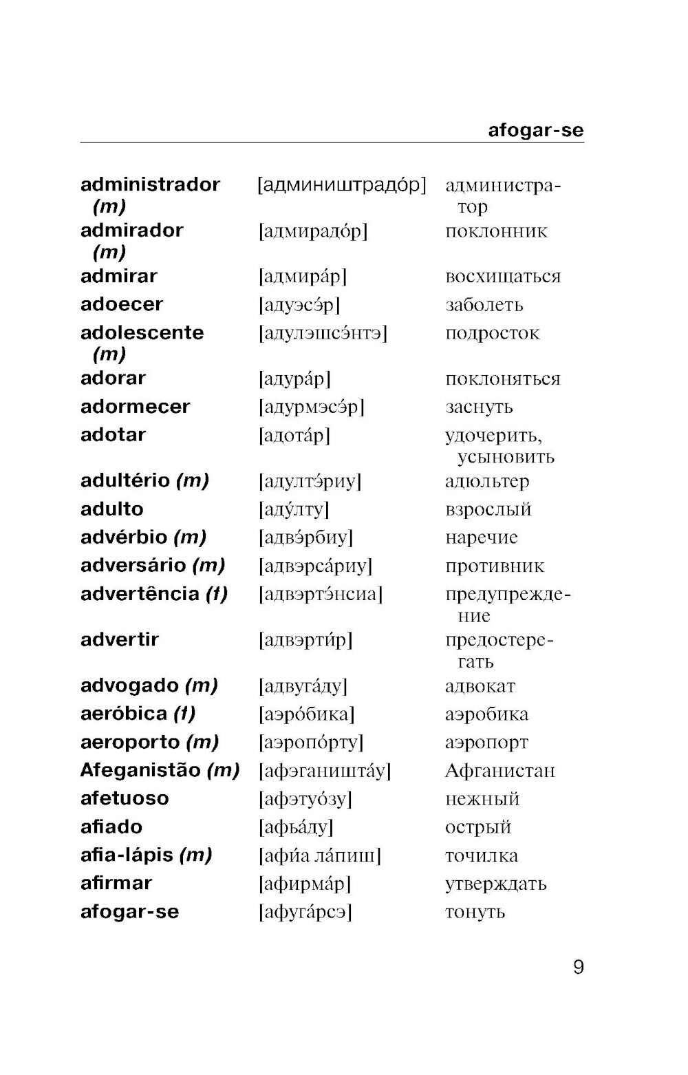Португальско-русская и русско-португальская части словаря содержат примерно 4500 наиболее употребительных слов. Все слова снабжены транскрипцией, прописанной русскими буквами.