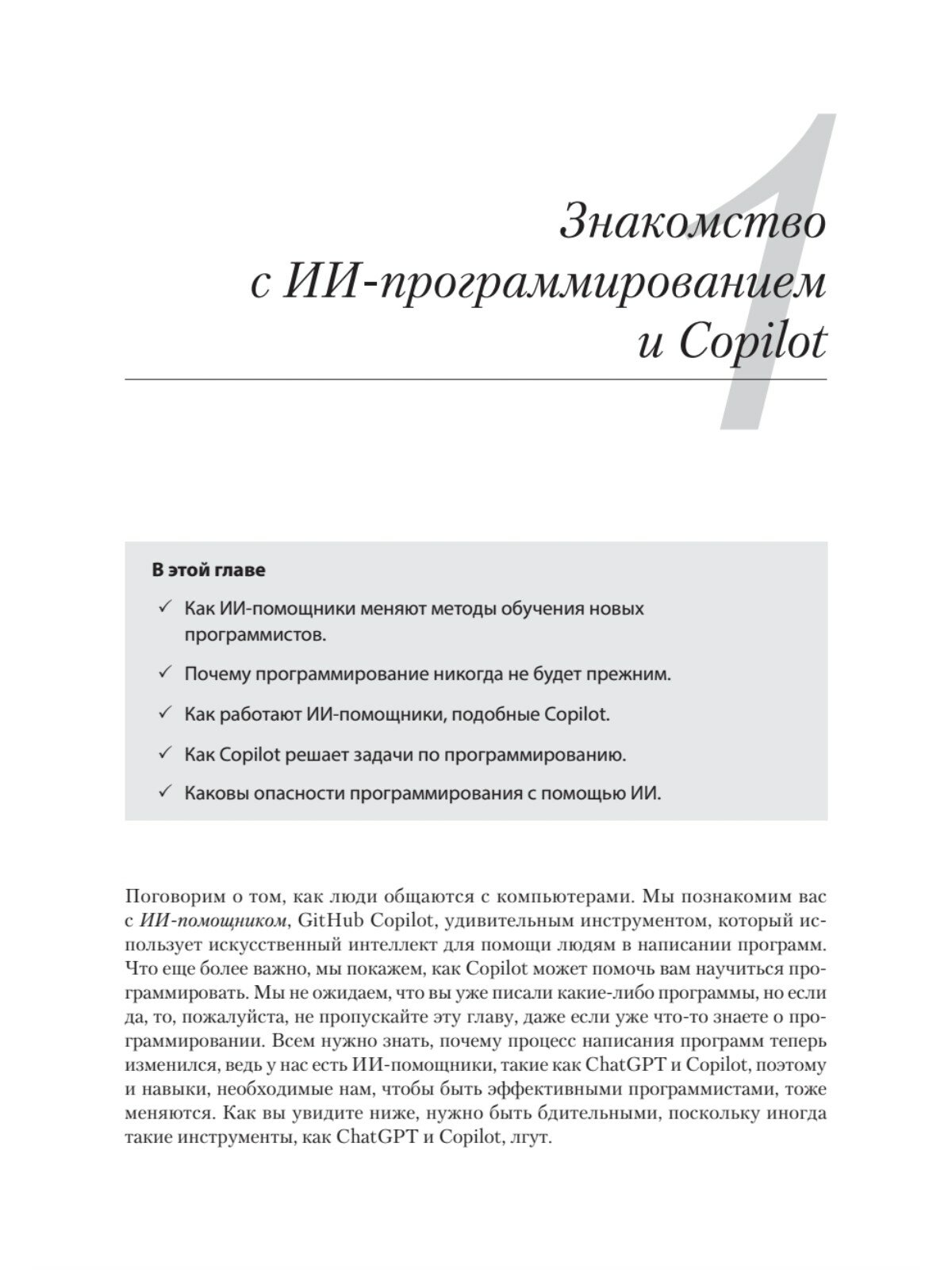 В наши дни люди пишут компьютерные программы совсем не так, как раньше. Используя GitHub Copilot, можно простым языком описать, что должна делать программа, а искусственный интеллект тут же сгенерирует ее.Узнайте, как создавать и улучшать программы на Python с помощью ИИ, даже если прежде вы не написали ни строчки компьютерного кода. Сэкономьте время на рутинном программировании и воспользуйтесь услугами ИИ, способного мгновенно воплотить ваши идеи в жизнь. Заодно выучите Python!5 причин прочитать:Узнаете, как составить запрос, чтобы получить рабочий код.Как улучшить код вручную и с помощью ИИ.Как тестировать свои программы с помощью ИИ.Как переложить рутинные задачи на ИИ.Заодно выучите Python!