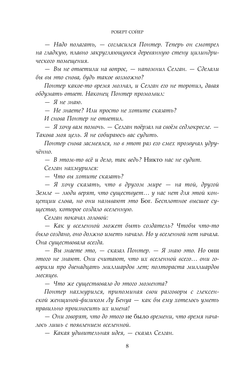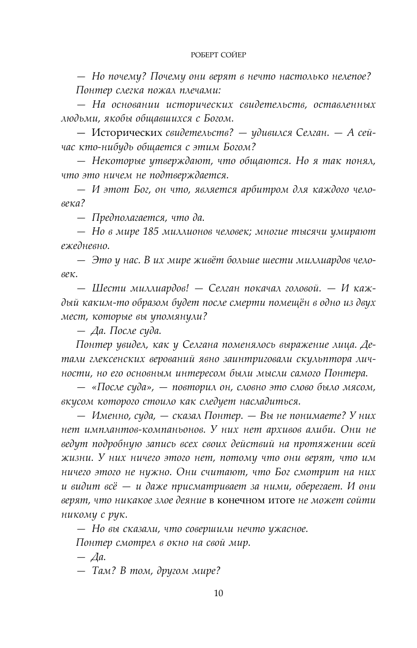 «Самая главная задача научной фантастики — показать иное. Помочь представить странное и увидеть знакомое в чужих образах. Никто не делает это лучше, чем Роберт Сойер». — Дэвид Брин