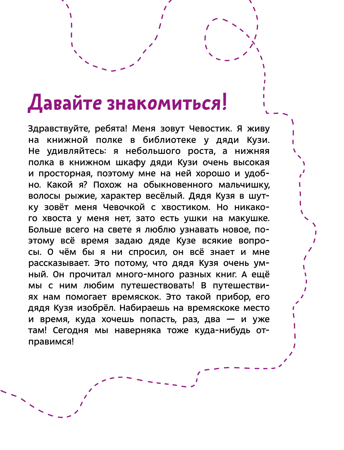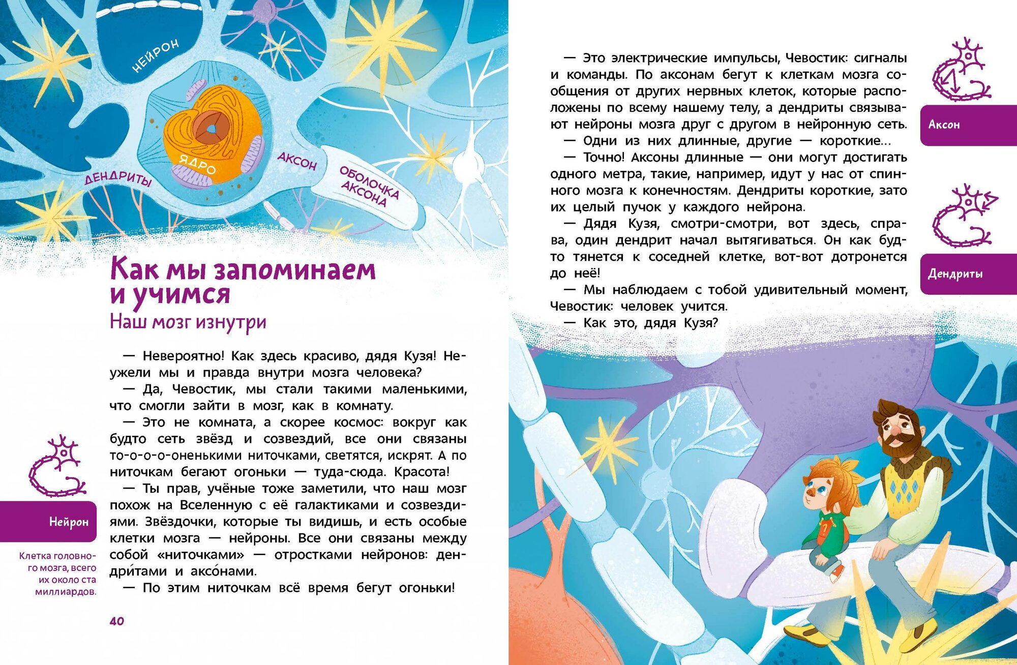 Новая энциклопедия с Чевостиком про мозг человека! Где в организме человека расположен главный компьютер, который всем управляет? Как мозг получает и передаёт информацию в органы и системы? Что делает мозг, когда человек спит? Откуда в голове электричество? Чем питается мозг? В новой энциклопедии Чевостик и дядя Кузя отправятся в необычное путешествие и выяснят, как работает человеческий мозг, из каких клеток он состоит, как контролирует весь организм, что ему в этом помогает, какие области мозга отвечают за важные функции и многое другое. Отправляйся в новое путешествие с любимыми героями, и ты узнаешь такое, что даже и не мог себе вообразить! Кто такой Чевостик? Чевостик симпатичный герой из известного аудиопроекта. Сегодня ребята знают его по энциклопедиям. В серии продолжают выходить книги, которые объясняют ребенку устройство мира. Дети гораздо лучше воспринимают информацию, когда о мире им рассказывает какой-нибудь сказочный персонаж. Именно поэтому девчонки и мальчишки так любят подобные энциклопедии. Чевостик вместе с дядей Кузей совершает удивительные путешествия в мир наук: физики, химии, астрономии, анатомии, геологии и других. Он рассказывает детям о великих географических открытиях, покорении космоса и волшебных химических превращениях. Для кого эта книга Для любознательных детей от 6 лет Для всех-всех фанатов Чевостика Для дошкольников и младших школьников