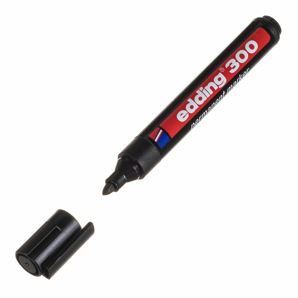 **Маркер перманентный Edding E-300 чёрный** предназначен для нанесения надписей и разметки на большинство типов поверхностей (сталь, картон, металл, керамика, стекло, пластик). Используется на производстве и в быту. Создает стойкую линию толщиной от 1 до 3 мм. Длина маркера — 20 см. Корпус изготовлен из пластика. Маркер имеет конический наконечник. Страна производства — Германия.