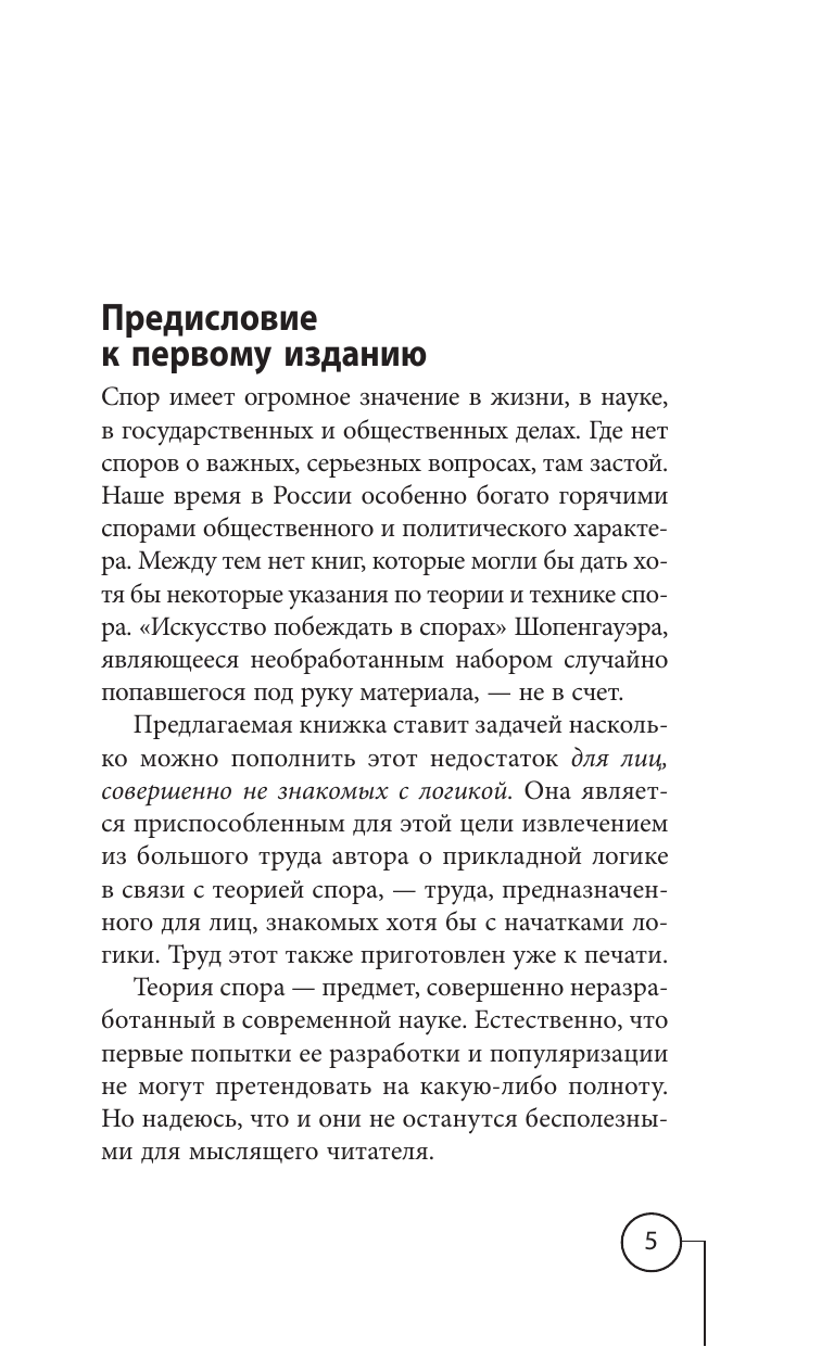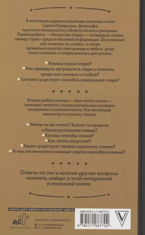 В настоящее издание вошли две знаковые книги Сергея Поварнина, философа, крупного специалиста в области логики и риторики. Первая работа — «Искусство спора» — посвящена чтению «между строк» средств массовой информации. Она покажет, как замечать их уловки, а также правильно излагать свои доводы в любых, даже самых сложных и неоднозначных дискуссиях. Каковы корни спора? Как приводить аргументы в споре и отличать среди них сильные и слабые? Сколько существует способов завершения спора? Вторая работа автора — «Как читать книги» — знакомит читателя с психологическими основами восприятия и усвоения текста. Это настоящий навигатор по умному чтению. Умеем ли мы читать? Бывает ли вредное и безыскусственное чтение? Каковы способы чтения? Как читать искусство? Какие существуют помехи хорошему чтению? В чем заключаются основные задачи самообразования? Ответы на эти и многие другие вопросы читатель найдет в этой интересной и полезной книге.
