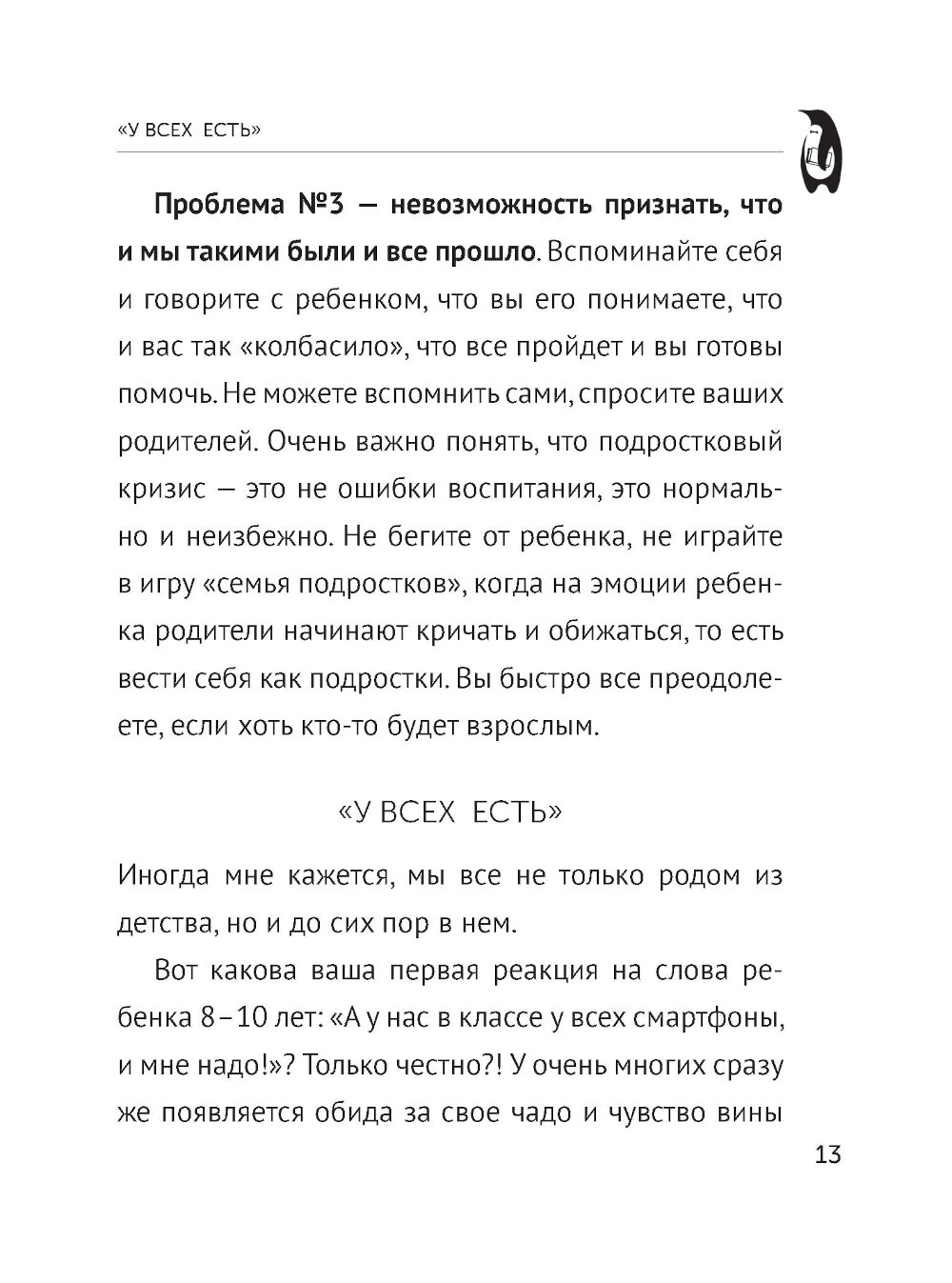 Подростковый возраст — непредсказуемый и сложный период как для родителей, так и для самого ребенка. Изменяются его увлечения, характер, меняется гормональный фон, растет информационный поток… Ребенок в этом возрасте как никогда нуждается в поддержке со стороны взрослых, поэтому мудрый и своевременный родительский совет может стать стартовой площадкой для отношений, которые сохранятся на всю жизнь. С помощью простого и доступного языка автор рассказывает о физических и эмоциональных изменениях, связанных с этим периодом. Он описывает сложности, с которыми многие подростки сталкиваются, такие как конфликты со сверстниками, растущая независимость от родителей, стресс и тревога, связанные с школой и успехом в учебе. В книге Лариса Суркова поднимает сложные для родителей вопросы: как найти общий язык с подростком, который испытывает сложности в общении, в управлении эмоциями, преодолении непредвиденных трудностей и как оградить его от дурного влияния, а также многое другое.