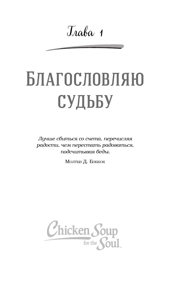 В детстве, когда вы болели, ваша бабушка давала вам куриный бульон. Сегодня питание и забота нужны вашей душе. Маленькие истории из «Куриного бульона» исцелят душевные раны и укрепят дух, дадут вашим мечтам новые крылья и откроют секрет самого большого счастья — счастья делиться и любить.