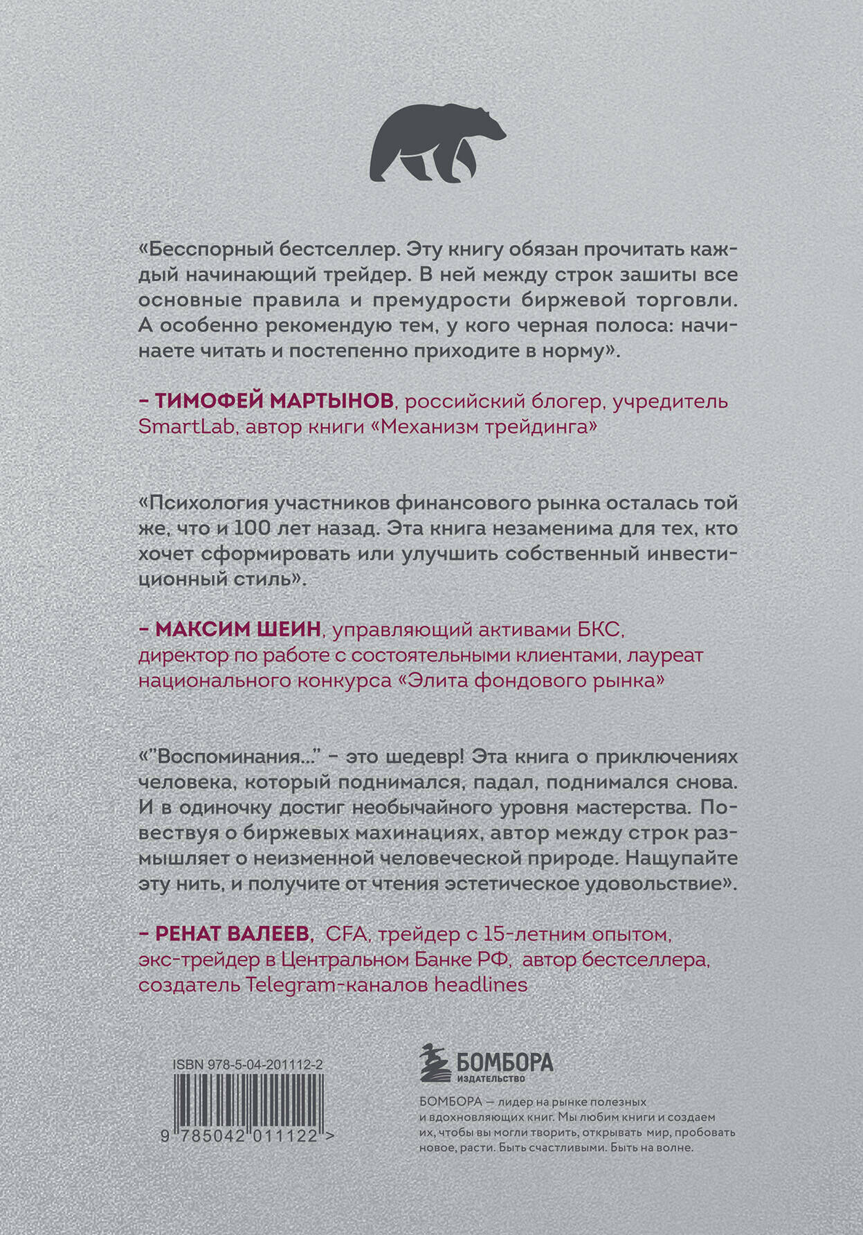 «"Воспоминания " — это шедевр! Спросите об этом любого ветерана рынков. Эта книга об игре! О приключениях человека, который поднимался, падал, поднимался снова. В одиночку благодаря своей выдержке достиг необычайного уровня мастерства и покорил грандиозные вершины. При этом он был таким же человеком, как и мы. Повествуя о биржевых махинациях, автор между строк размышляет о неизменной человеческой природе. Нащупайте эту нить, и получите от чтения подлинное эстетическое удовольствие». — Ренат Валеев, CFA, трейдер с 15-летним опытом, экс-трейдер в Центральном Банке РФ, автор бестселлера, создатель Telegram-каналов headlines